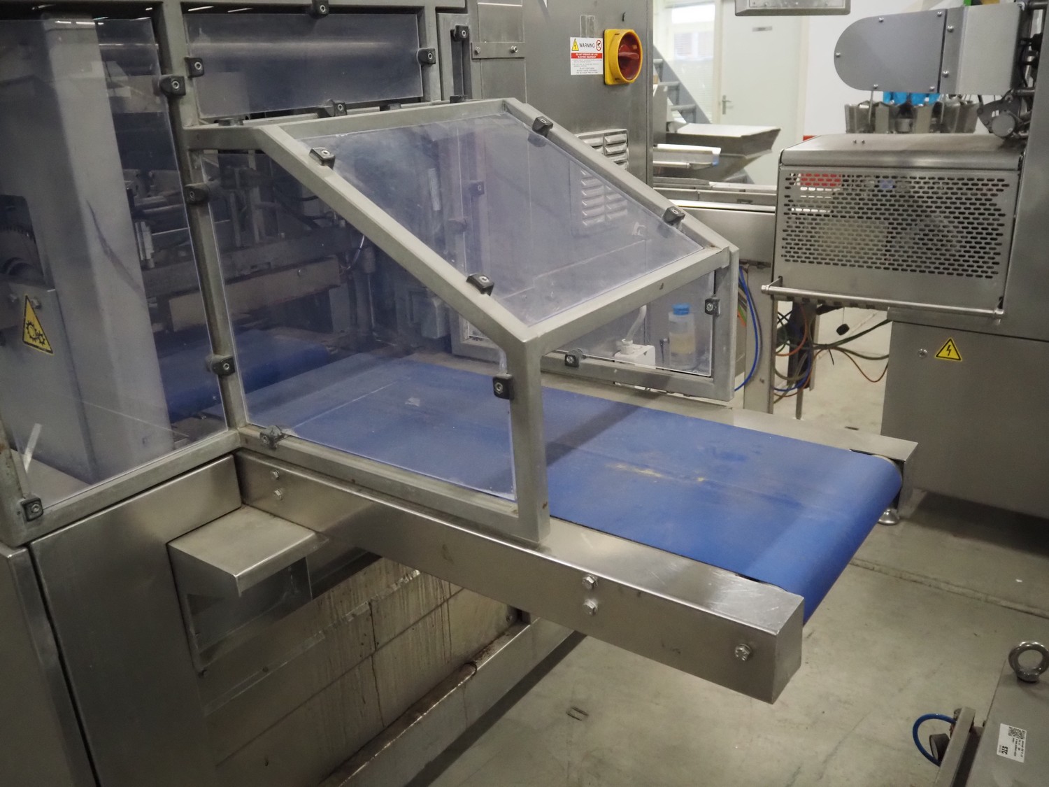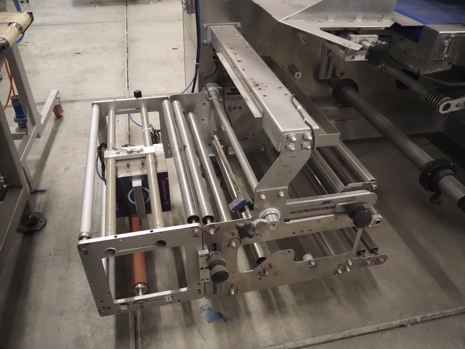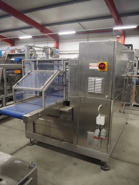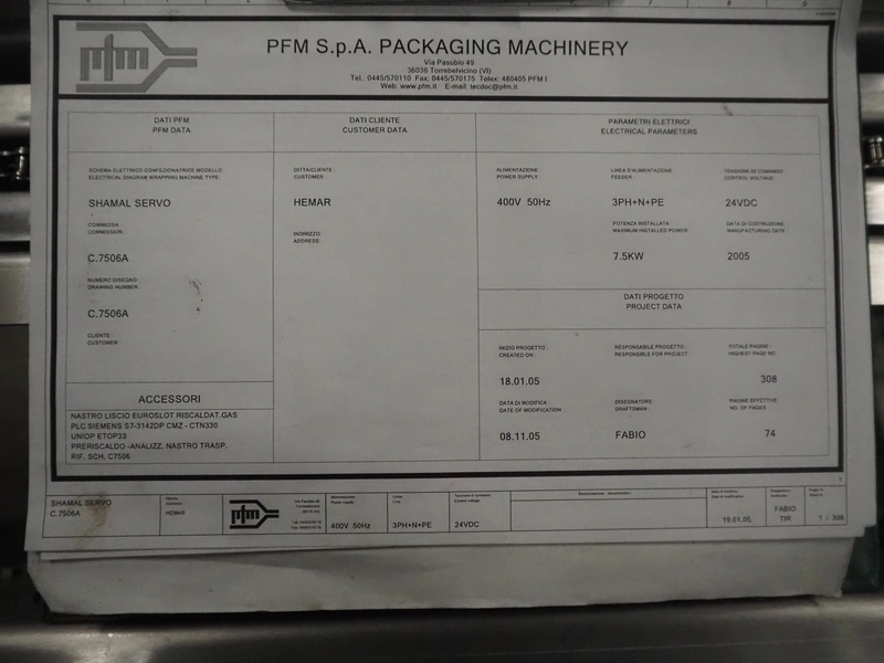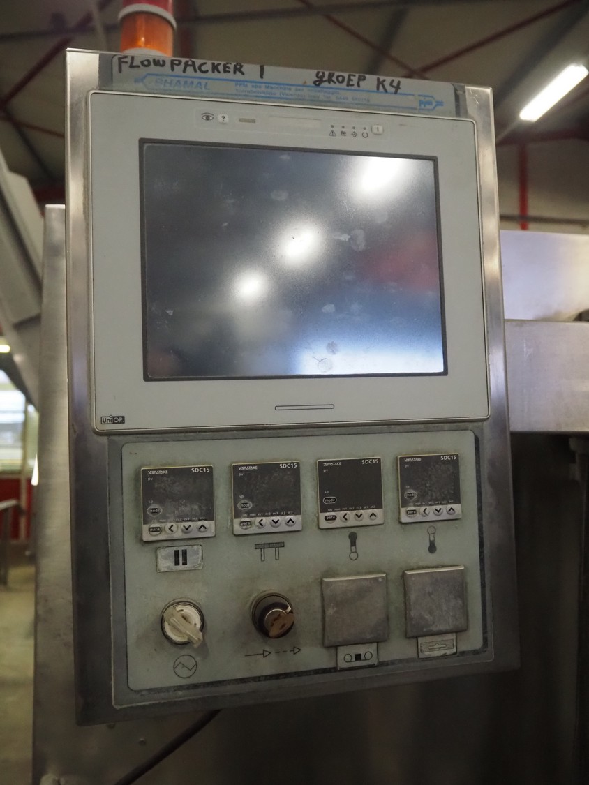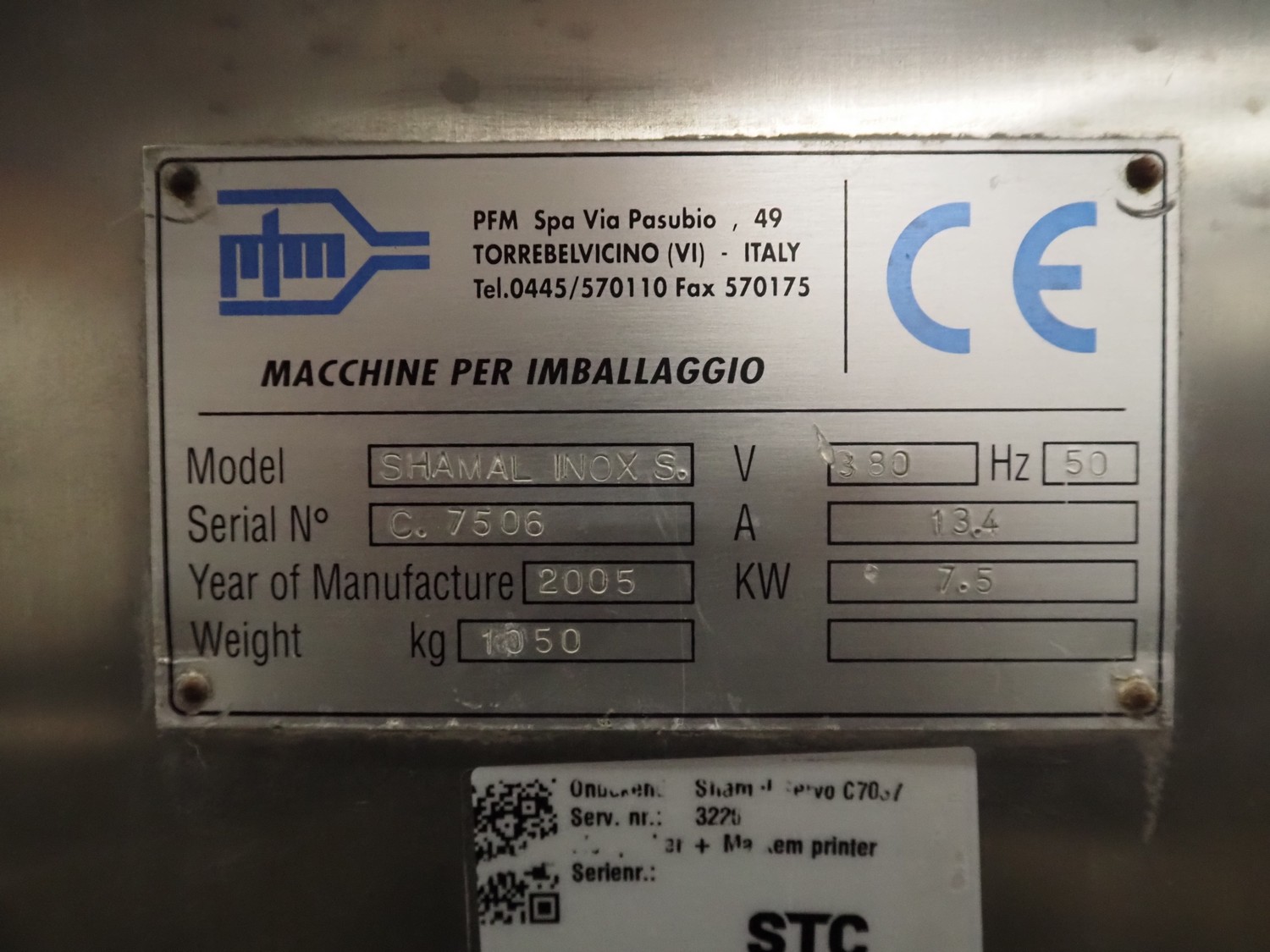 PFM flowpacker, model: SHAMAL INOX S, serial number: C. 7506, year of construction: 2005, 380 V, 50 Hz, 13.4 A, 7.5 kW, weight: 1050 kg, plastic belt, belt width: 350 mm, seal length: 350 mm, total dimensions: 3300 mm x 1500 mm x 1800 mm.