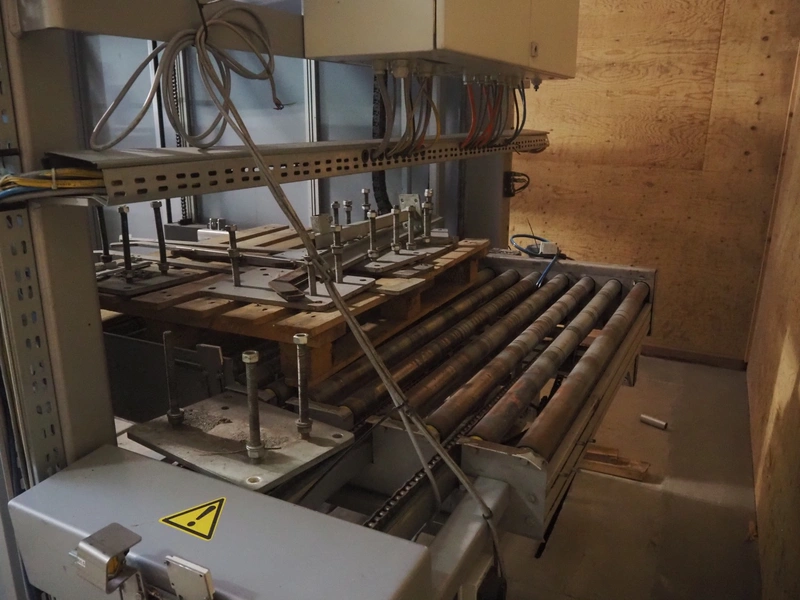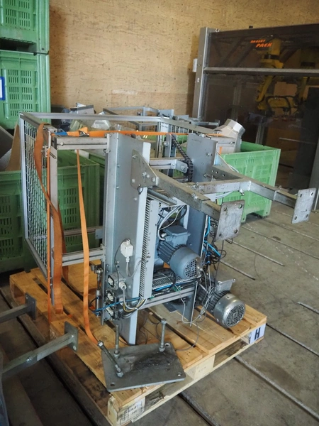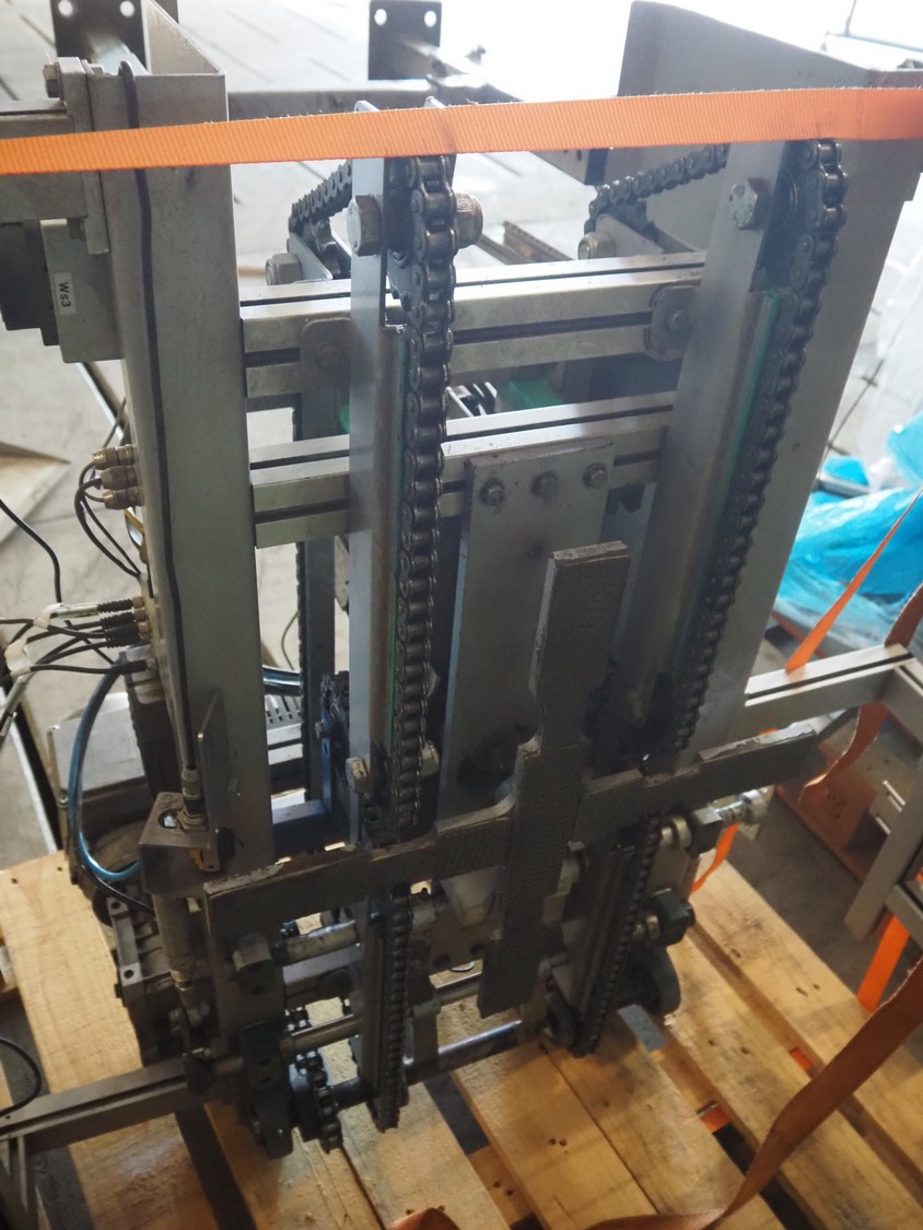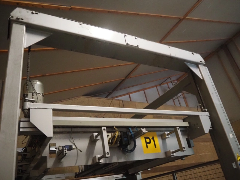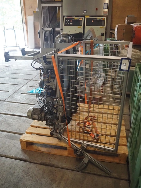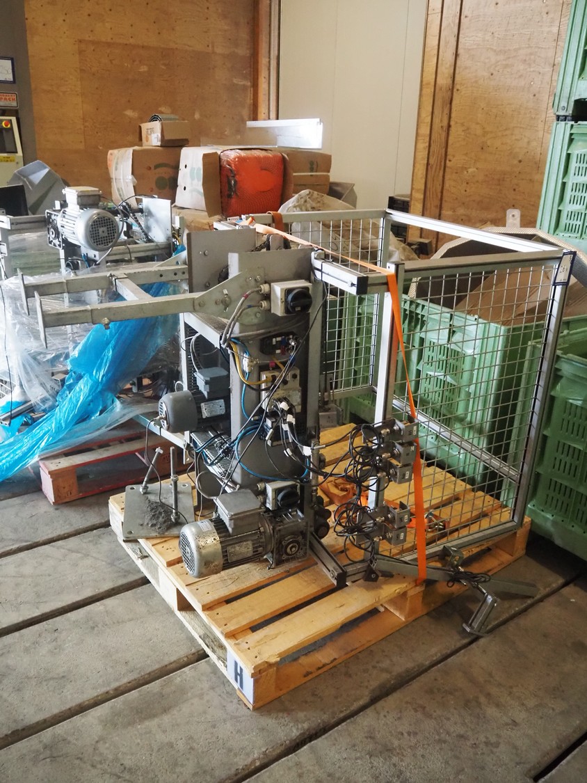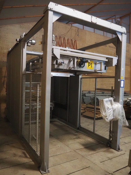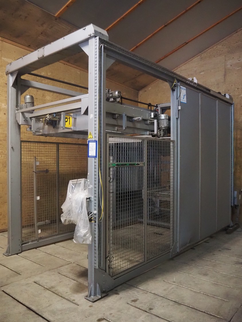 Viscon palletizer, s/s rollers, roller width: 1270 mm, total dimensions: 5300 mm x 2400 mm x 3200 mm. Including turning device, steel chain belt, belt width: 250 mm, dimensions turning device: 1450 mm x 950 mm x 1150 mm.