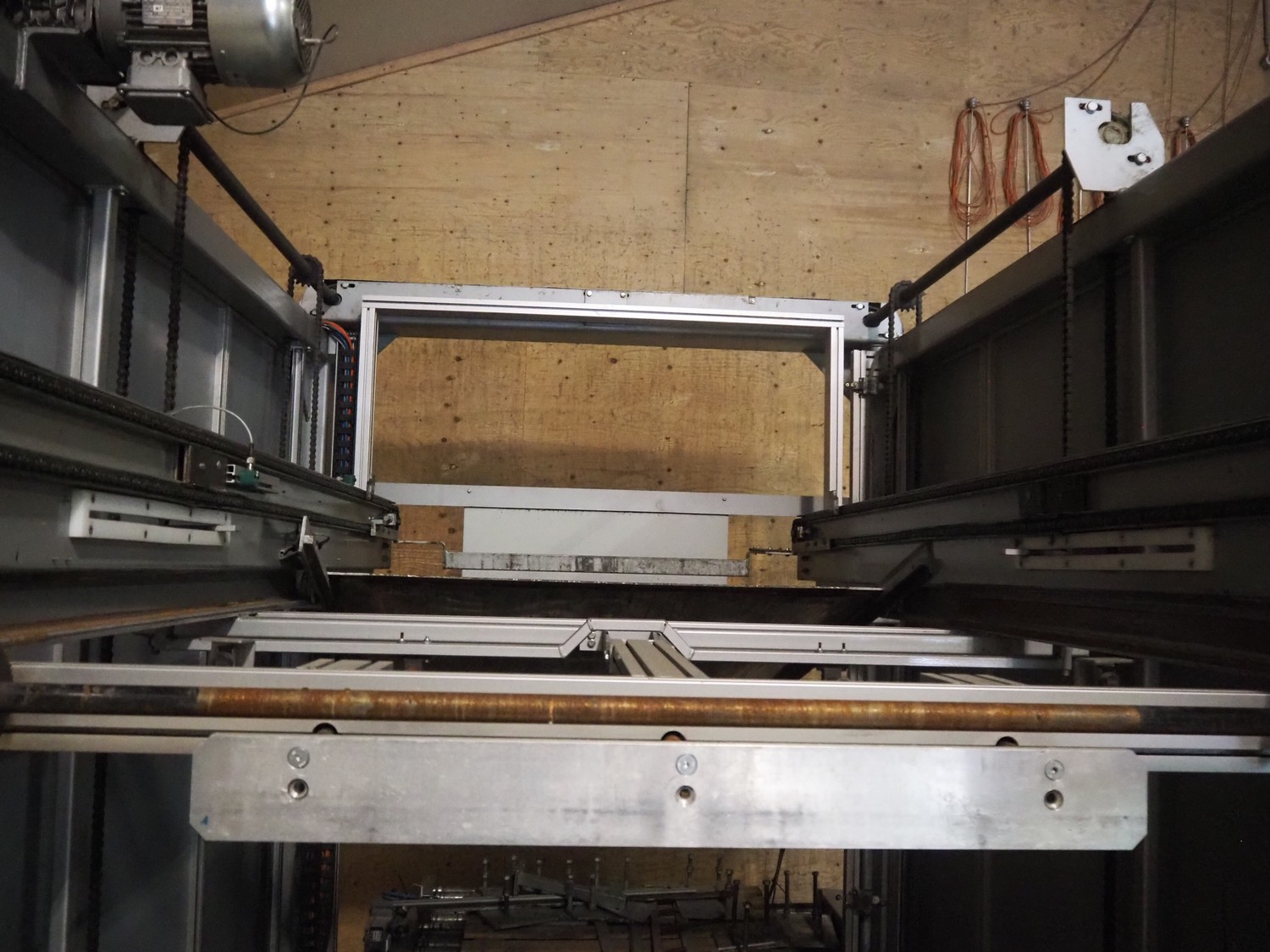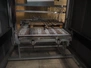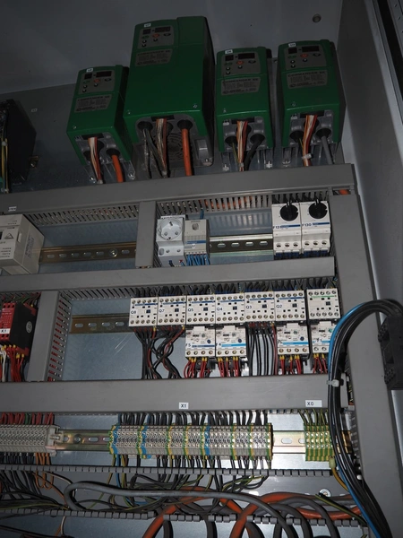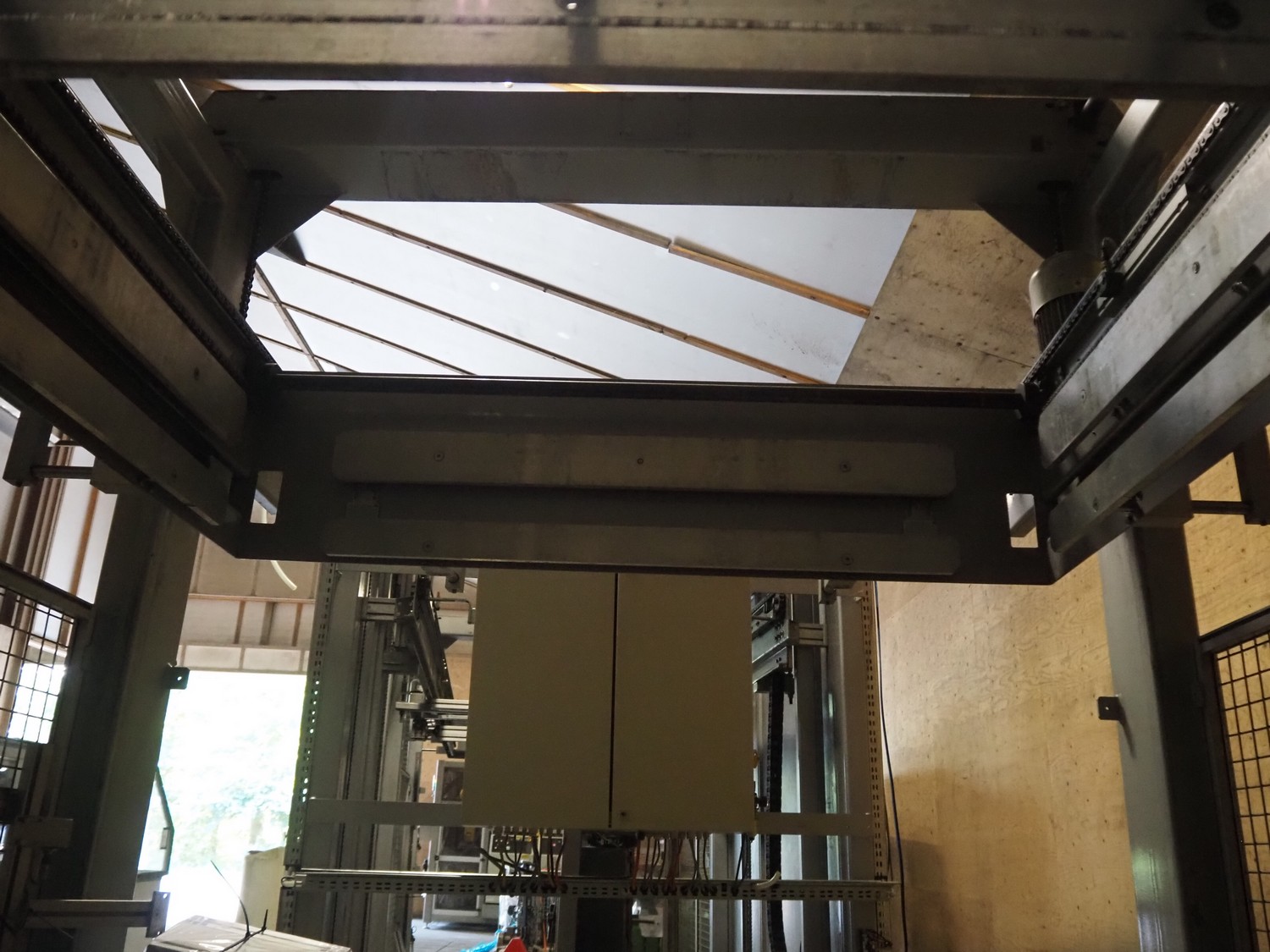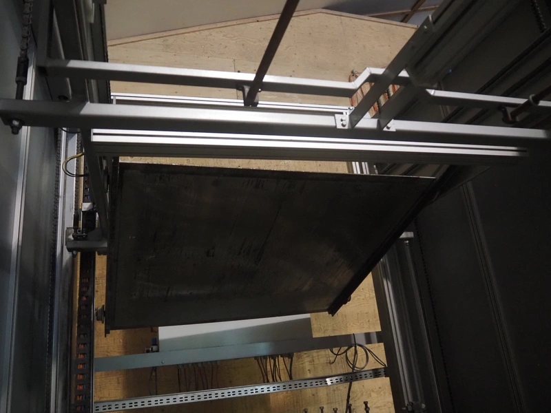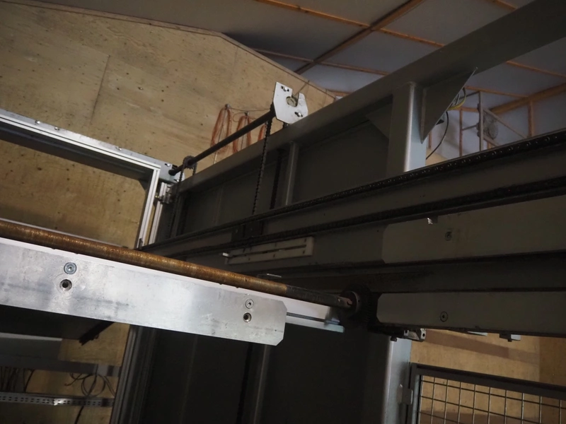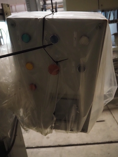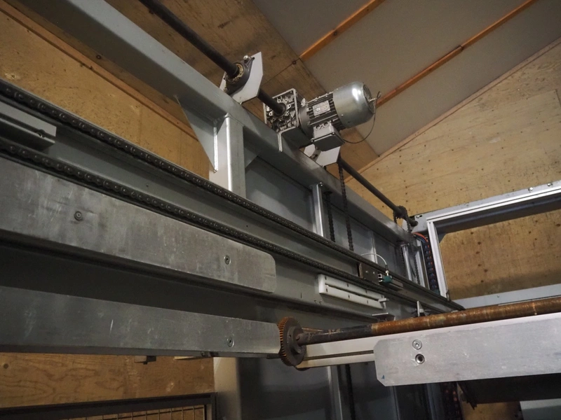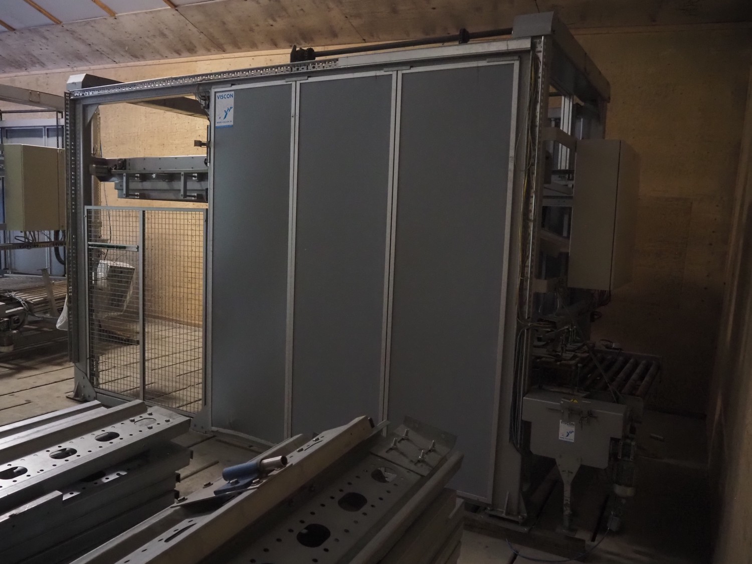 Viscon palletizer, s/s rollers, roller width: 1270 mm, total dimensions: 5300 mm x 2400 mm x 3200 mm. Including turning device, steel chain belt, belt width: 250 mm, dimensions turning device: 1450 mm x 950 mm x 1150 mm.