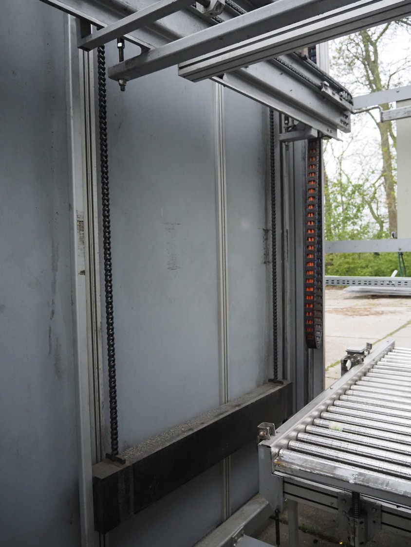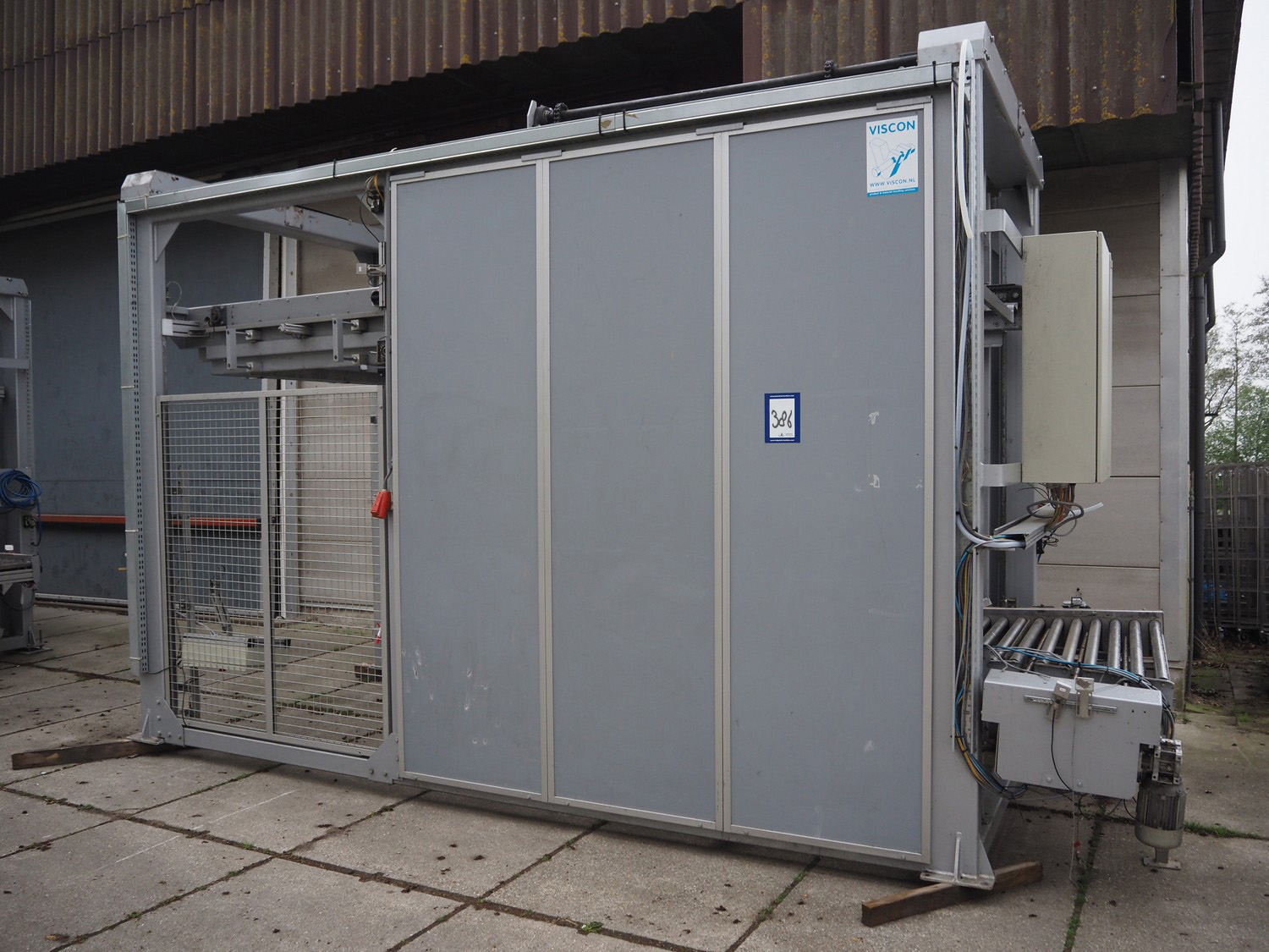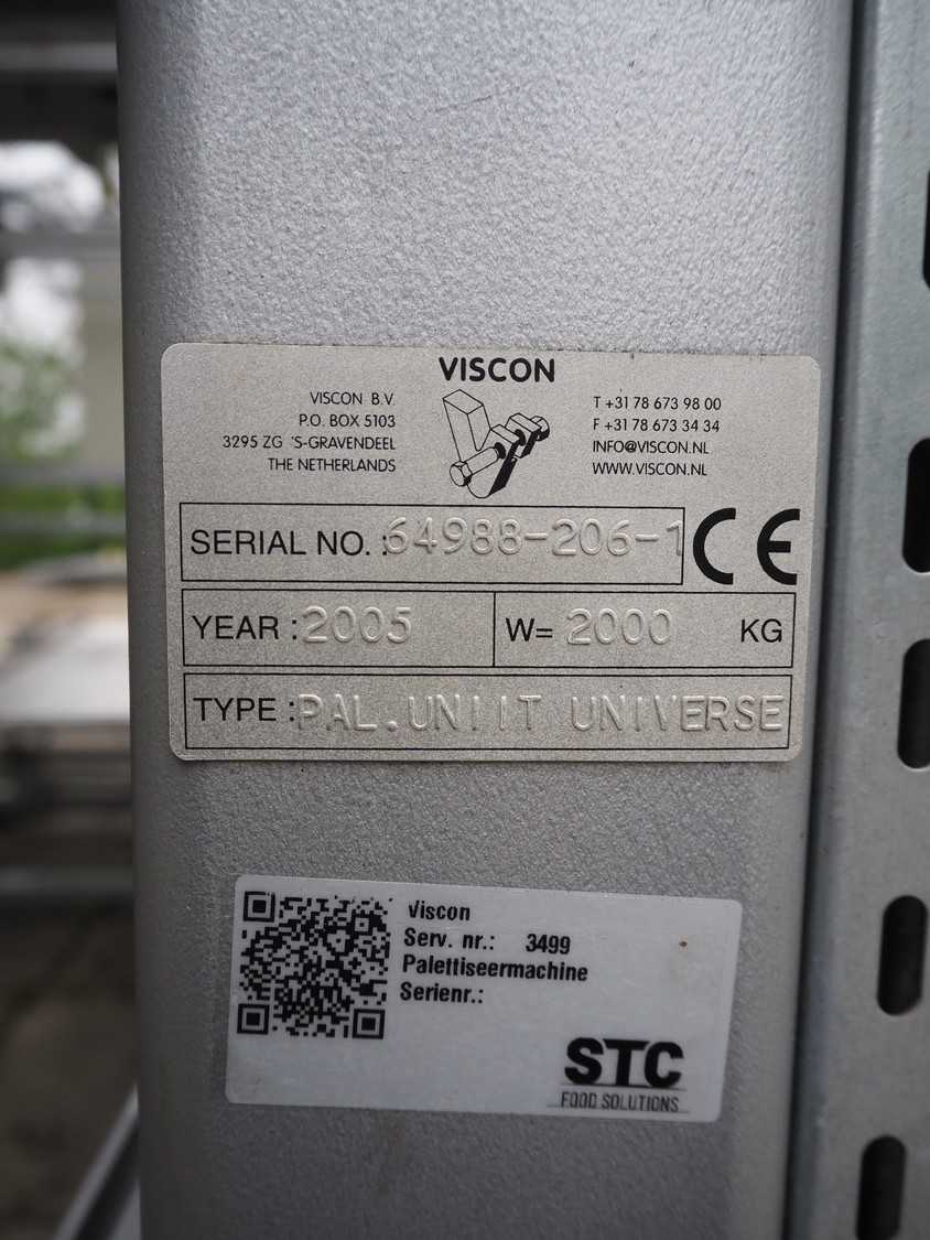 Viscon palletizer, type: PAL. UNI IT UNIVERSE, serial number: 64988-206-1, year of construction: 2005, weight: 2000 kg, s/s rollers, roller width: 1270 mm, total dimensions: 5300 mm x 2400 mm x 3200 mm. Including turning device, steel chain belt, belt width: 250 mm, dimensions turning device: 1450 mm x 950 mm x 1150 mm.