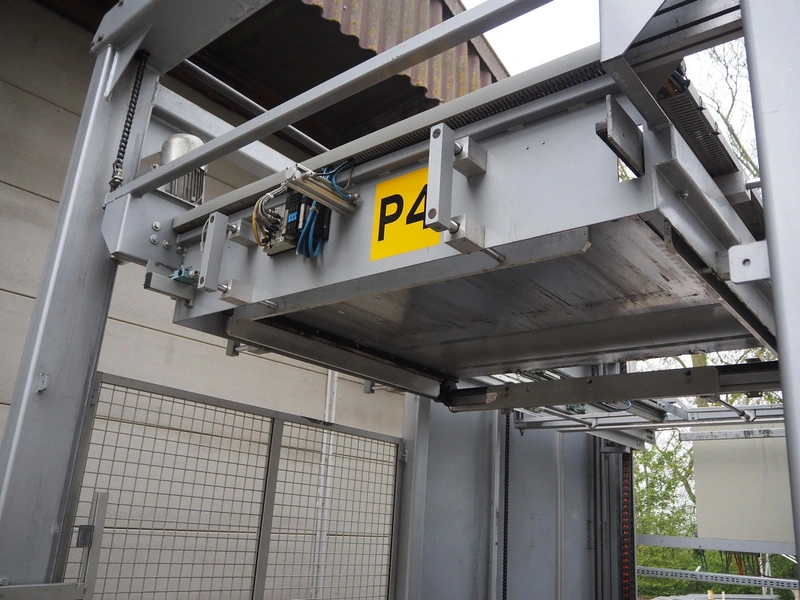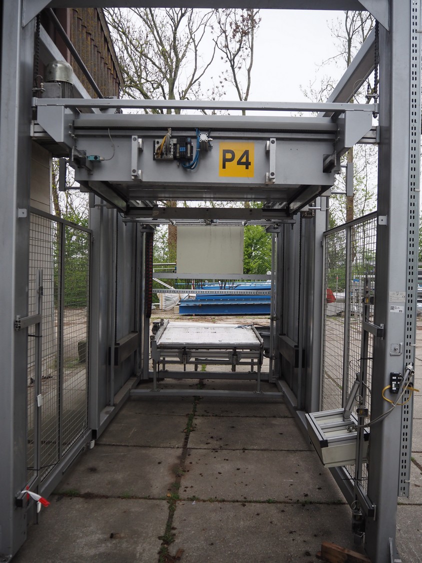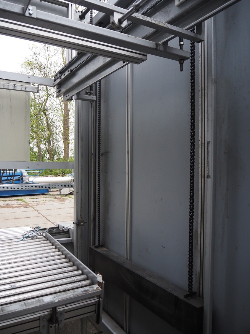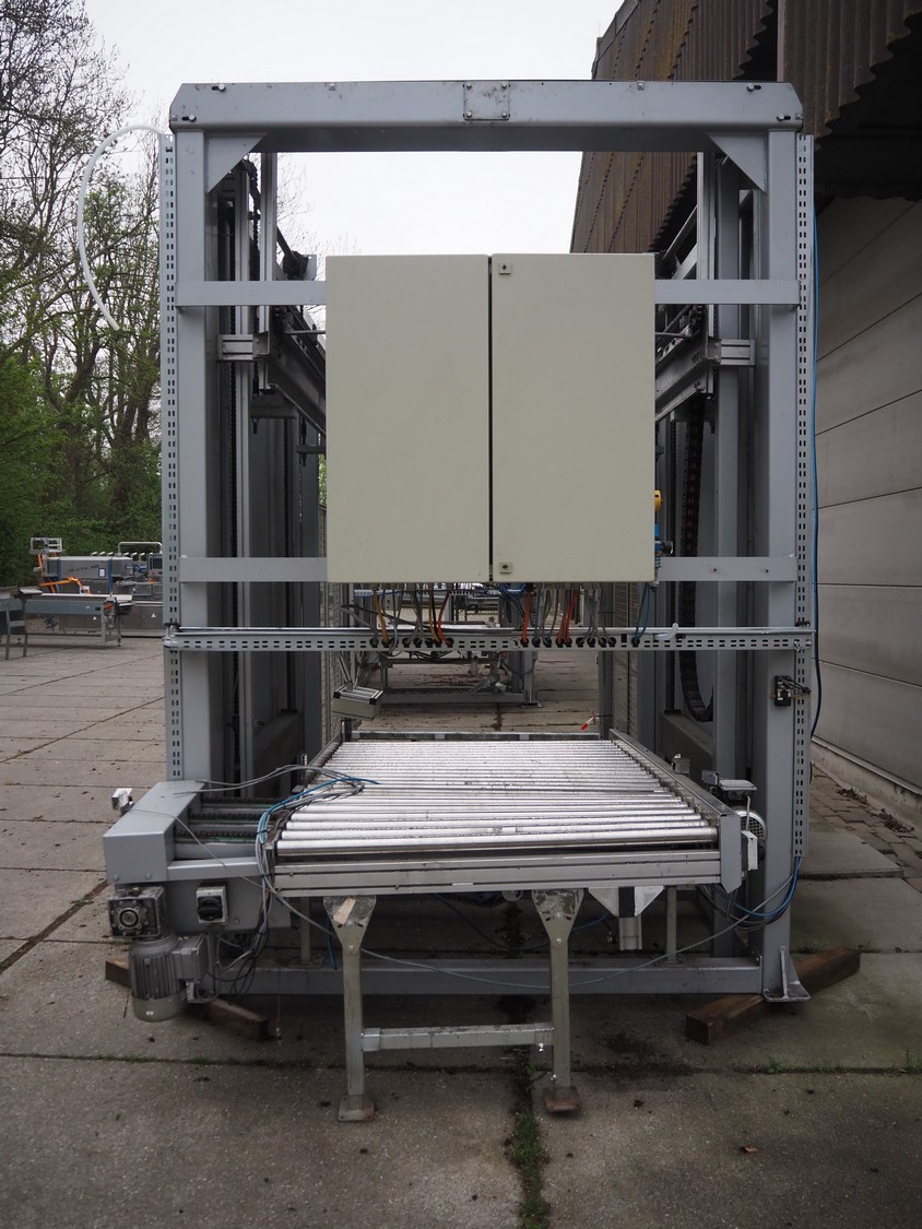 Viscon palletizer, type: PAL. UNI IT UNIVERSE, serial number: 64988-206-1, year of construction: 2005, weight: 2000 kg, s/s rollers, roller width: 1270 mm, total dimensions: 5300 mm x 2400 mm x 3200 mm. Including turning device, steel chain belt, belt width: 250 mm, dimensions turning device: 1450 mm x 950 mm x 1150 mm.