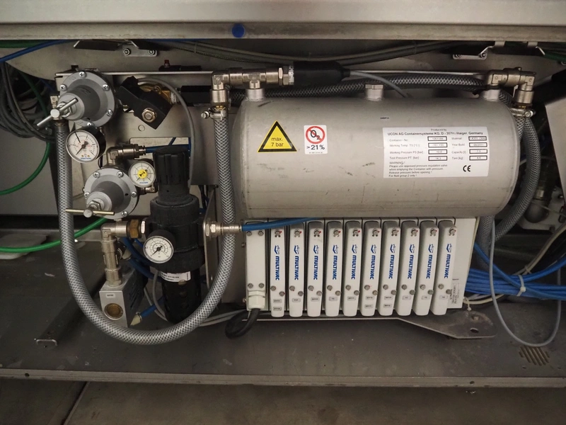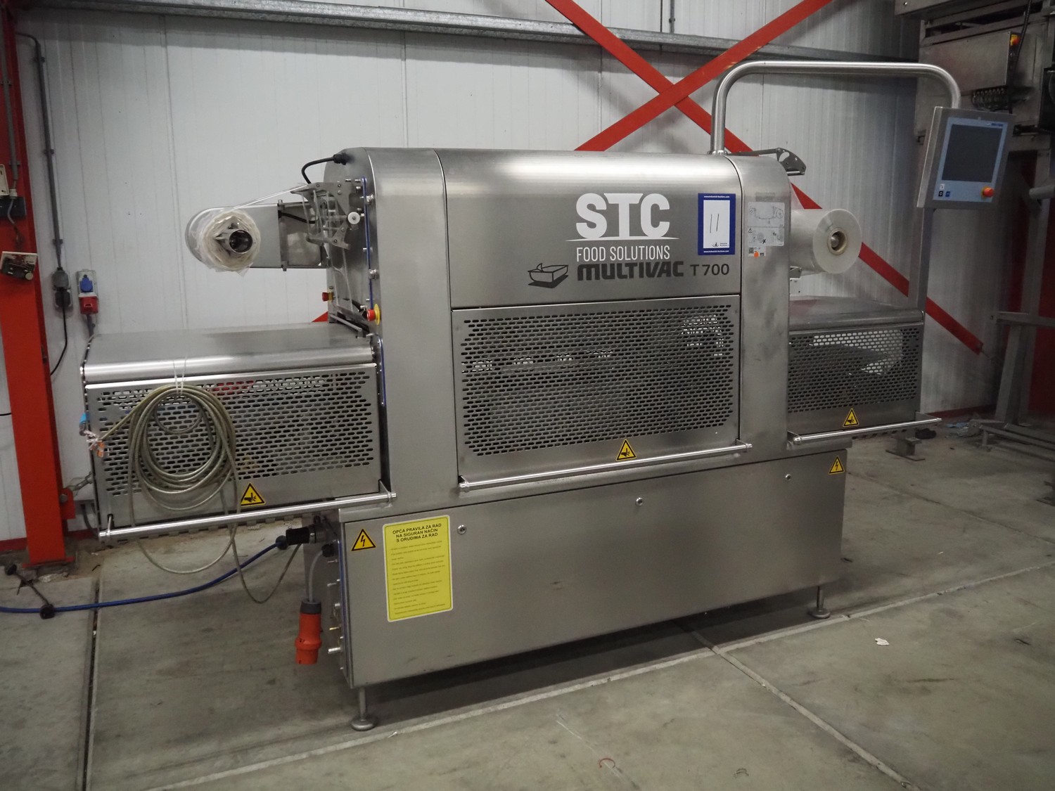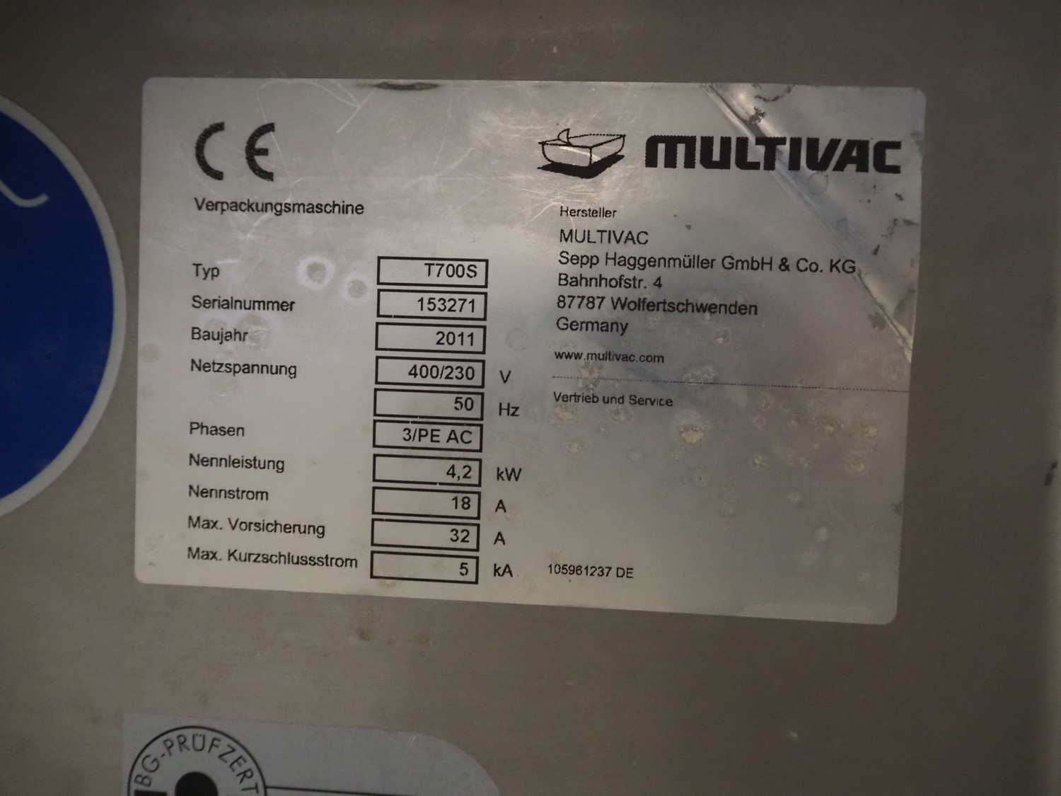 Multivac traysealer, type: T700S, serial number: 153271, year of construction: 2011, 400/230 V, 3 Ph, 50 Hz, 18/32 A, 4.2 kW, film width: 250 mm, plastic belt, belt width: 240 mm, dimensions dye: 175 mm x 120 mm, total dimensions: 2900 mm x 900 mm x 2050 mm. Technical condition unknown.