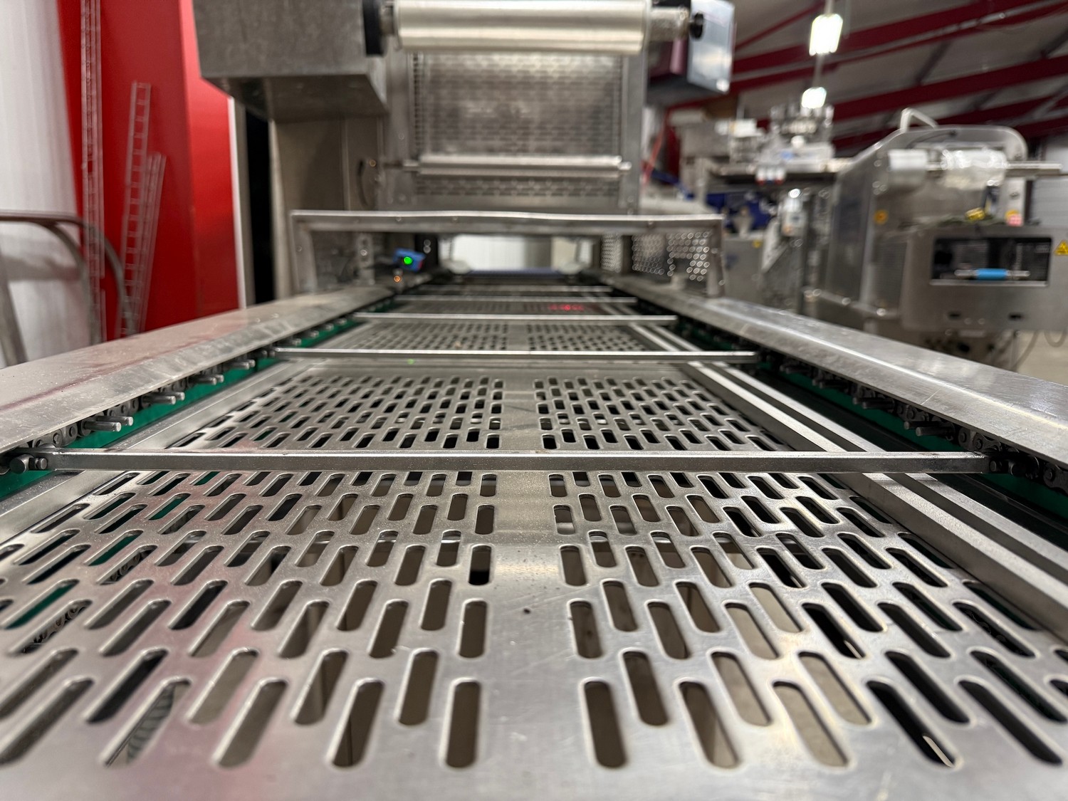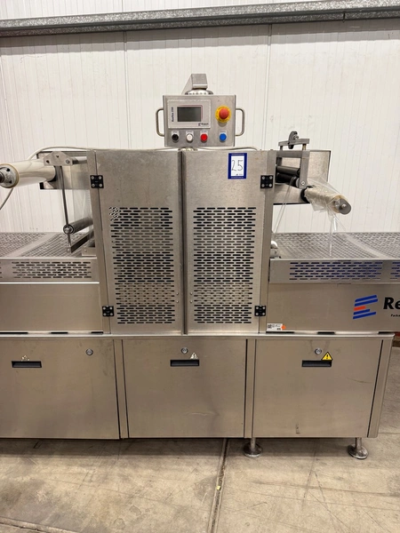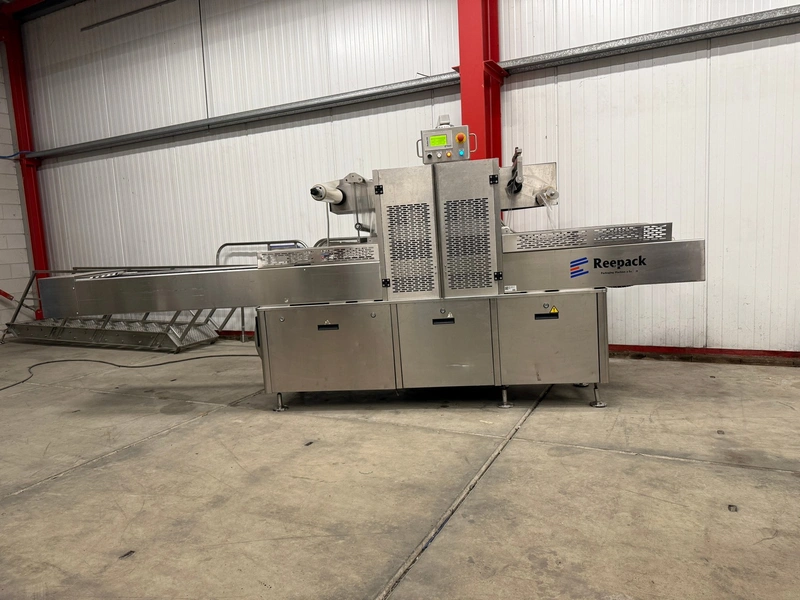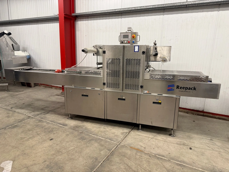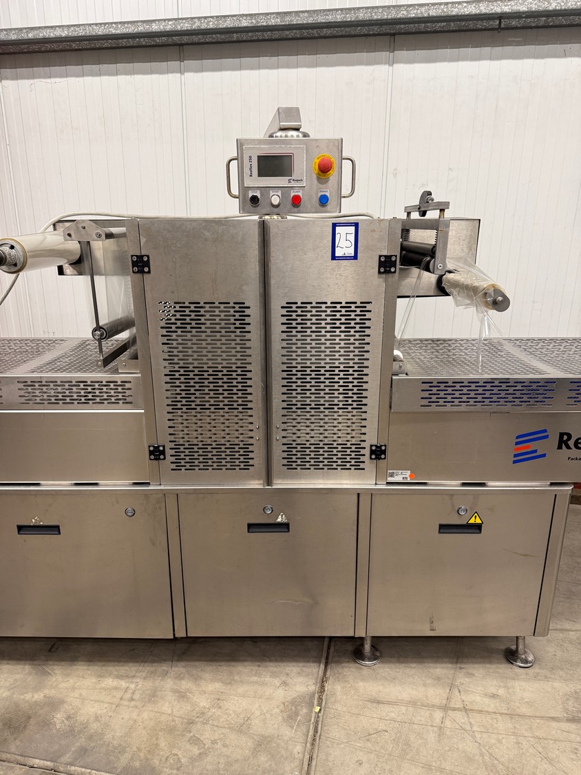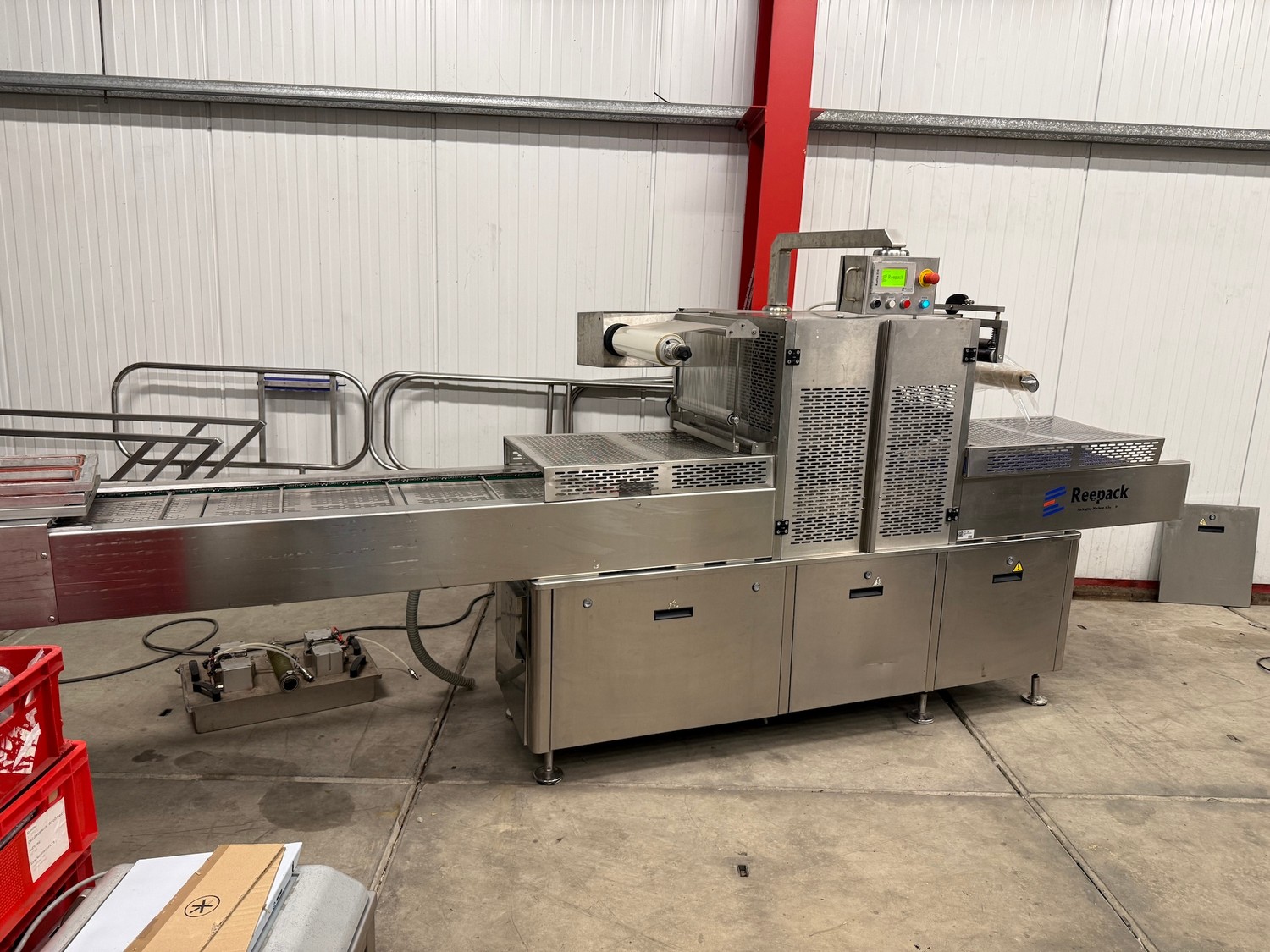 Reepack traysealer, model: Reeflex 250, serial number: 1111001, year of construction: 2011, 400 V, 3 Ph, 50 Hz, 21 A, film width: 420 mm, dimensions dye: (2x) 320 mm x 240 mm, plastic mesh outfeed belt, belt width: 400 mm, total dimensions: 4200 mm x 900 mm x 1850 mm.