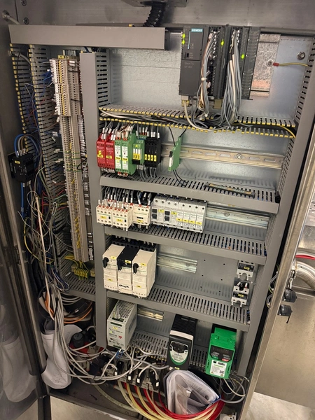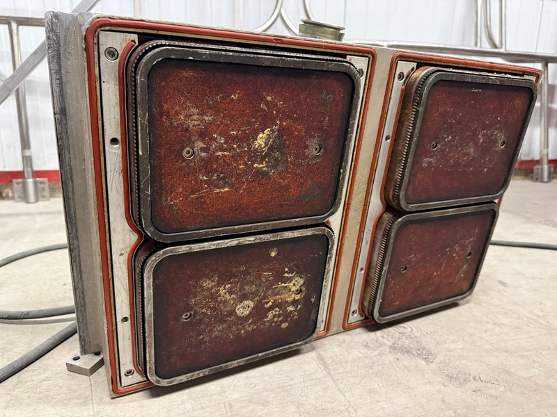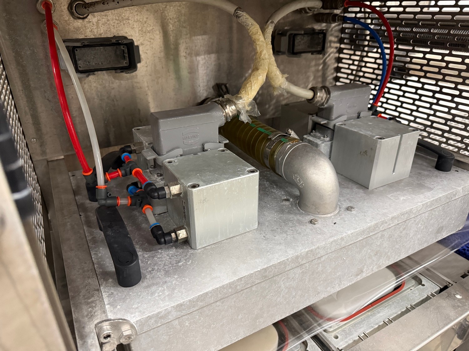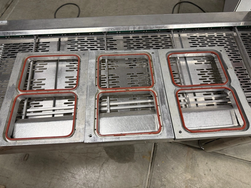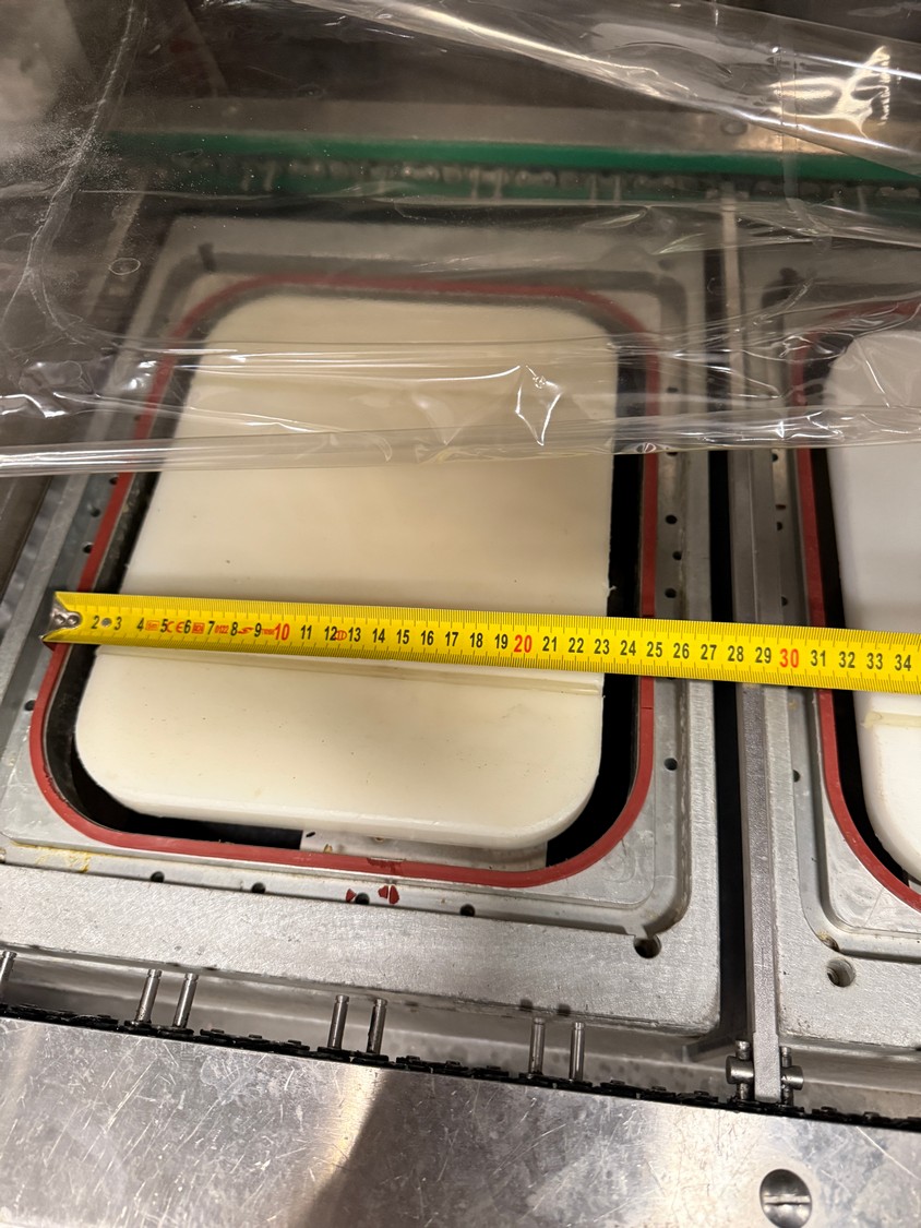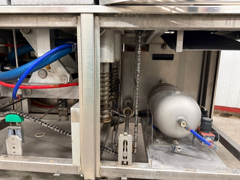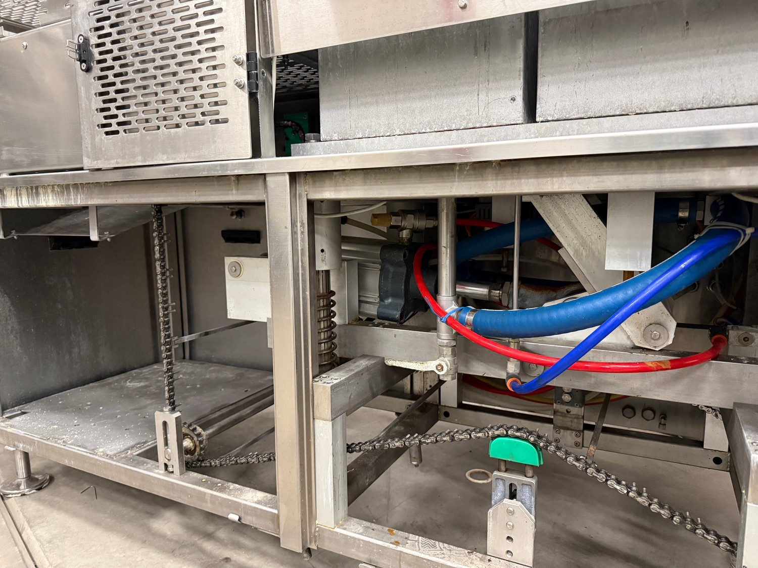 Reepack traysealer, model: Reeflex 250, serial number: 1111001, year of construction: 2011, 400 V, 3 Ph, 50 Hz, 21 A, film width: 420 mm, dimensions dye: (2x) 320 mm x 240 mm, plastic mesh outfeed belt, belt width: 400 mm, total dimensions: 4200 mm x 900 mm x 1850 mm.