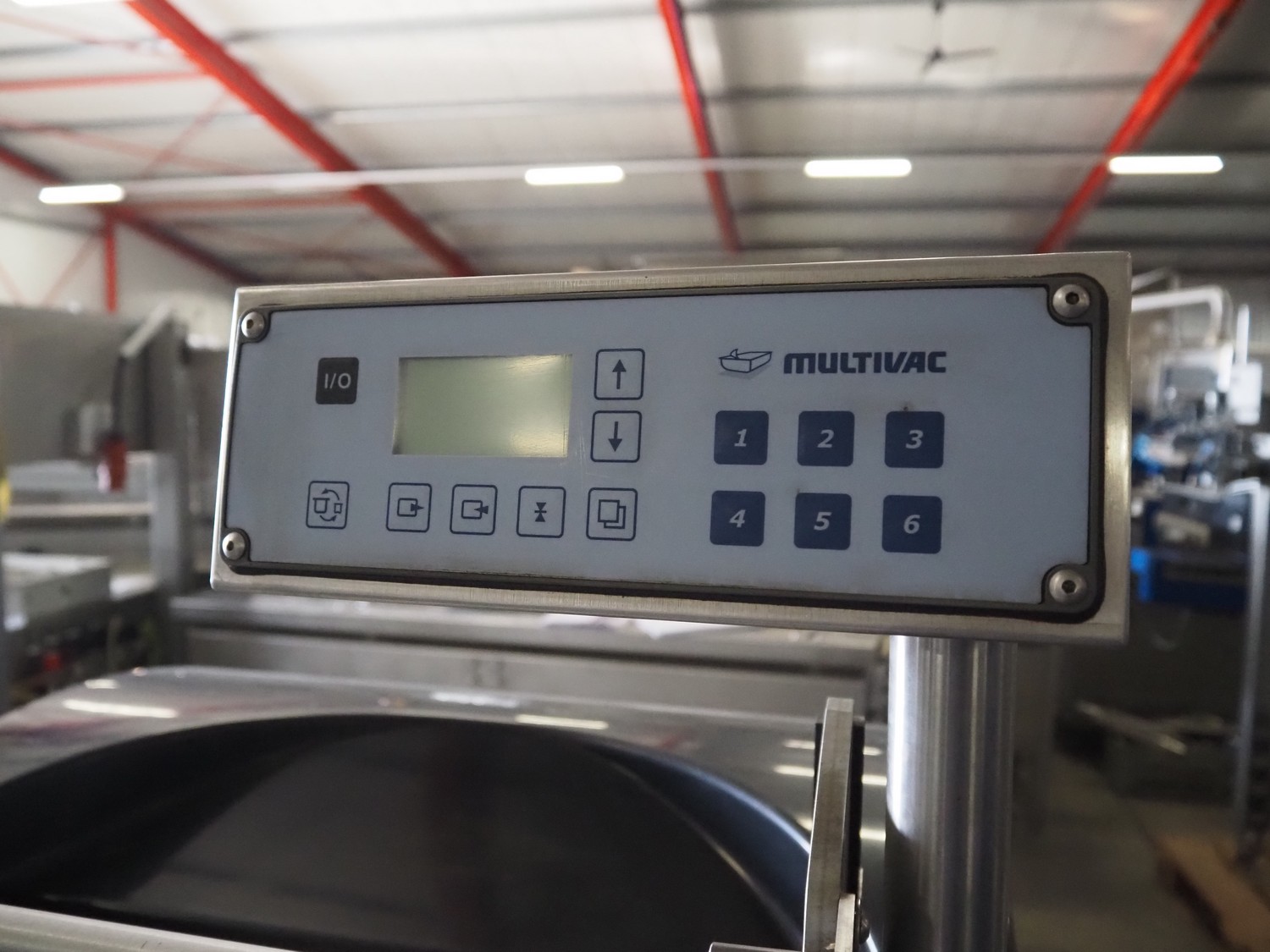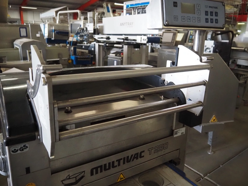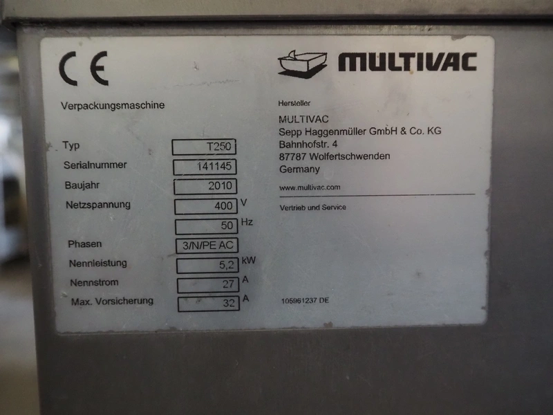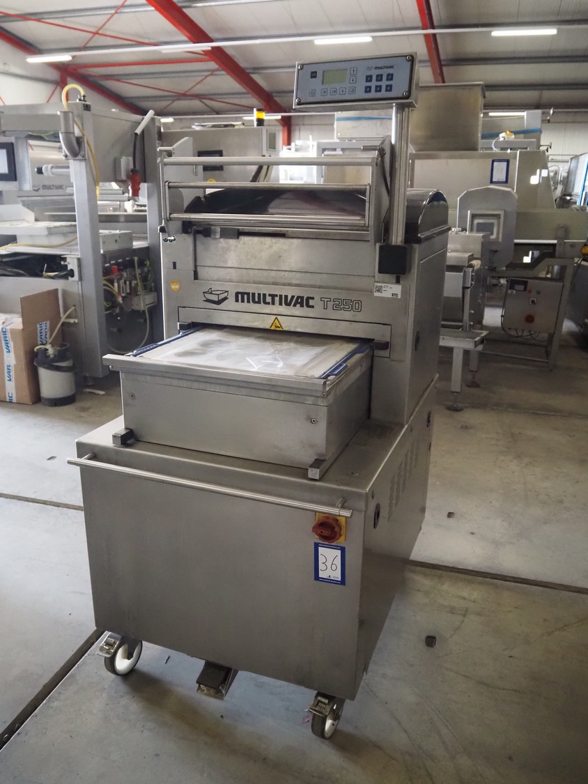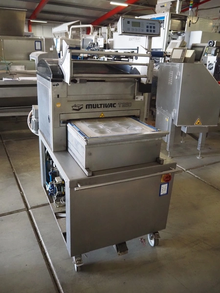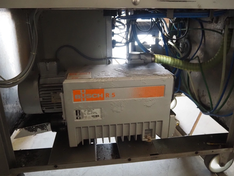Multivac mobile traysealer, type: T250, serial number: 141145, year of construction: 2010, 400 V, 3 Ph, 50 Hz, 27/32 A, 5.2 kW, dimensions dye: (9x) Ø 90 mm, Busch vacuum pump, type: RA 0100 F 503, capacity: 100 m³ per hour, total dimensions: 1350 mm x 800 mm x 1650 mm. One cover is missing.
