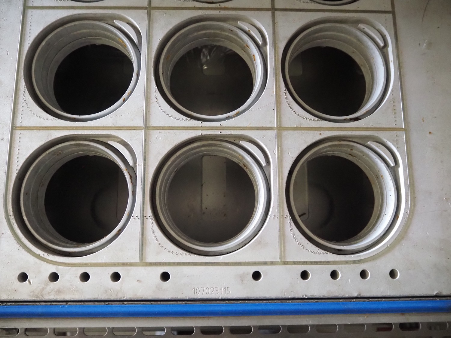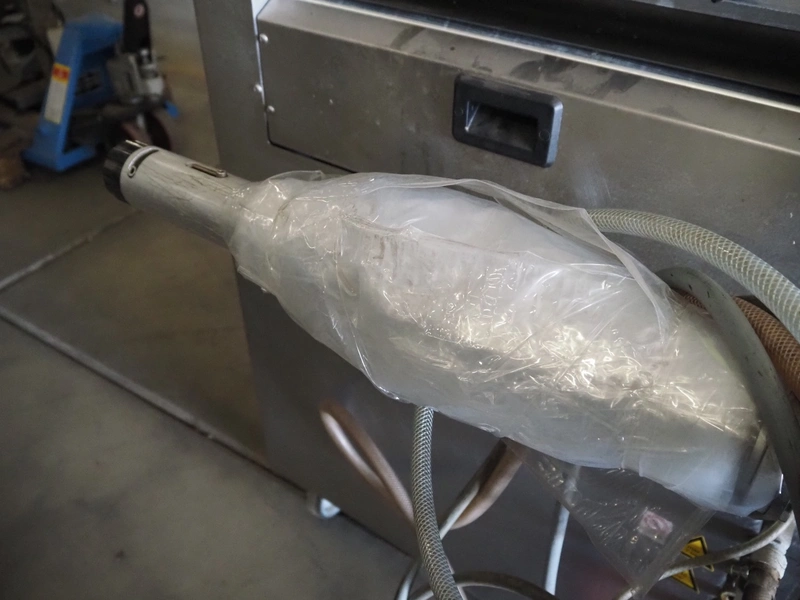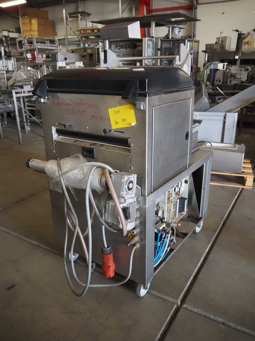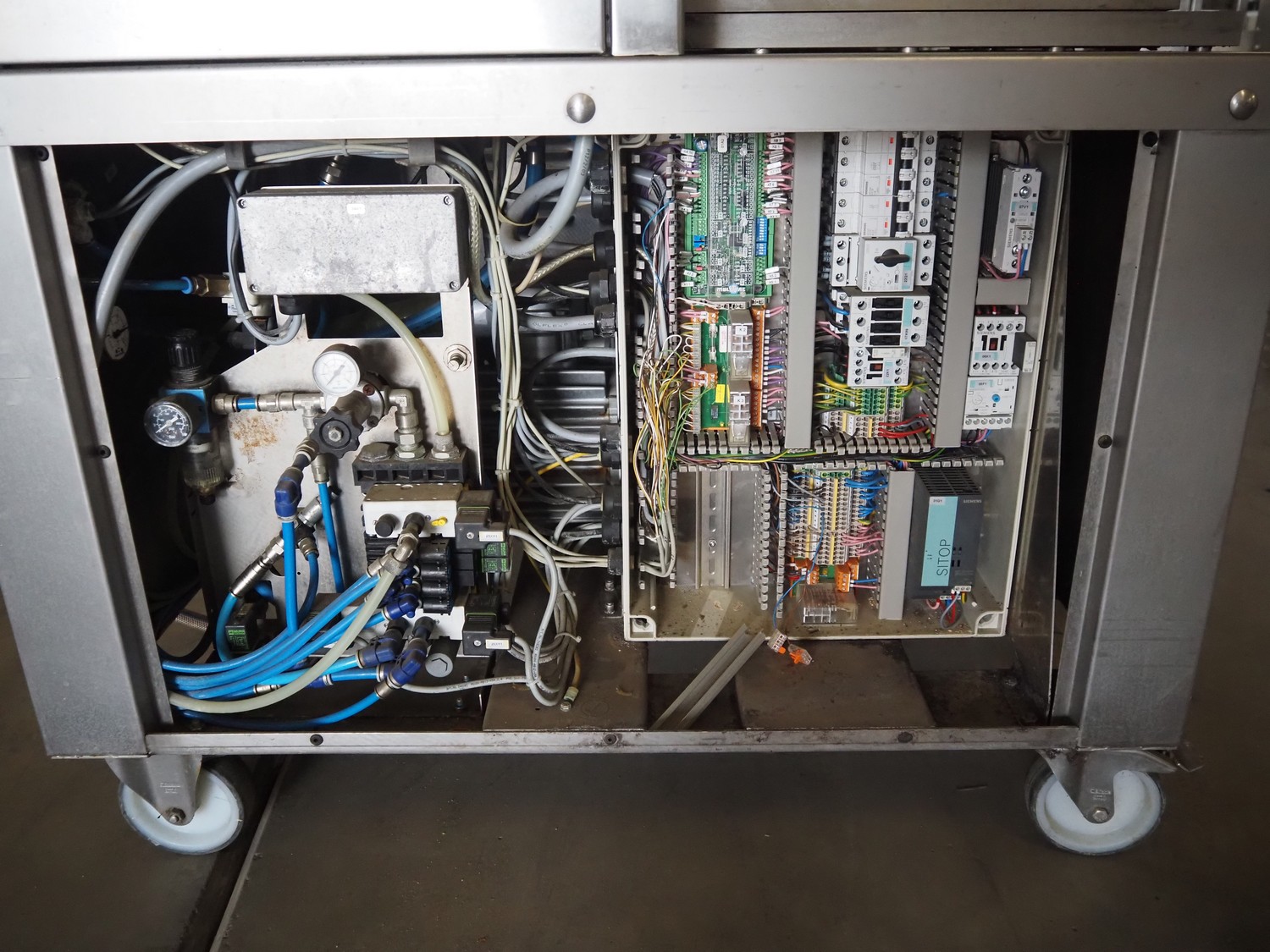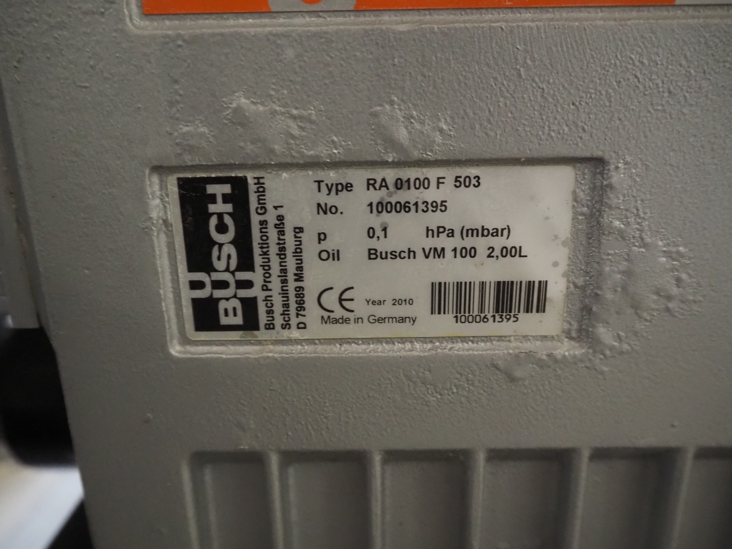 Multivac mobile traysealer, type: T250, serial number: 141145, year of construction: 2010, 400 V, 3 Ph, 50 Hz, 27/32 A, 5.2 kW, dimensions dye: (9x) Ø 90 mm, Busch vacuum pump, type: RA 0100 F 503, capacity: 100 m³ per hour, total dimensions: 1350 mm x 800 mm x 1650 mm. One cover is missing.
