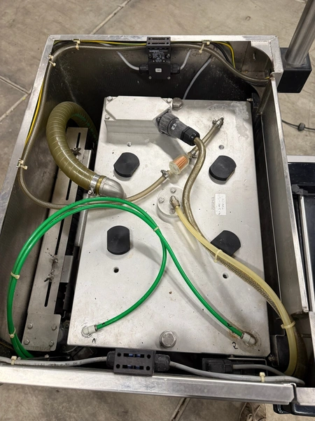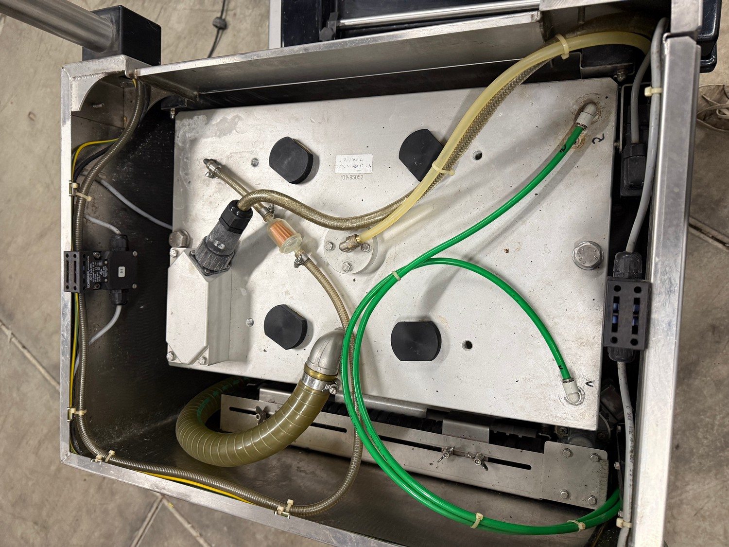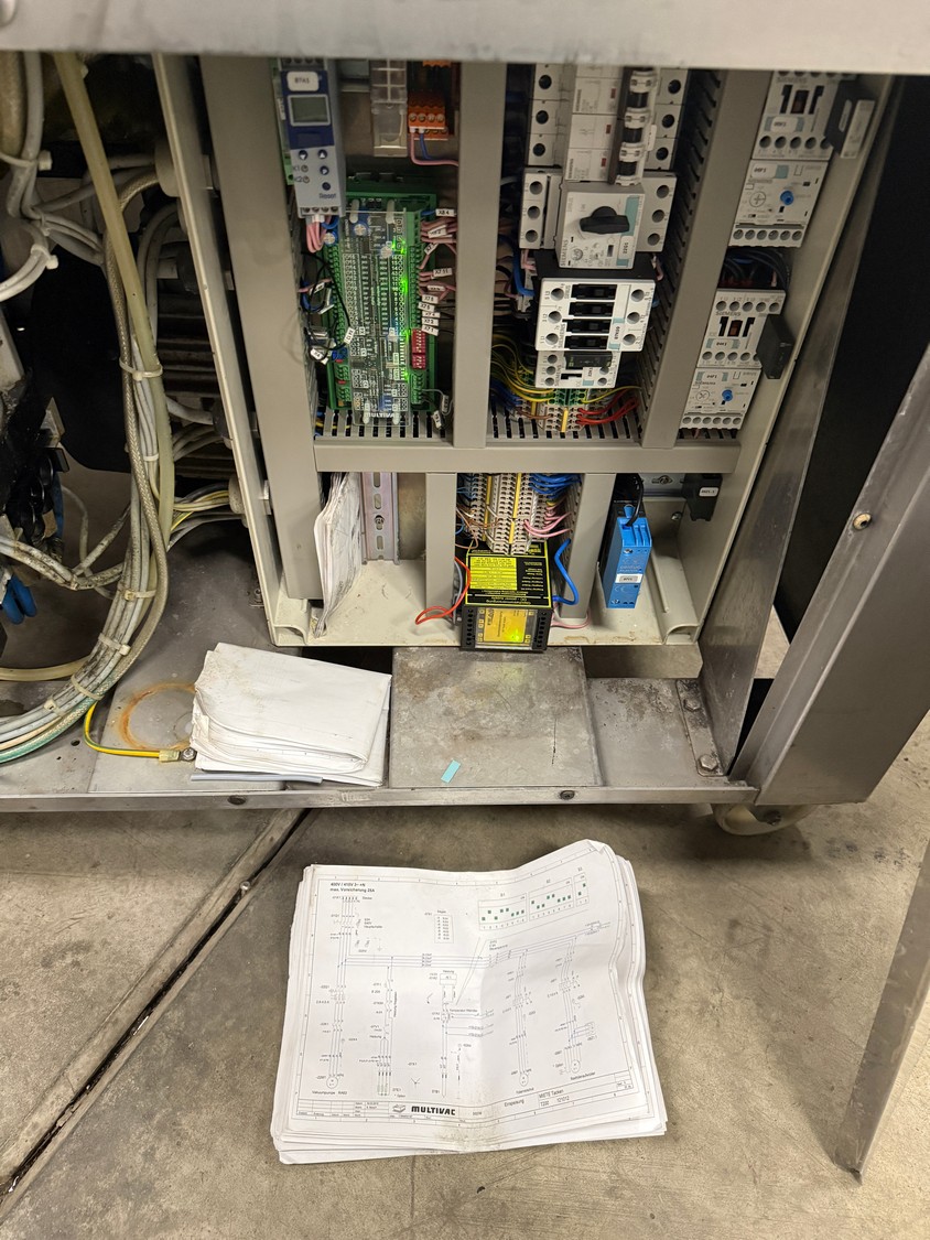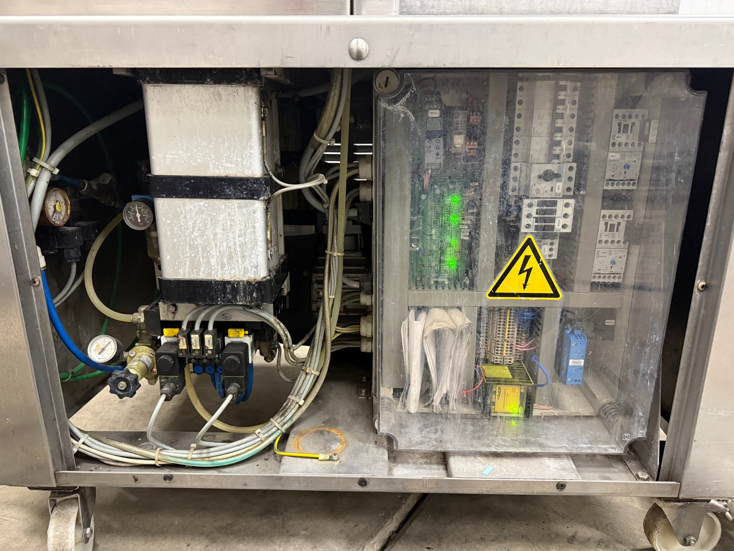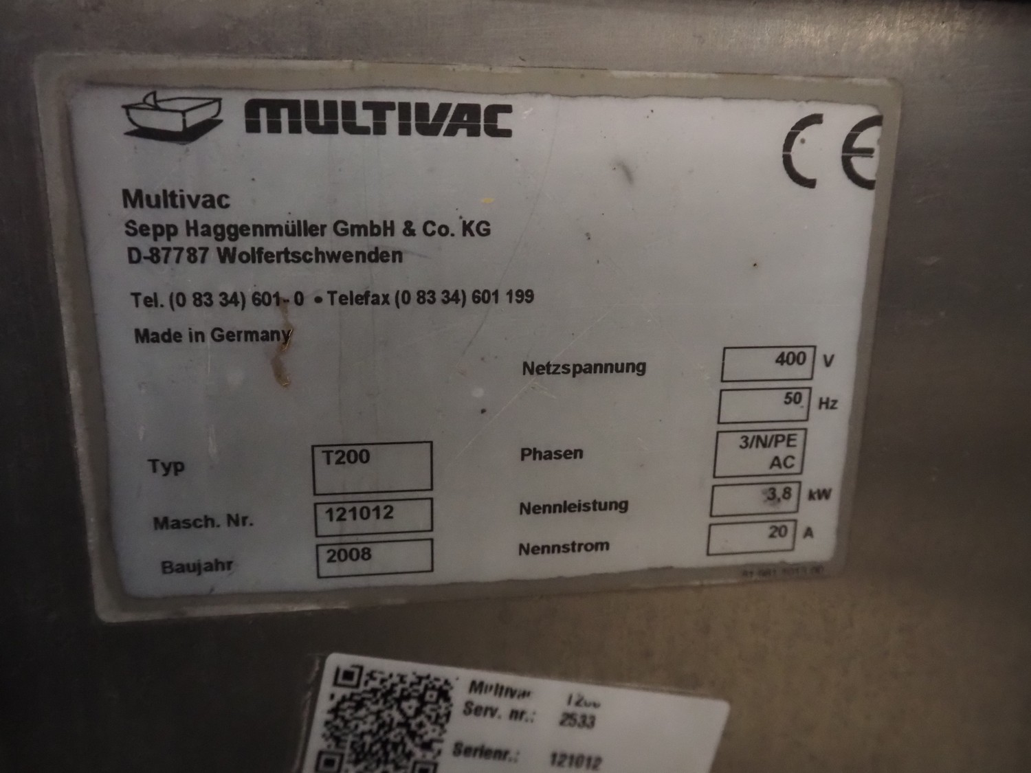 Multivac mobile traysealer, type: T200, machine number: 121012, year of construction: 2008, 400 V, 3 Ph, 50 Hz, 20 A, 3.8 kW, dimensions dye: (2x) 240 mm x 140 mm, total dimensions: 1350 mm x 750 mm x 1600 mm.