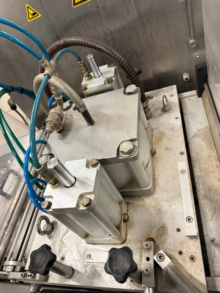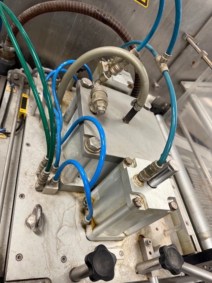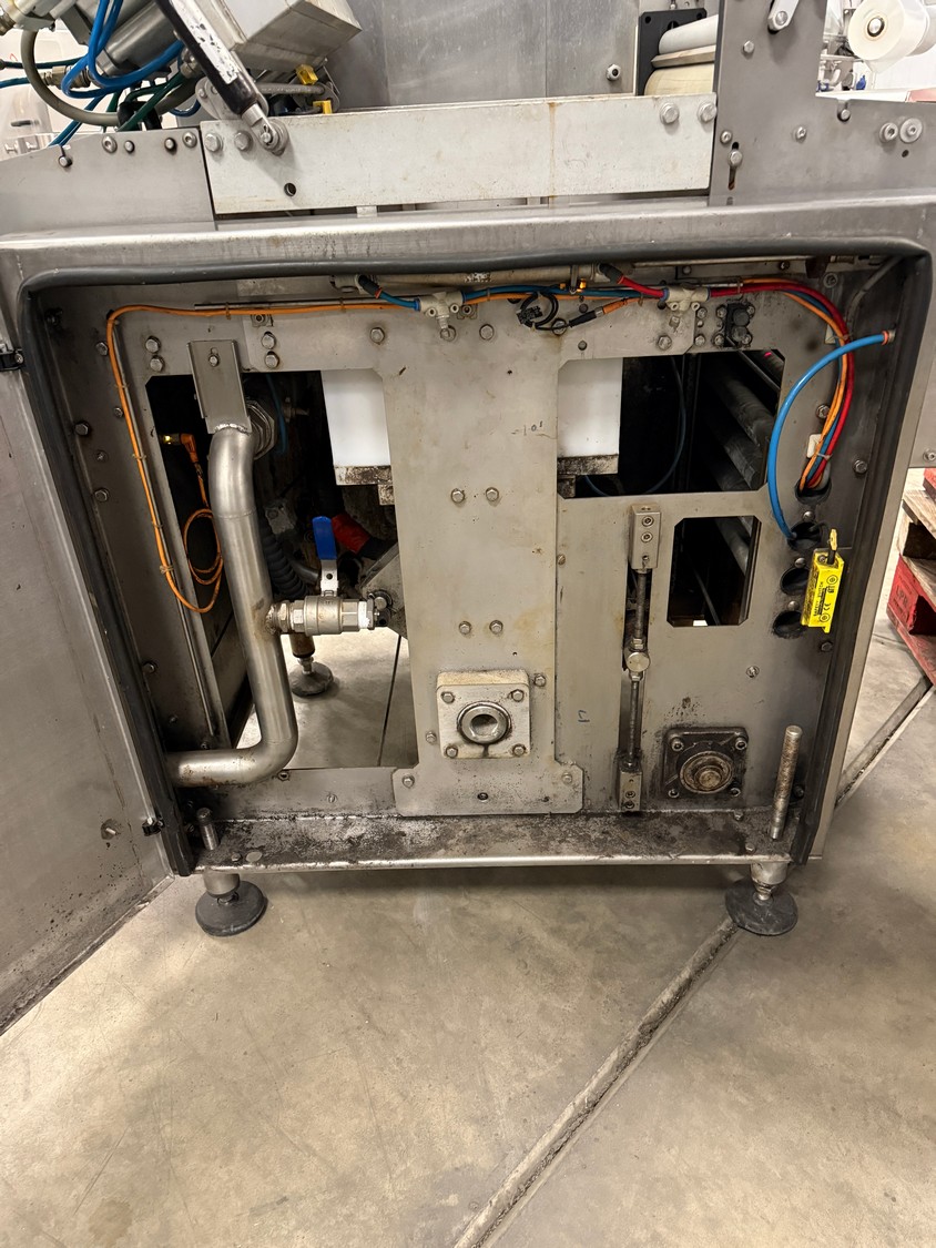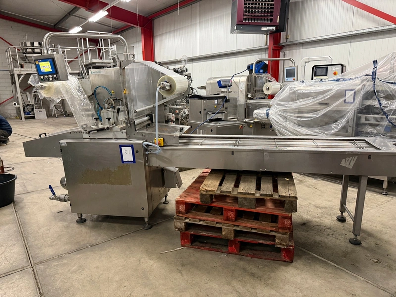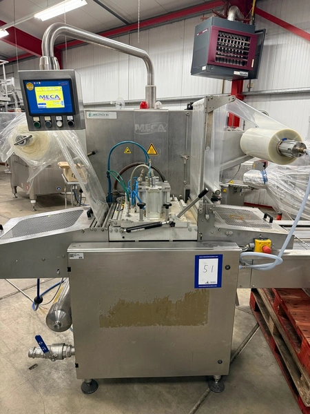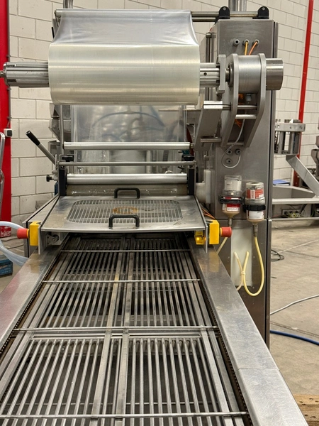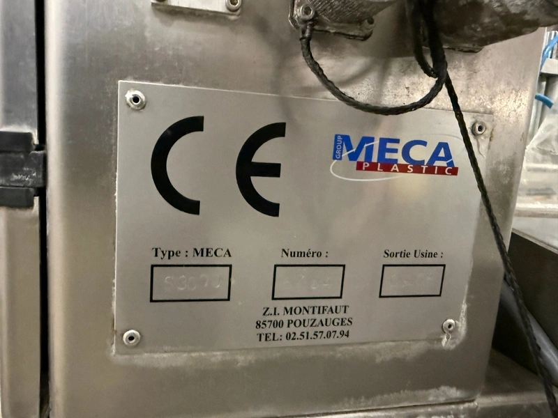Meca Plastic traysealer, type: MECA S3000, film width: 450 mm, christmas tree dye's, dimensions dye: (2x) 200 mm x 150 mm, plastic outfeed rollers, roller width: 500 mm, total dimensions: 3800 mm x 900 mm x 2000 mm.