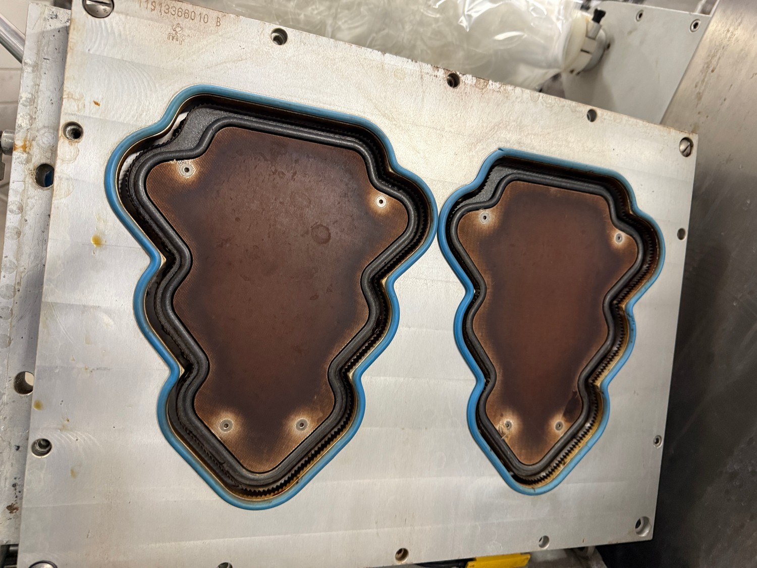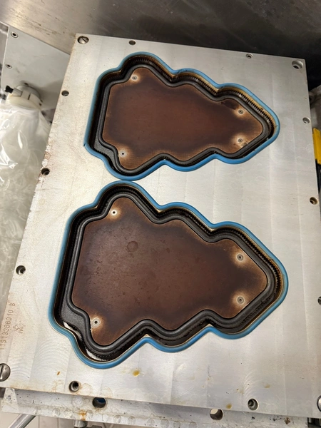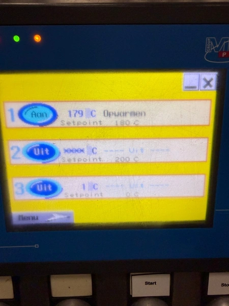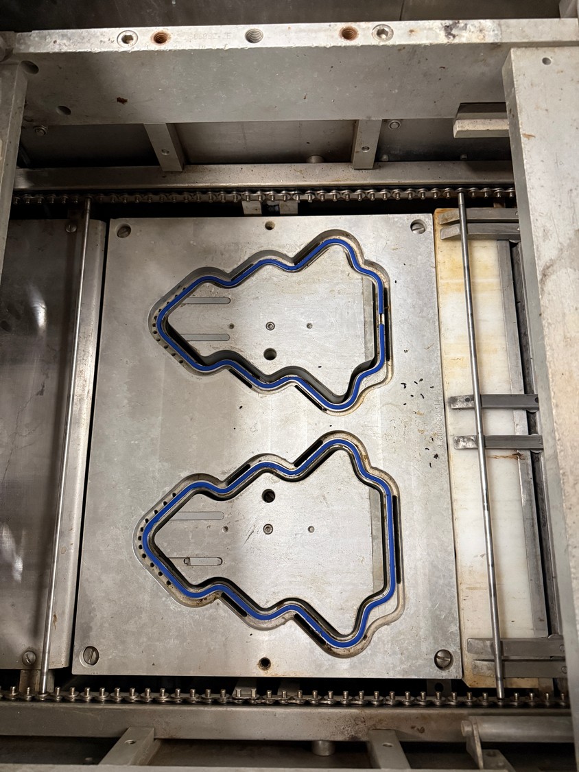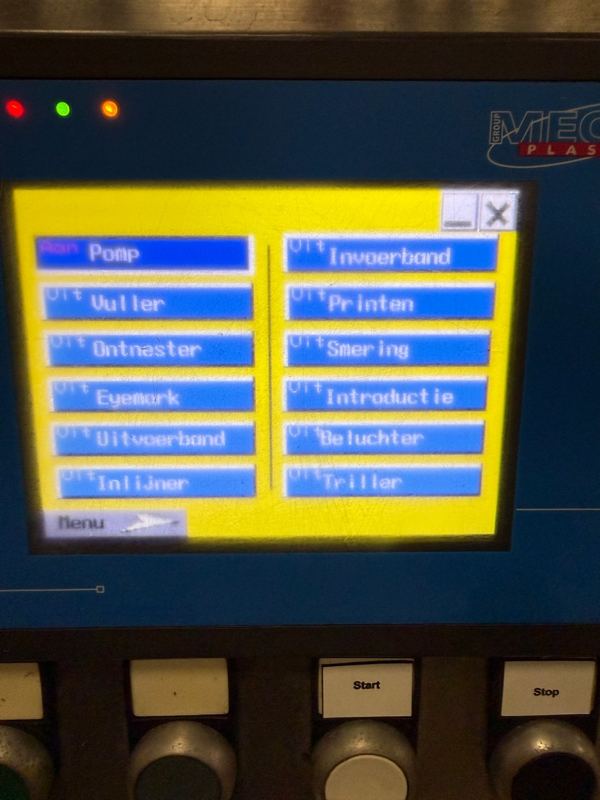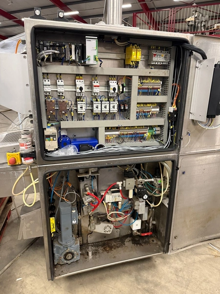 Meca Plastic traysealer, type: MECA S3000, film width: 450 mm, christmas tree dye's, dimensions dye: (2x) 200 mm x 150 mm, plastic outfeed rollers, roller width: 500 mm, total dimensions: 3800 mm x 900 mm x 2000 mm.
