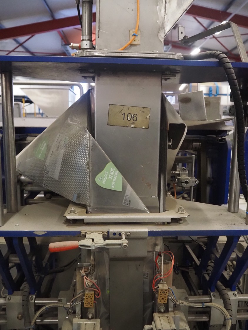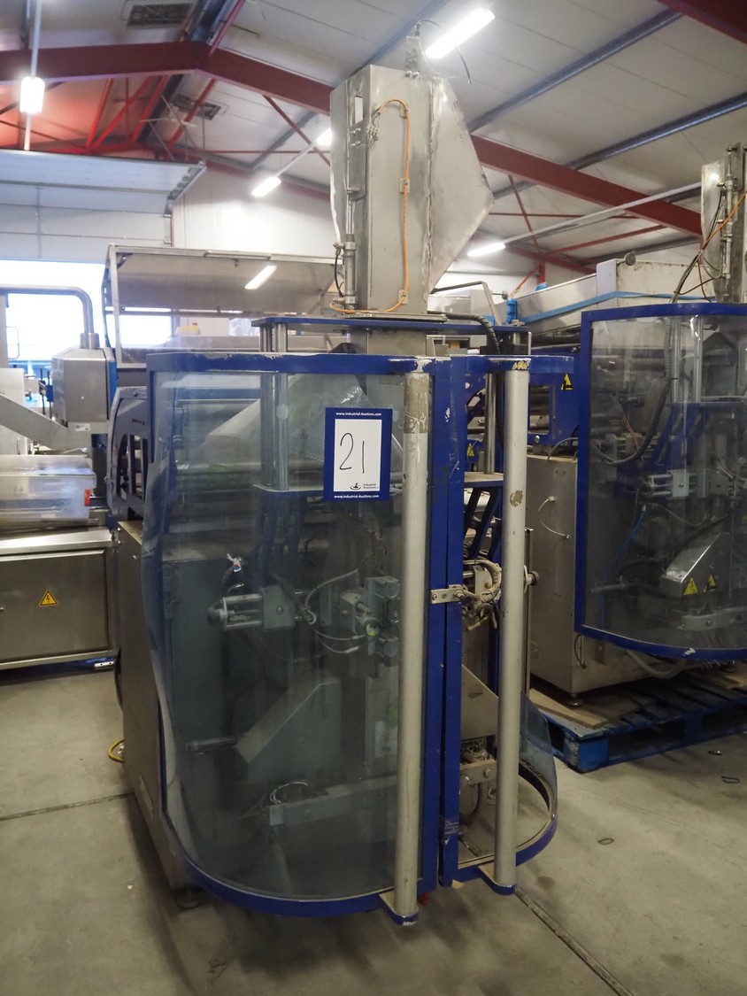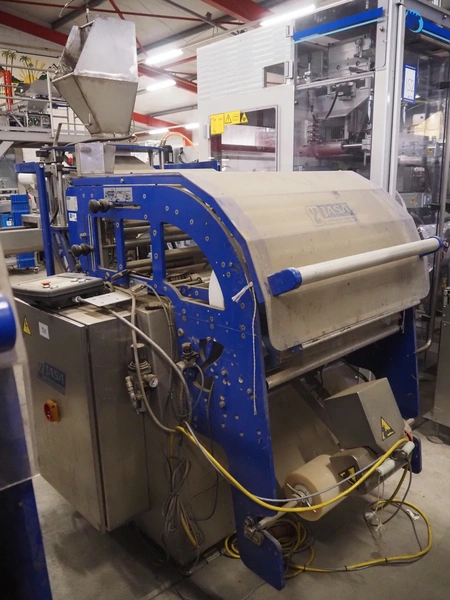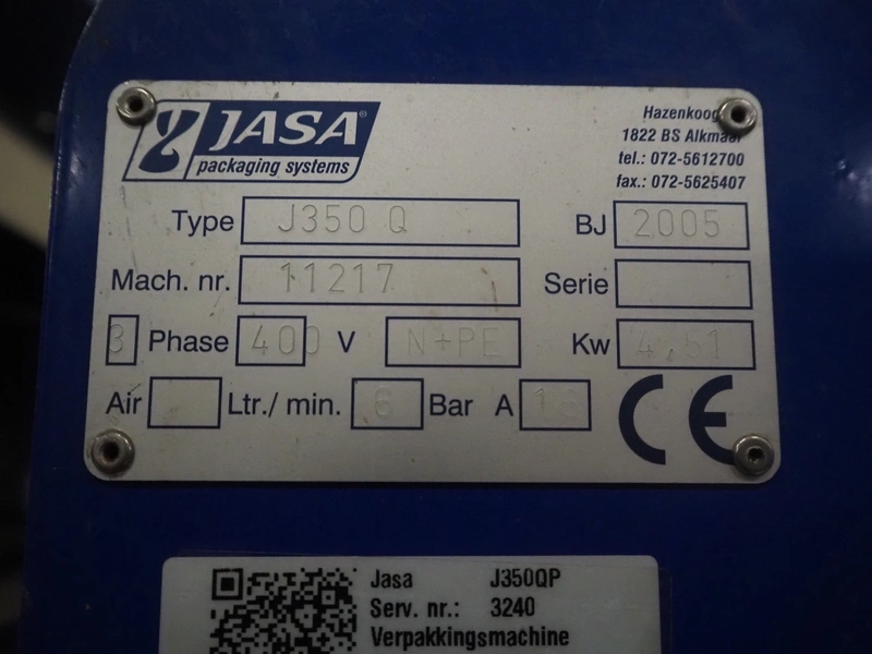 Jasa Packaging Systems vertical form-fill and seal machine, type: J350 0, machine number: 11217, year of construction: 2005, 400 V, 3 Ph, 16 A, 4.51 kW, film width: 610 mm, dimensions clearance: 160 mm x 100 mm, seal length: 360 mm, seal width: 390 mm, total dimensions: 2100 mm x 1230 mm x 2400 mm. Cover broken.