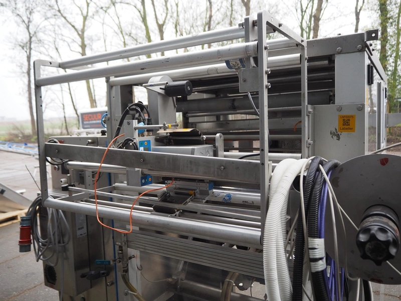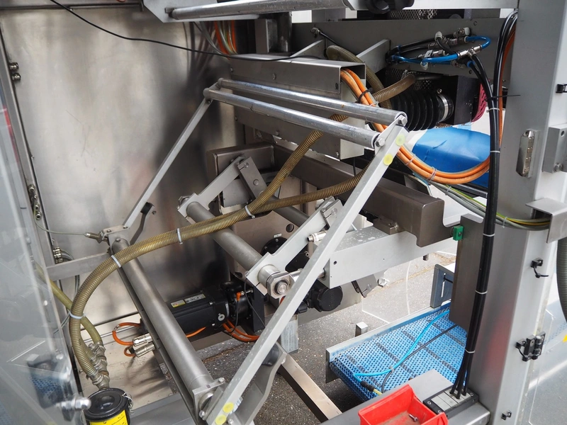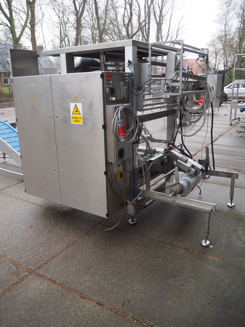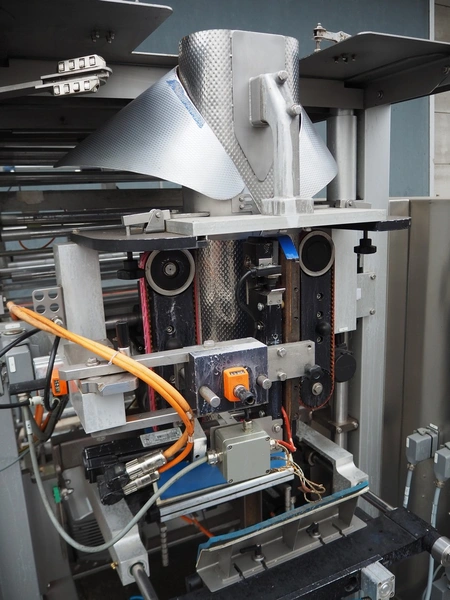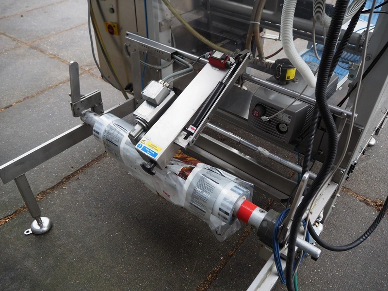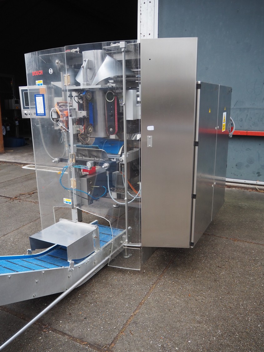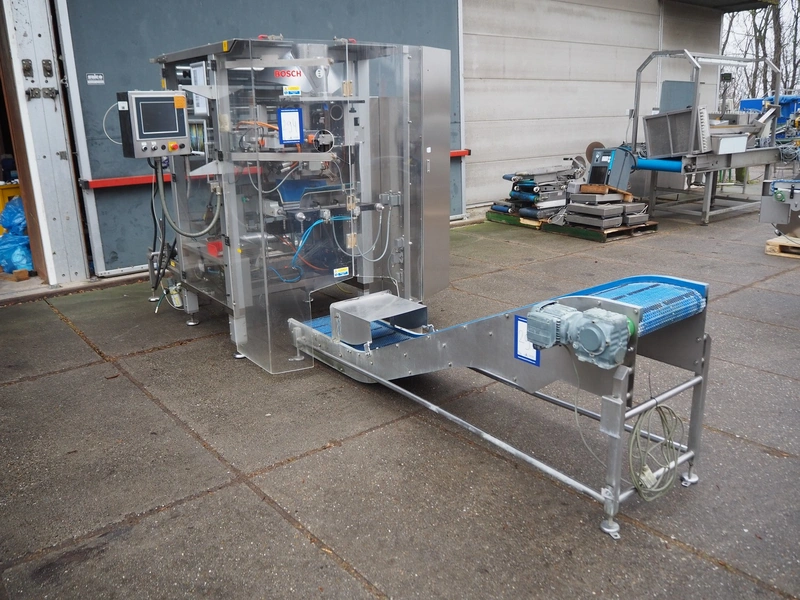 Bosch vertical bag form-, fill-, and seal machine, type: SVE 3615 LR, number: 705950MS7536N, year of construction: 2008, Becker vacuum pump, type: VT 4.25, weight: 1450 kg, film width: 710 mm, dimensions pipe: 230 mm x 155 mm, horizontal seal length: 375 mm, total dimensions: 1850 mm x 2550 mm x 2000 mm. Incomplete, vertical seal is missing. Including outfeed elevating belt with plastic mesh belt , belt width: 455 mm, elevating height: 860 mm, total dimensions outfeed belt: 2800 mm x 800 mm x 890 mm.