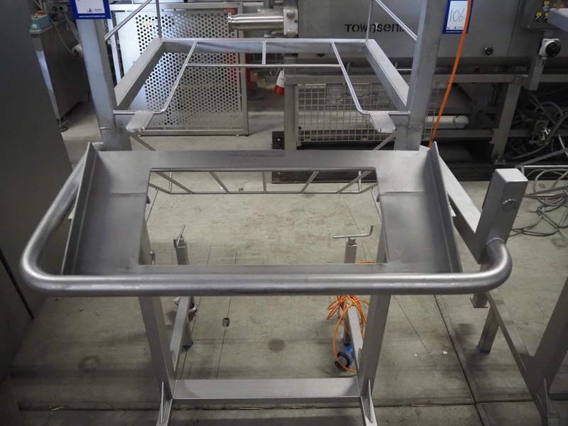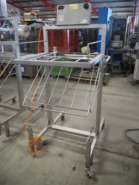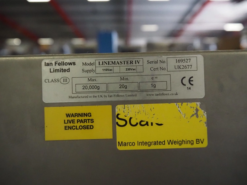 Marco weighing scale for crates on s/s mobile frame, model: LineMaster IV, serial number: 169527, 110-230 V, maximum: 20000 gram, minimum: 20 gram, e= 1 gram, dimensions scale: 440 mm x 400 mm, total dimensions: 1280 mm x 550 mm x 1780 mm.