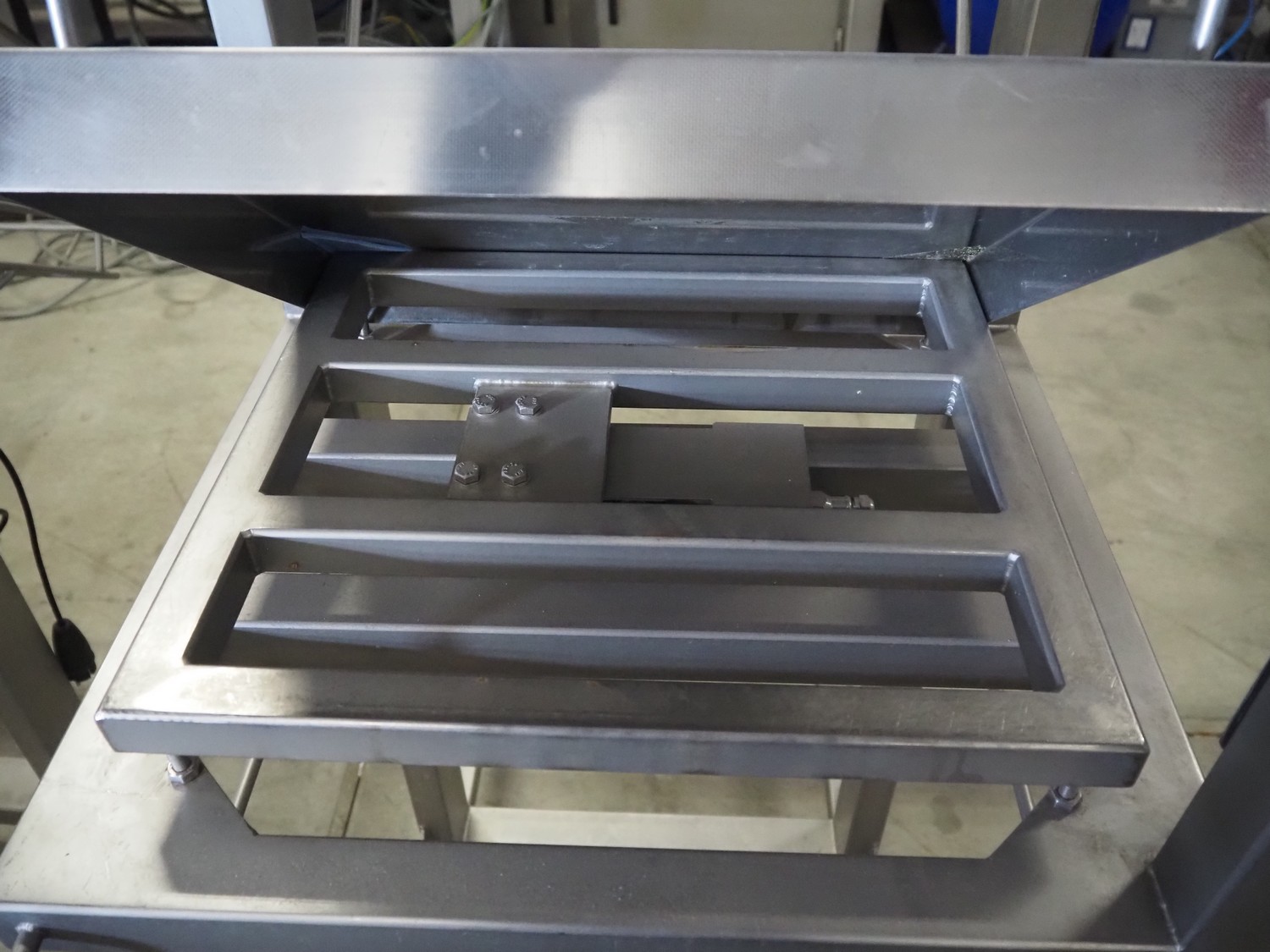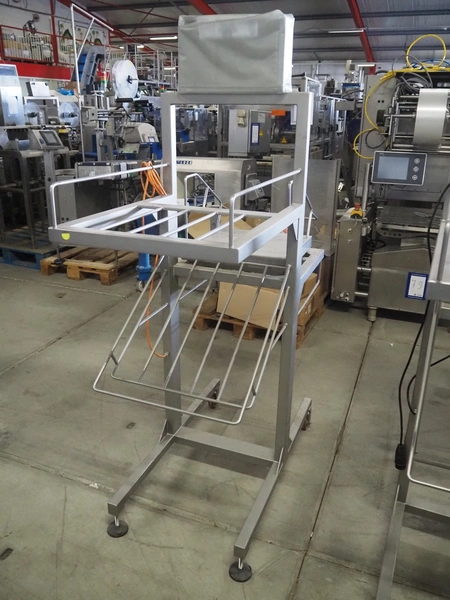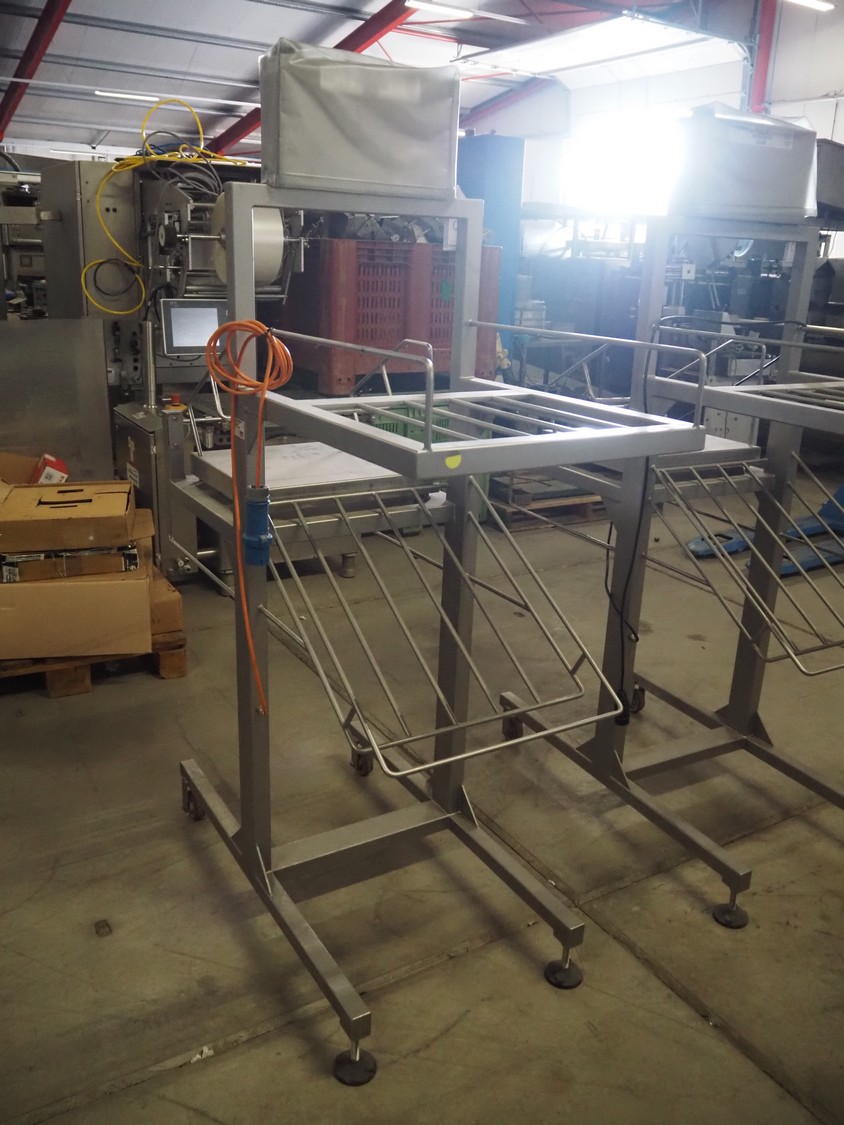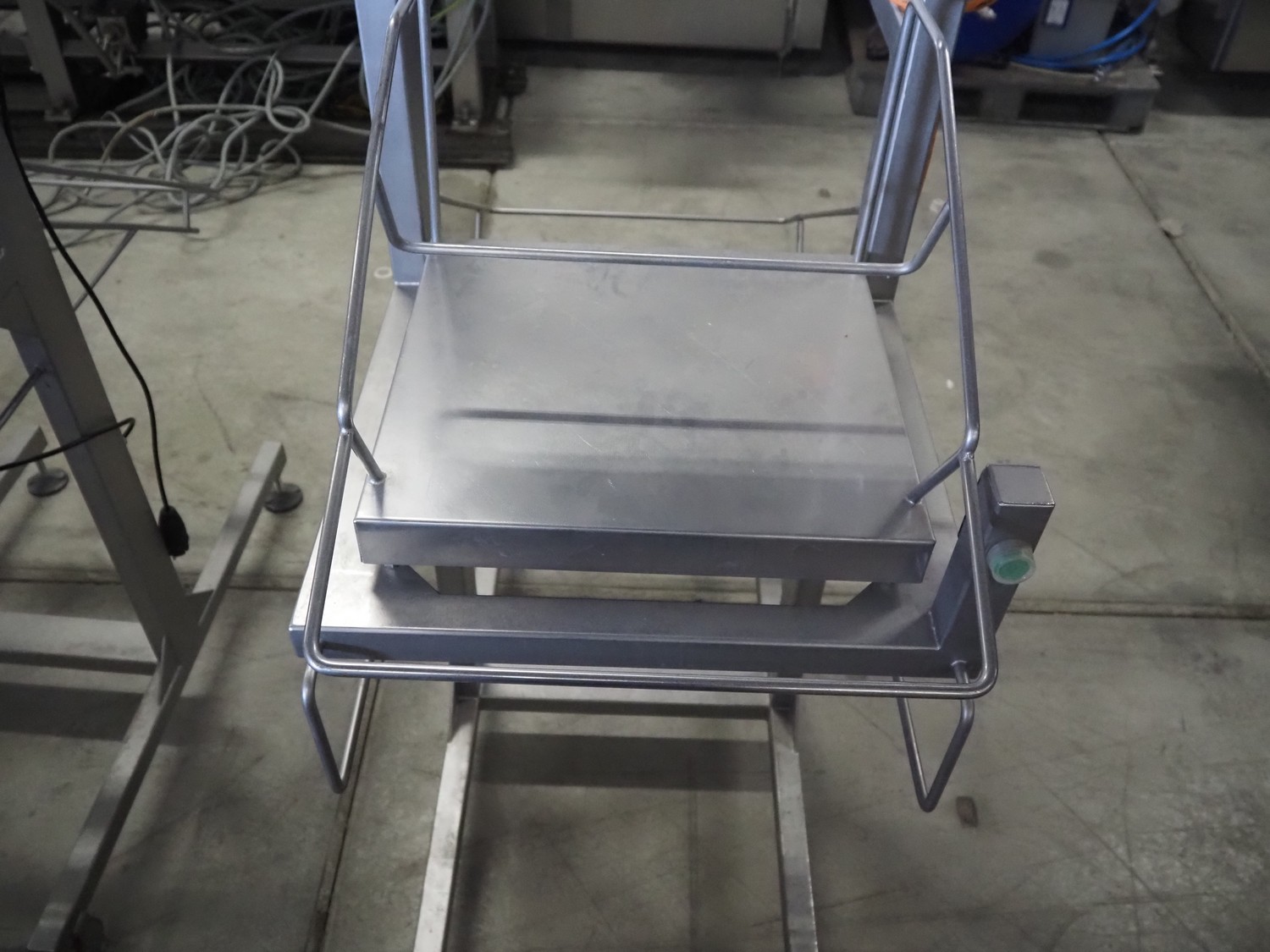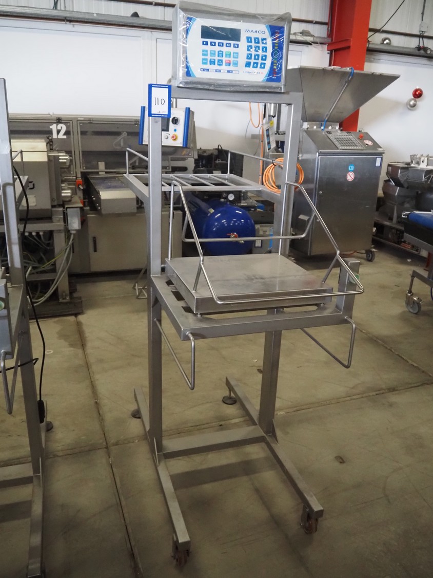 Marco weighing scale for crates on s/s mobile frame, model: LMIII, serial number: 49584, 90-250 V, 50-60 Hz, 0.8 A, maximum: 20000 gram, minimum: 20 gram, e= 1 gram, dimensions scale: 440 mm x 400 mm, total dimensions: 1280 mm x 550 mm x 1780 mm.