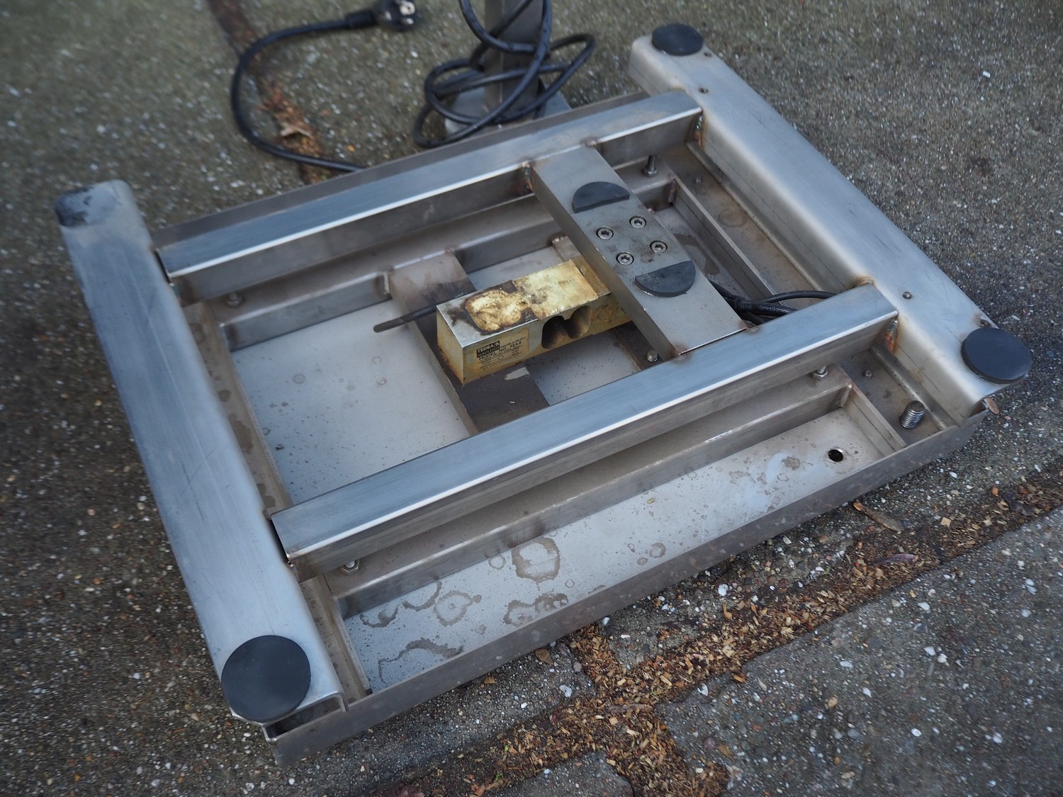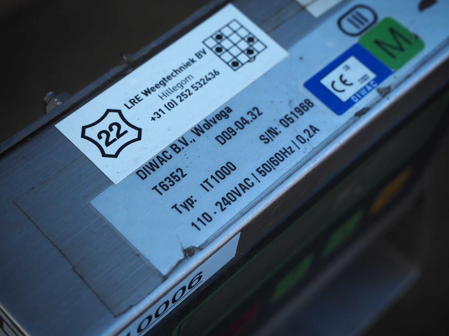 Diwac b.v. weighing scale and indicator, type: IT1000, serial number: 051968, 110-240 V, 50-60 Hz, 0.2 A, with Tedea Huntleigh load cell, model: 1242, scale dimensions: 500 mm x 400 mm, total dimensions: 500 mm x 500 mm x 800 mm.