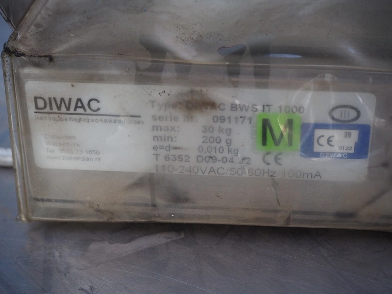Ohaus weighing scale, model: D60BL, serial number: 1623181-6CK, capacity: 60 kg / 150 lb, Diwac indicator, type: Diwac BWS IT 1000, serial number: 091171, weighing range: 200 g - 30 kg, 110-240 V, 50-60 Hz, 100 mA, with Teda Huntleigh load cell, model: 1260, dimensions: 550 mm x 420 mm x 130 mm.