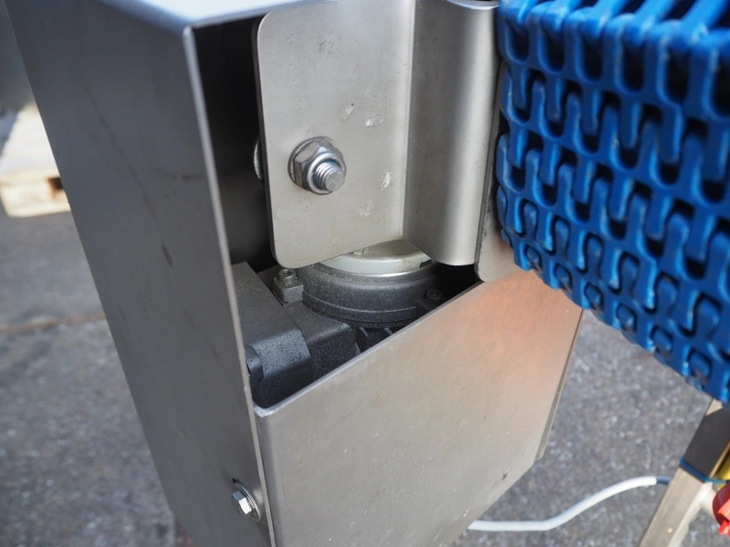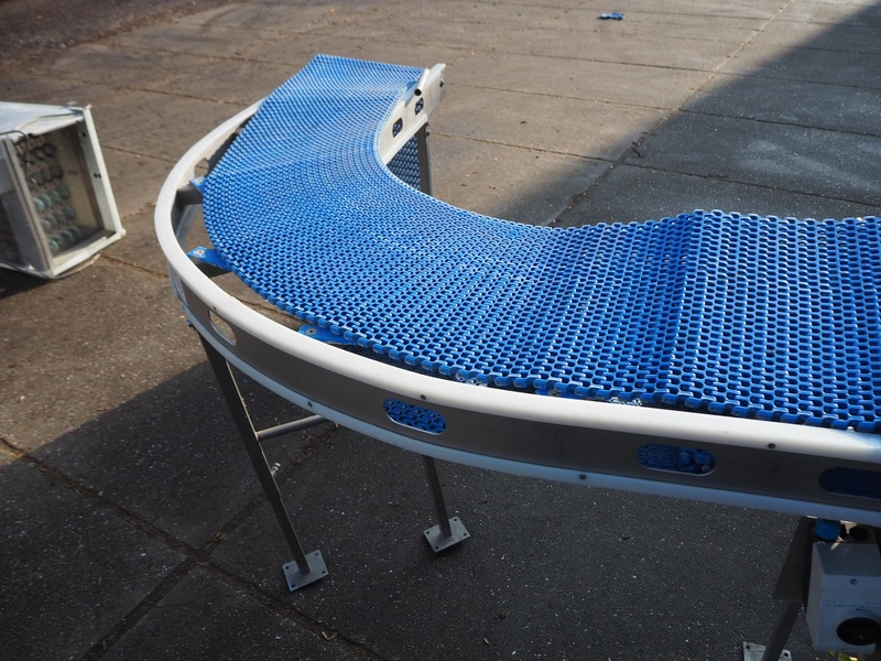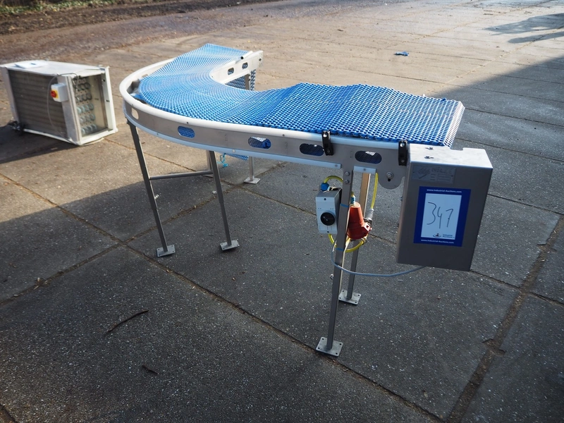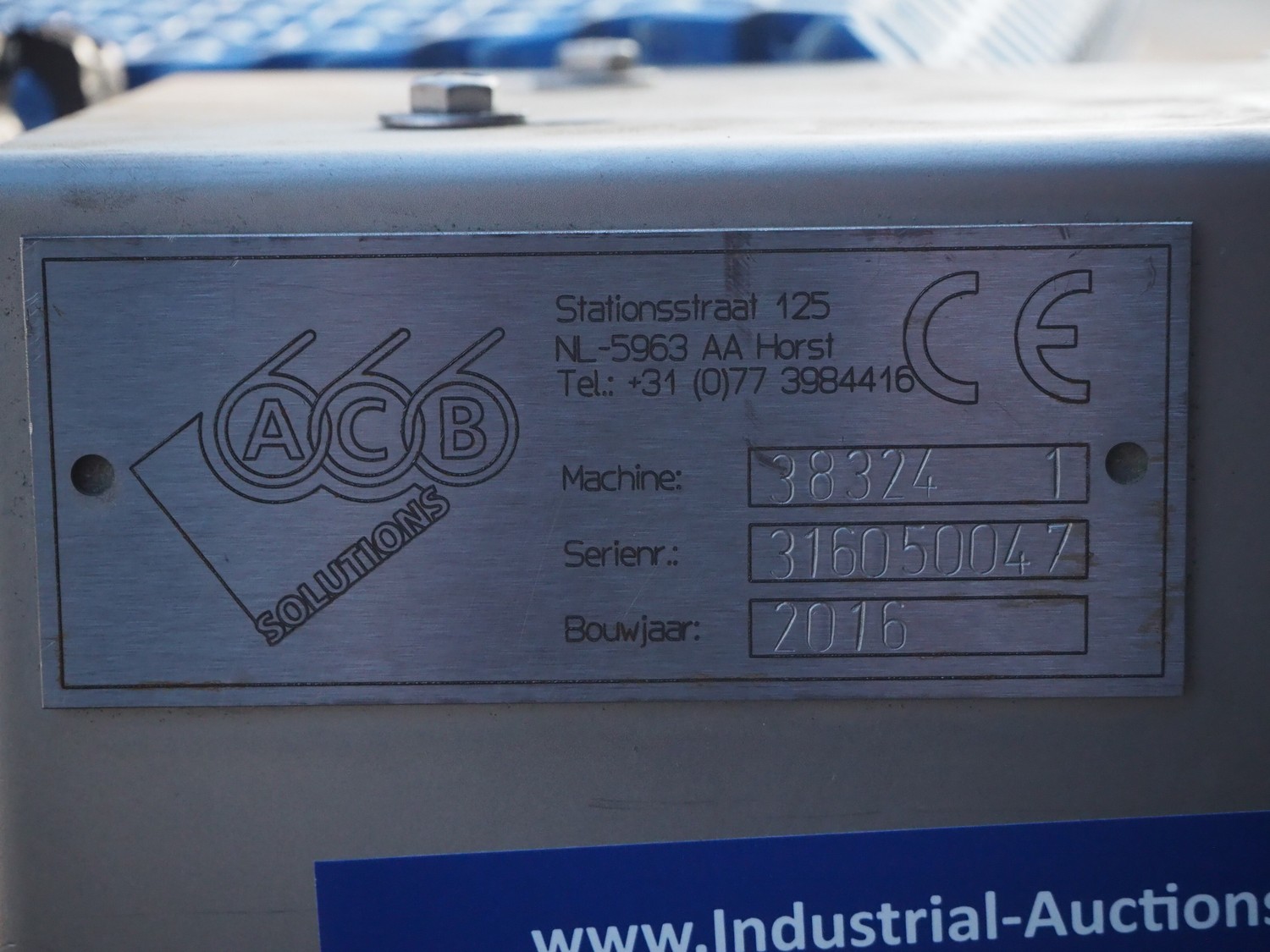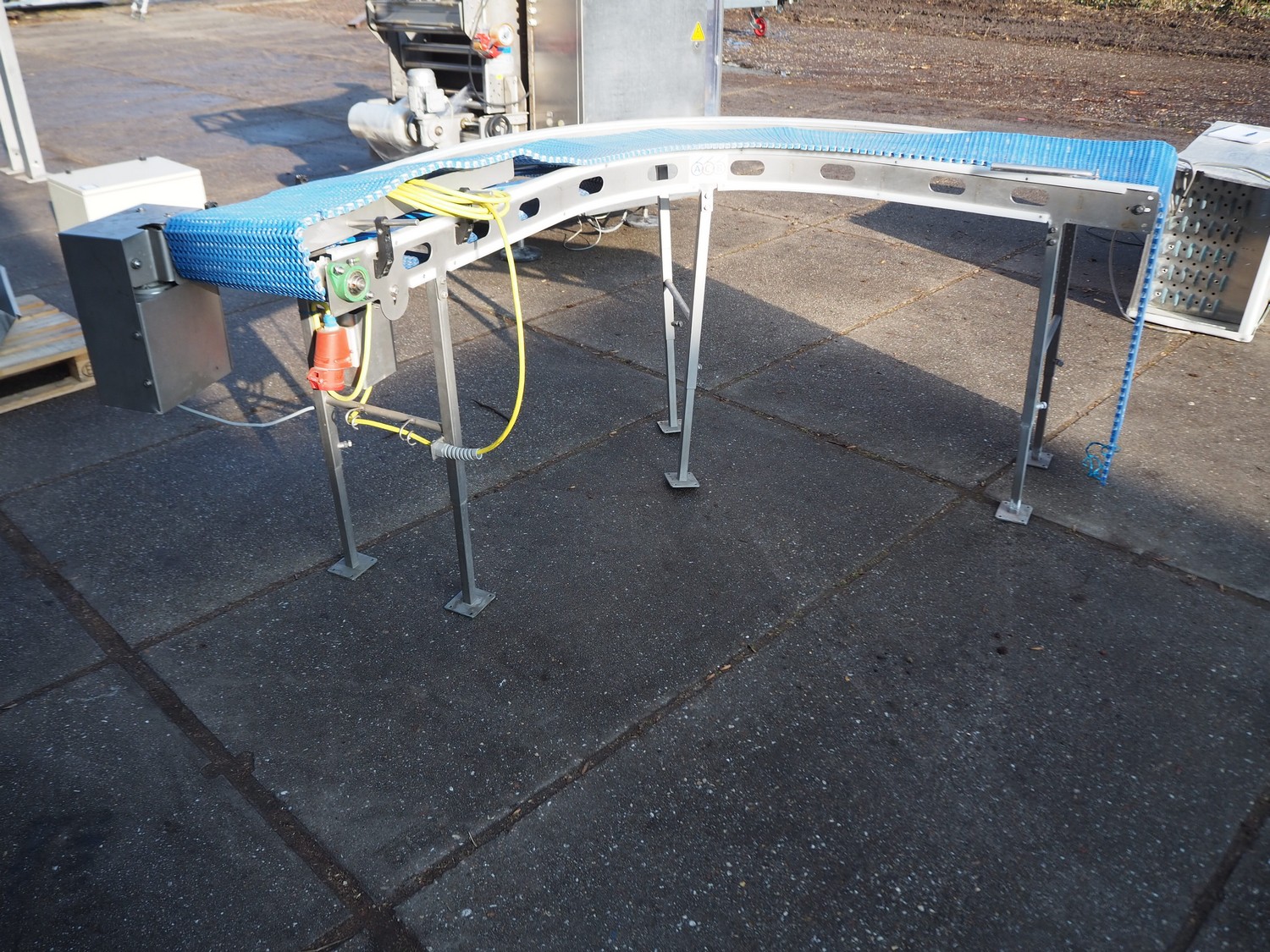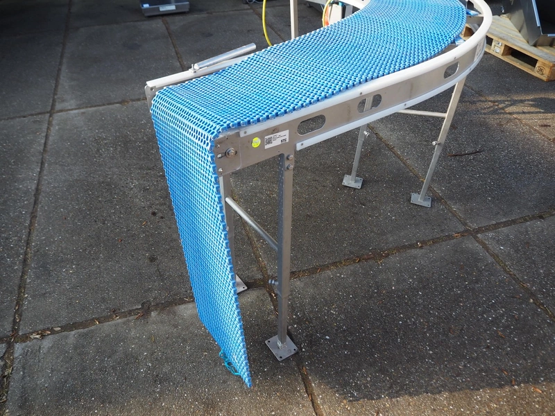 ACB solutions 90° curve conveyor, machine: 38324 1, serial number: 316050047, year of construction: 2016, plastic mesh belt, belt width: 370 mm, total dimensions: 2100 mm x 1700 mm x 1000 mm. Technical condition unknown.