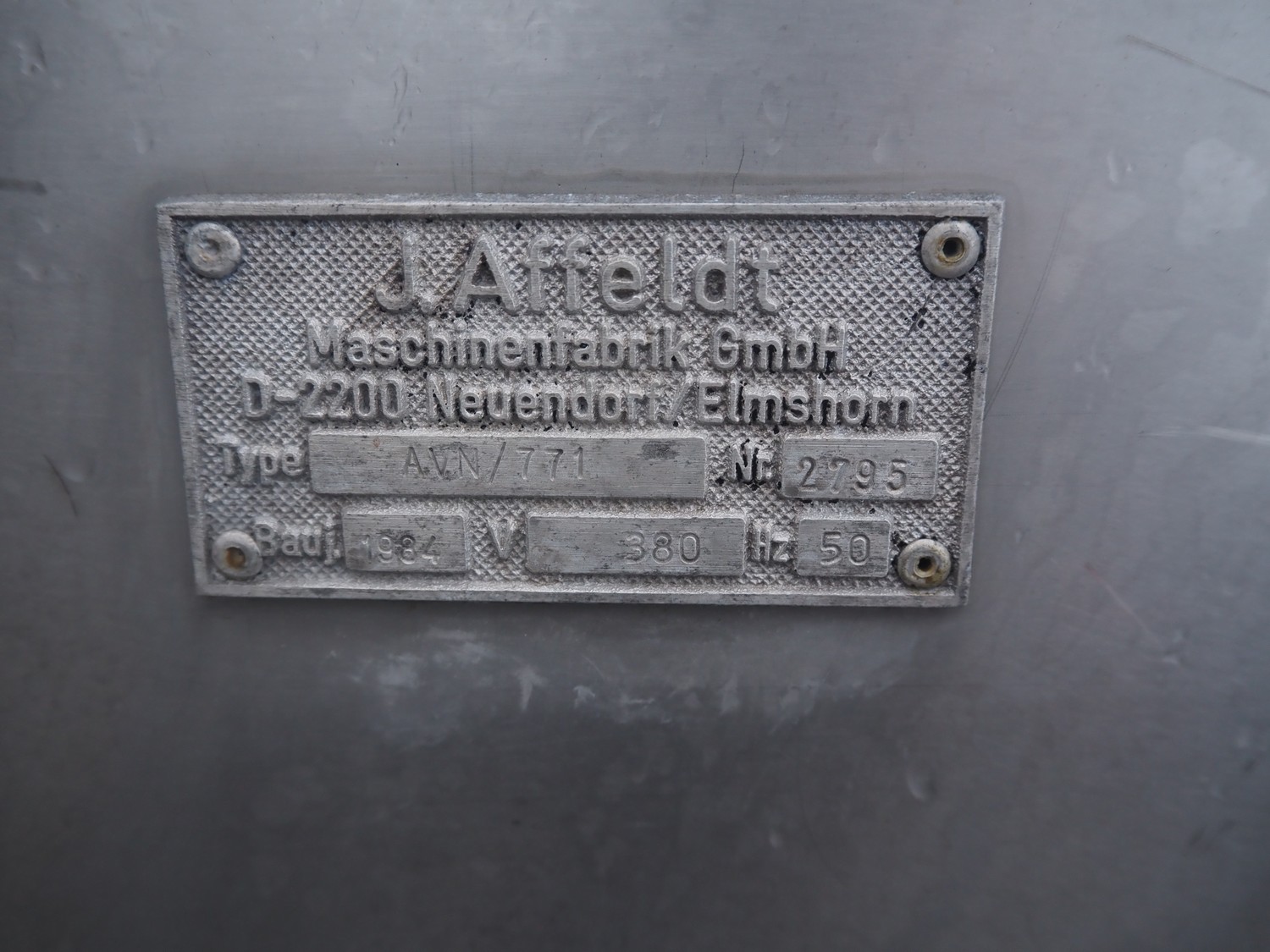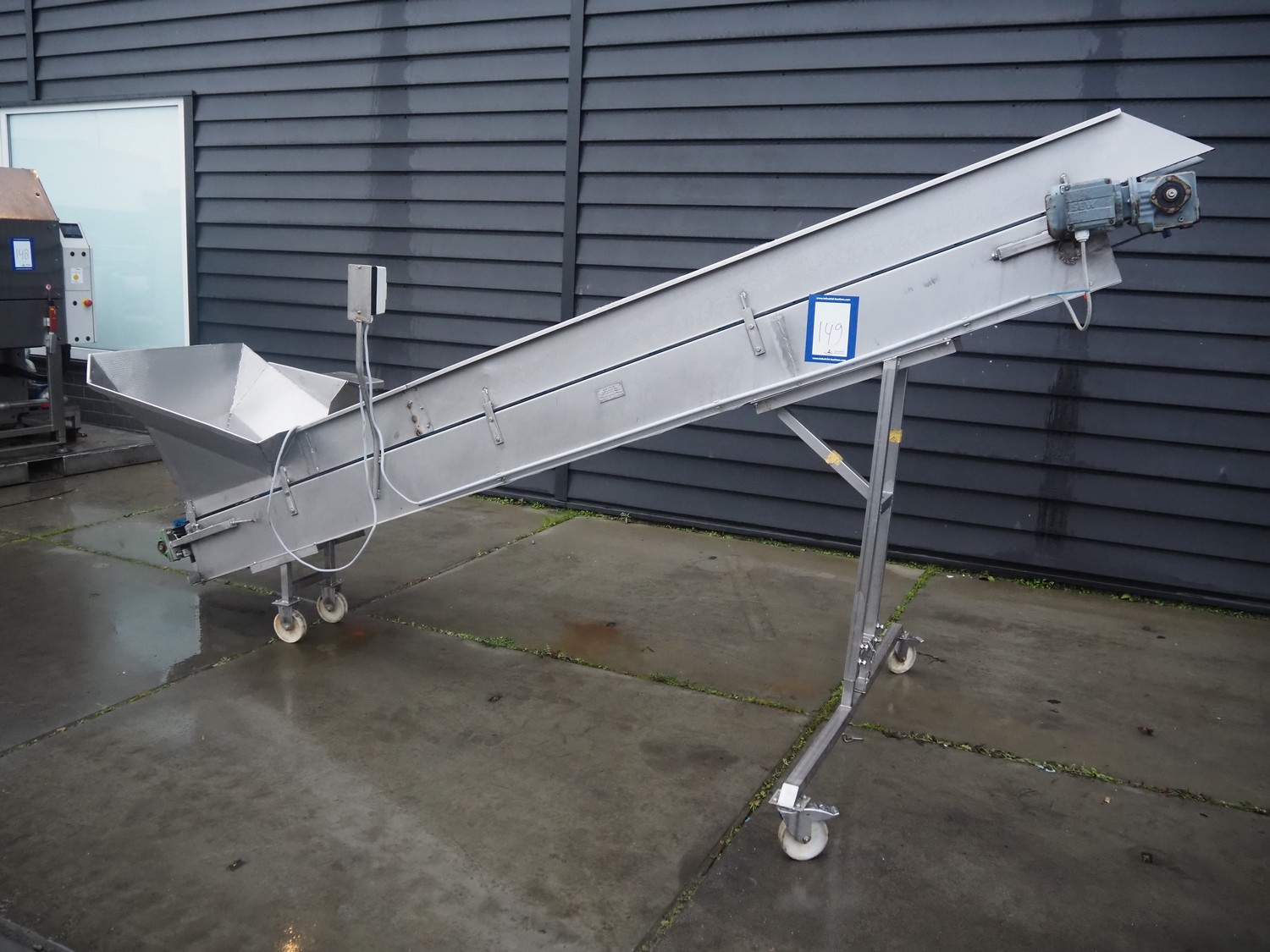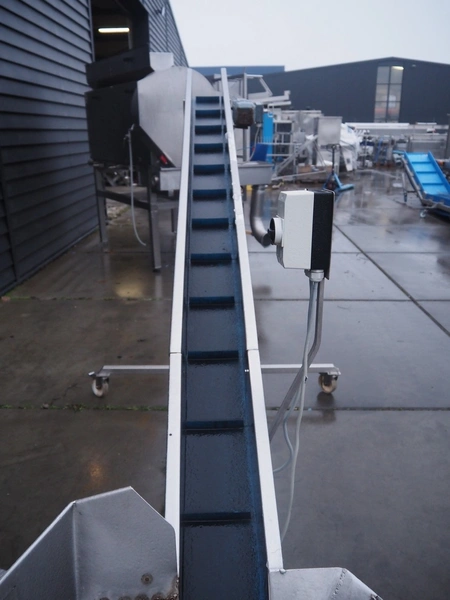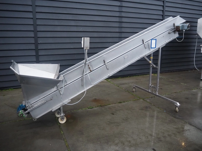 J. Affeldt mobile elevating belt, type: AVN/771, number: 2795, year of construction: 1984, 380 V, 50 Hz, plastic belt with dividers, belt width: 190 mm, divider height: 30 mm, distance between dividers: 235 mm, elevating height: 1750 mm, total dimensions: 3600 mm x 1500 mm x 1900 mm.