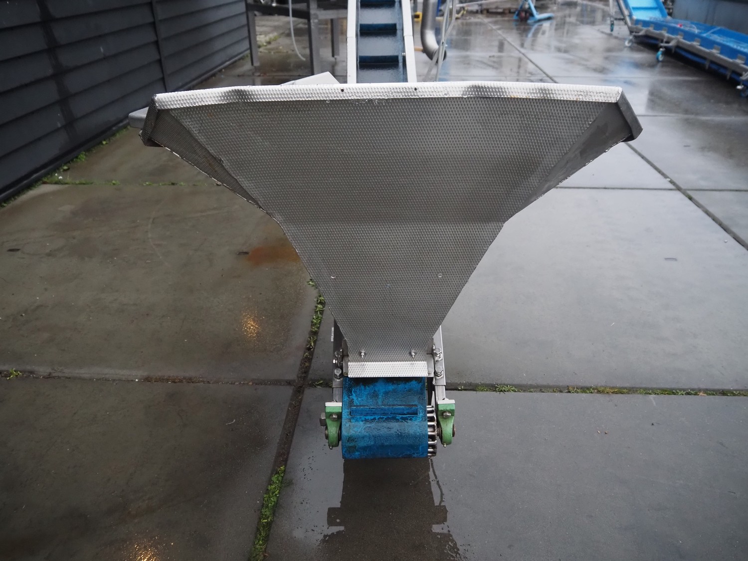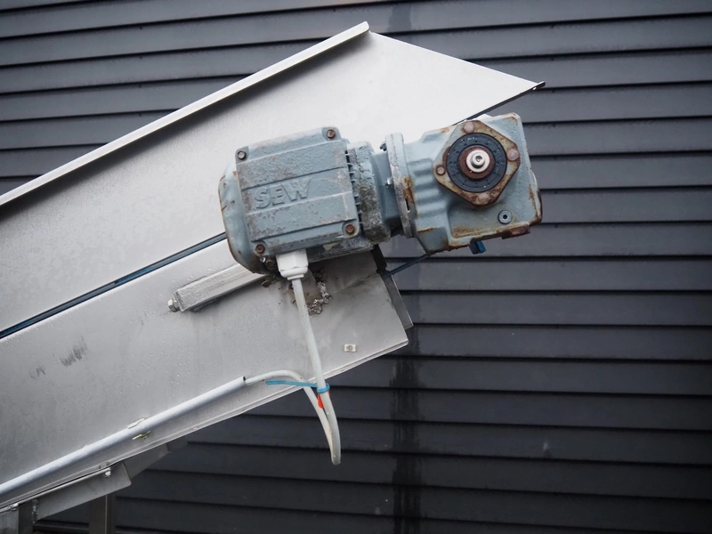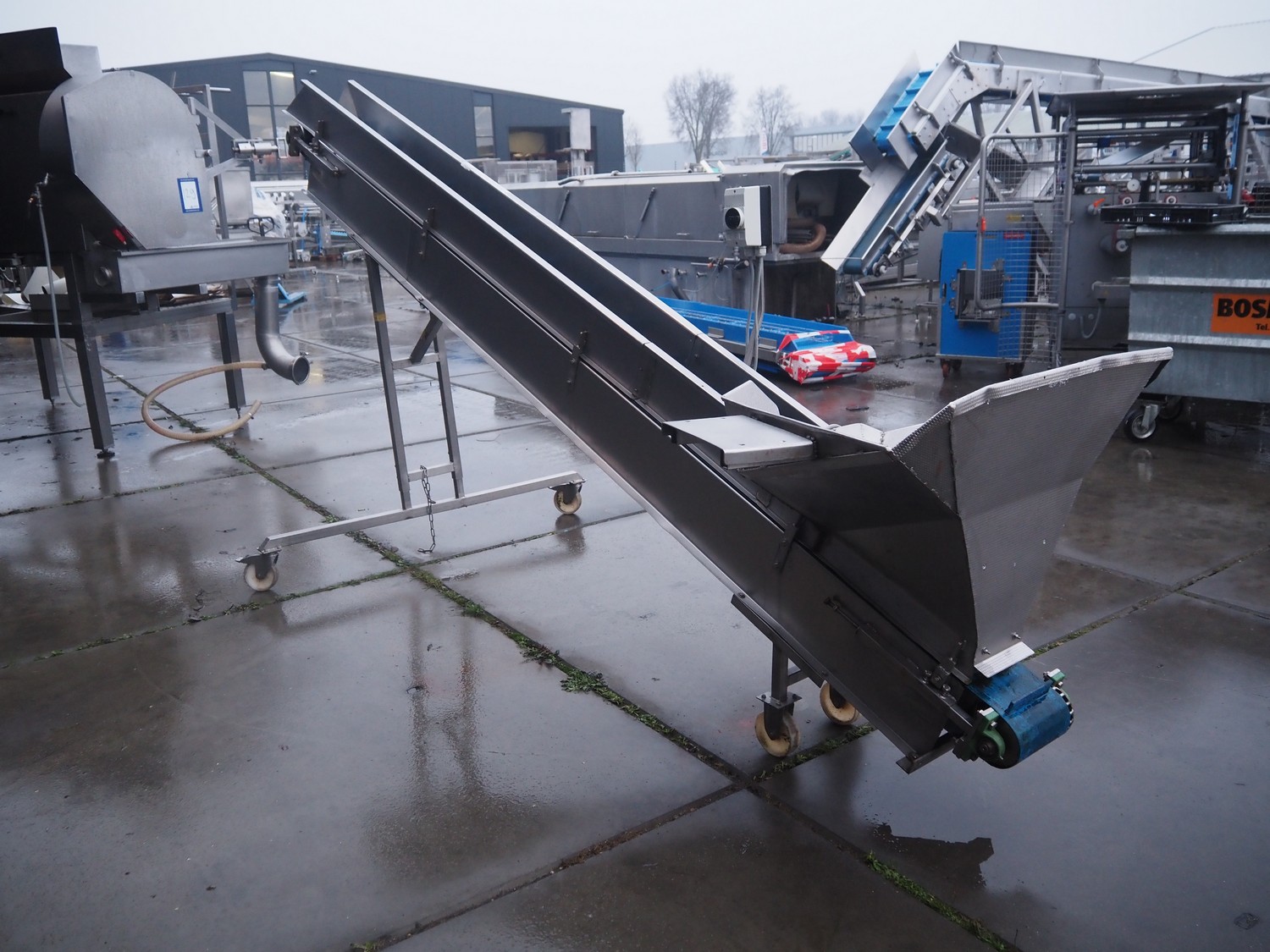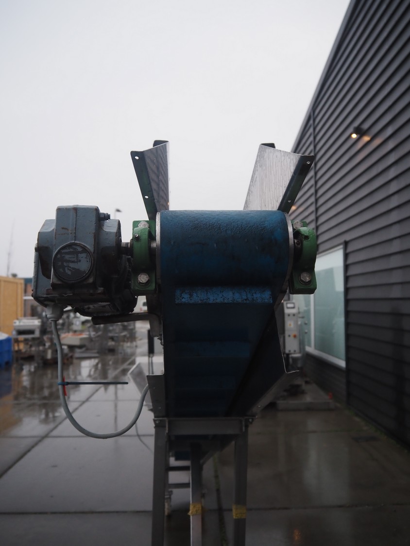 J. Affeldt mobile elevating belt, type: AVN/771, number: 2795, year of construction: 1984, 380 V, 50 Hz, plastic belt with dividers, belt width: 190 mm, divider height: 30 mm, distance between dividers: 235 mm, elevating height: 1750 mm, total dimensions: 3600 mm x 1500 mm x 1900 mm.