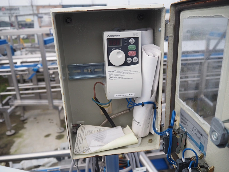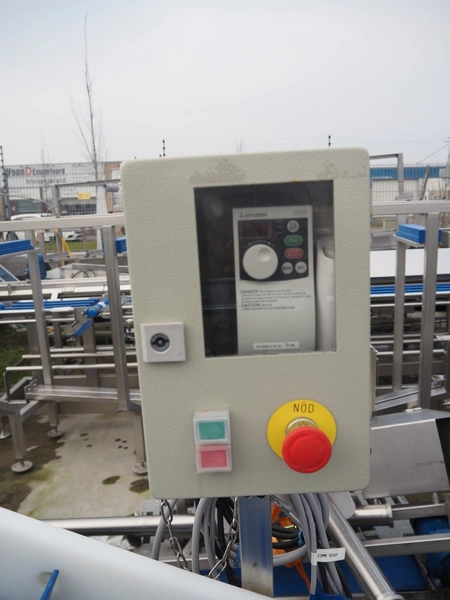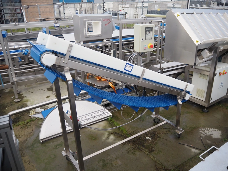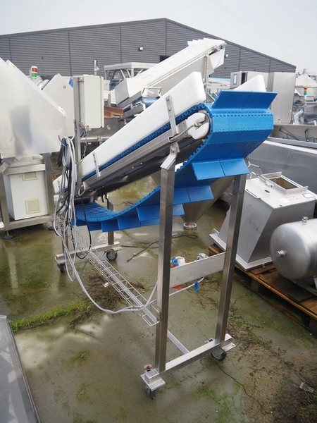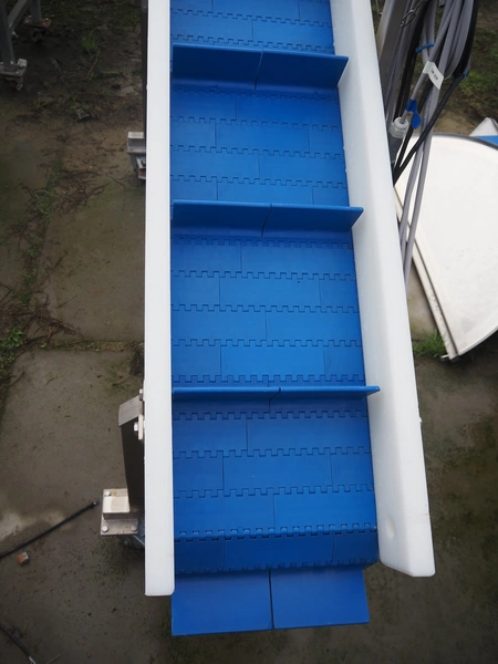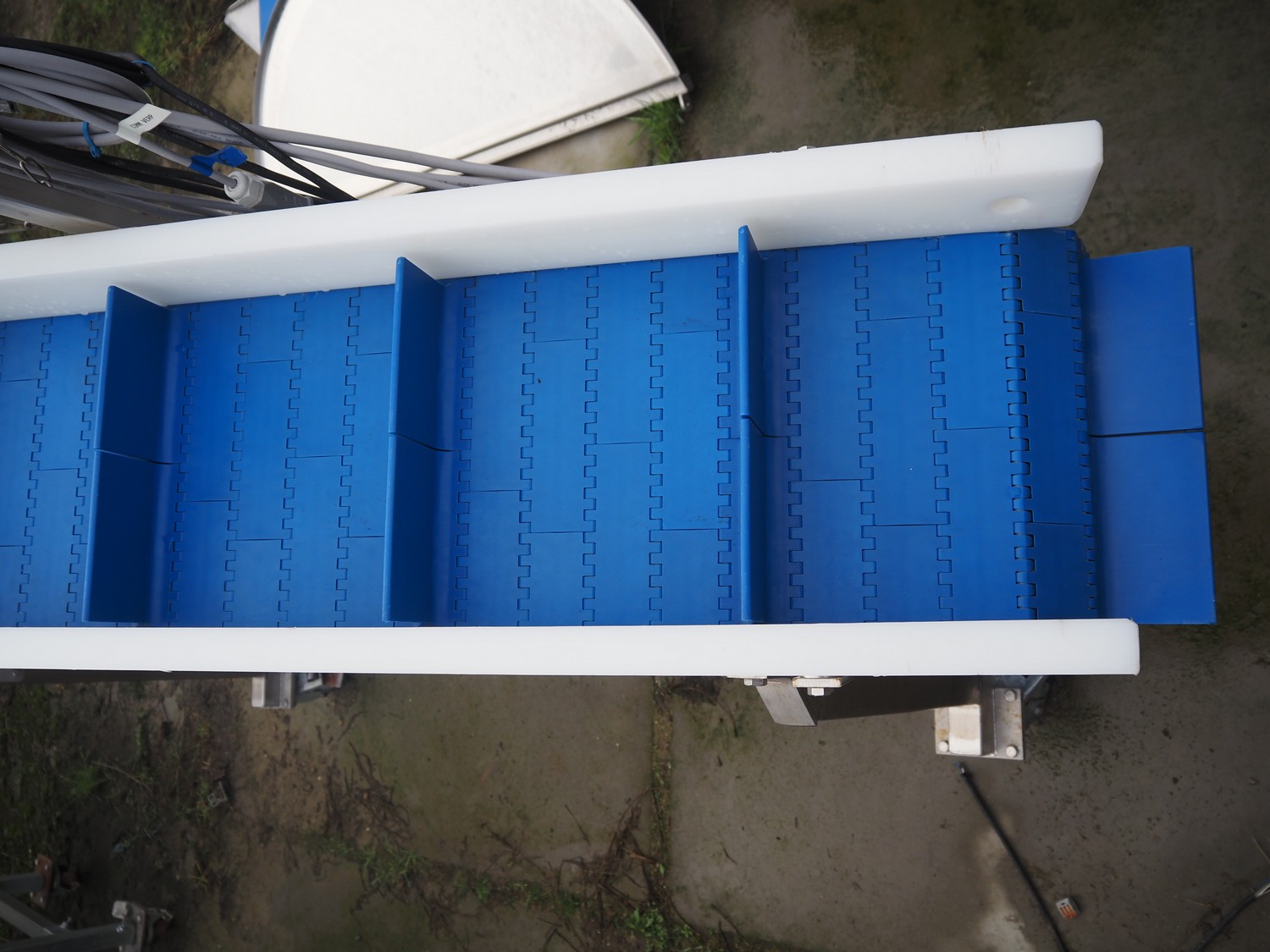 Elevating belt, plastic belt, belt width: 300 mm, distance between dividers: 250 mm, divider height: 70 mm, total dimensions: 2000 mm x 570 mm x 1540 mm.