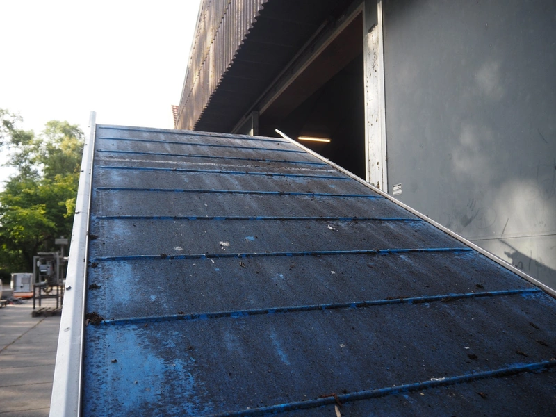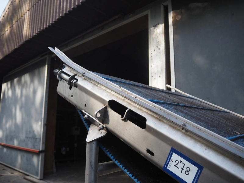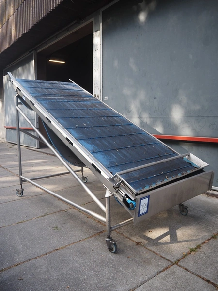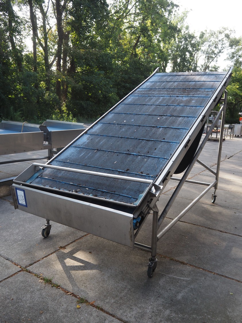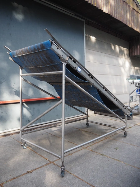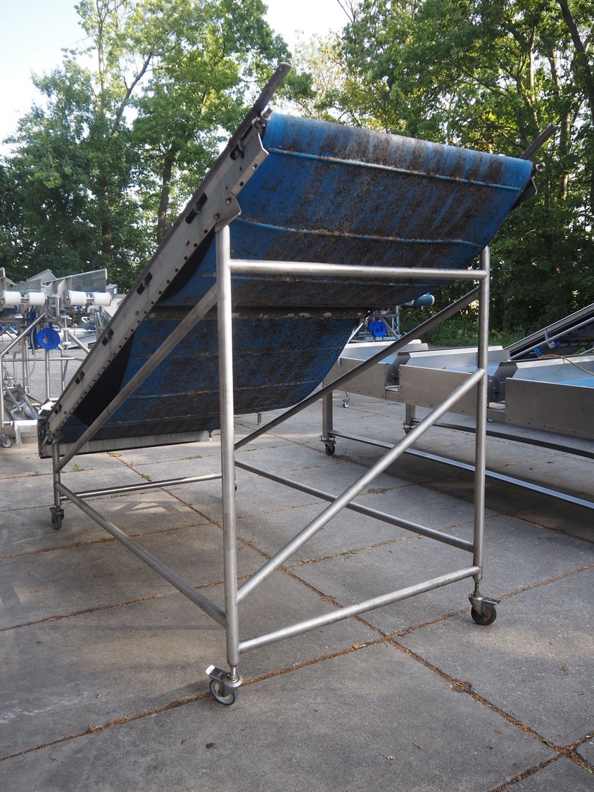 Mobile elevating belt, plastic belt, belt width: 1320 mm, elevating height: 2220 mm, total dimensions: 3200 mm x 1550 mm x 2400 mm.