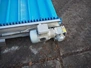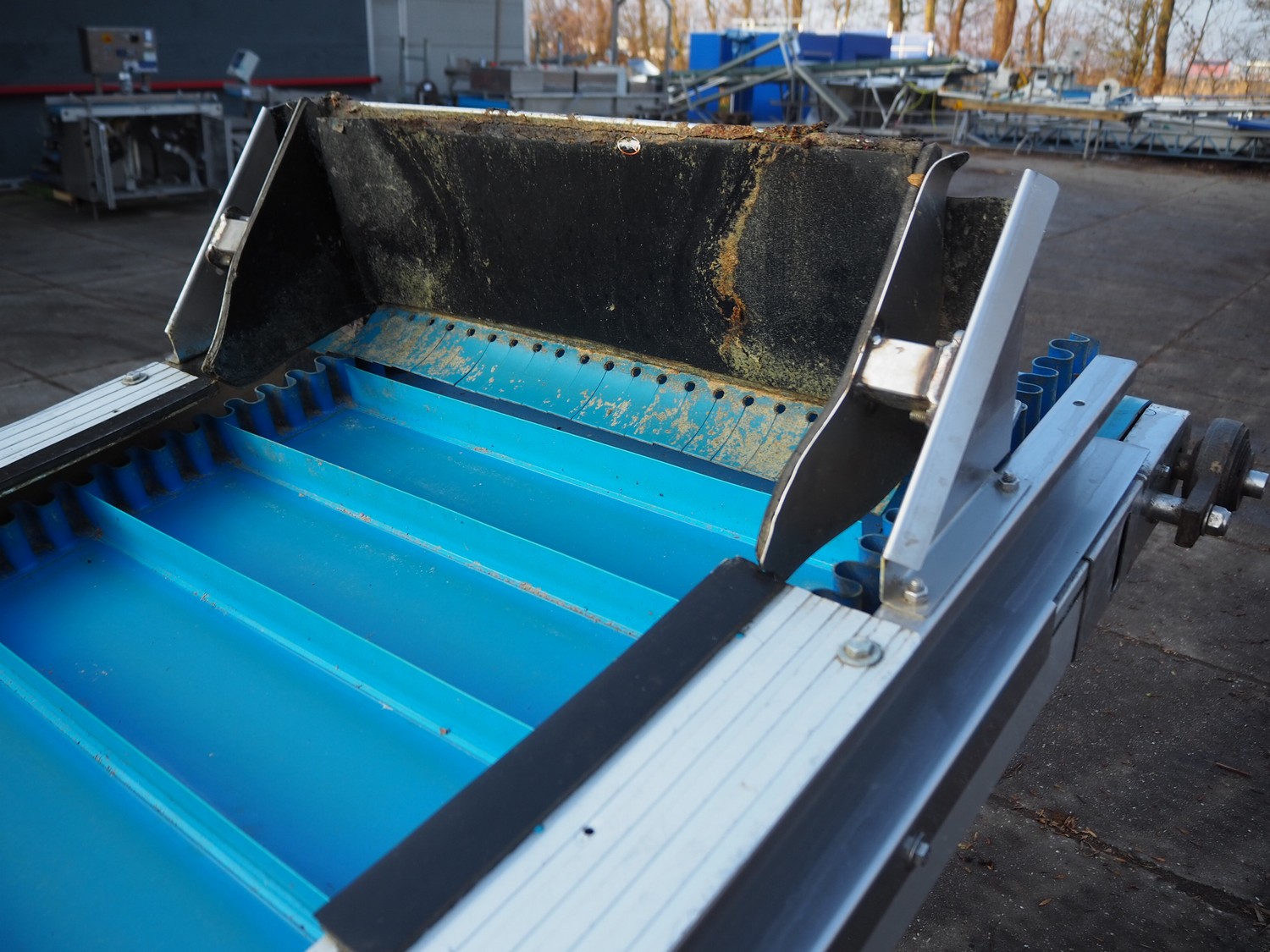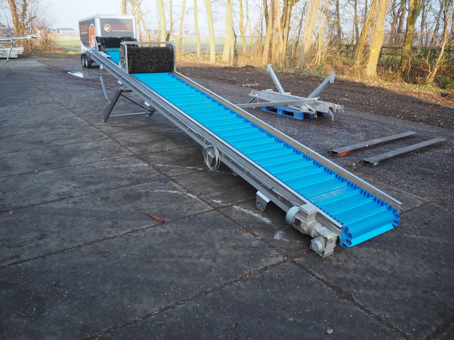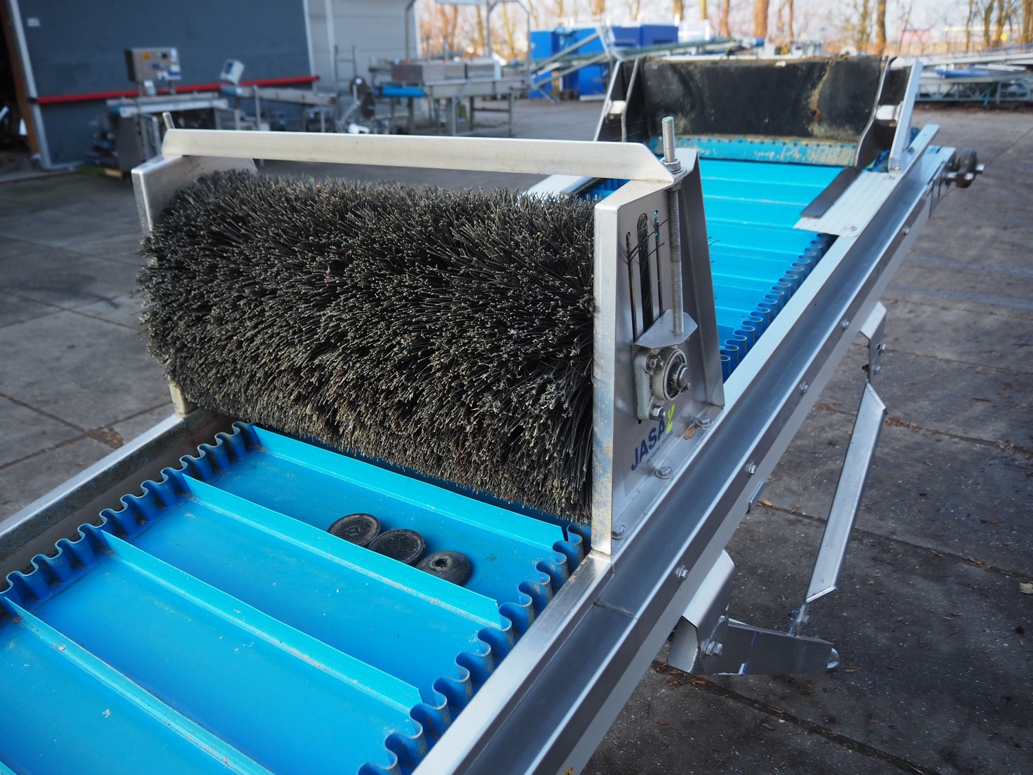 Jasa Packaging Systems elevating belt with brush, type: OPVOERBAND, machine number: JA 12517, year of construction: 2015, 240 V, 3 Ph, 0.75 kW, plastic belt and dividers, belt width: 620 mm, distance between dividers: 150 mm, divider height: 50 mm, elevating height: 4250 mm, brush width: 770 mm, total dimensions: 4900 mm x 1150 mm x 4400 mm.