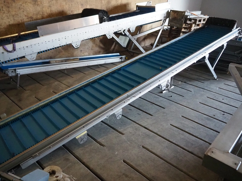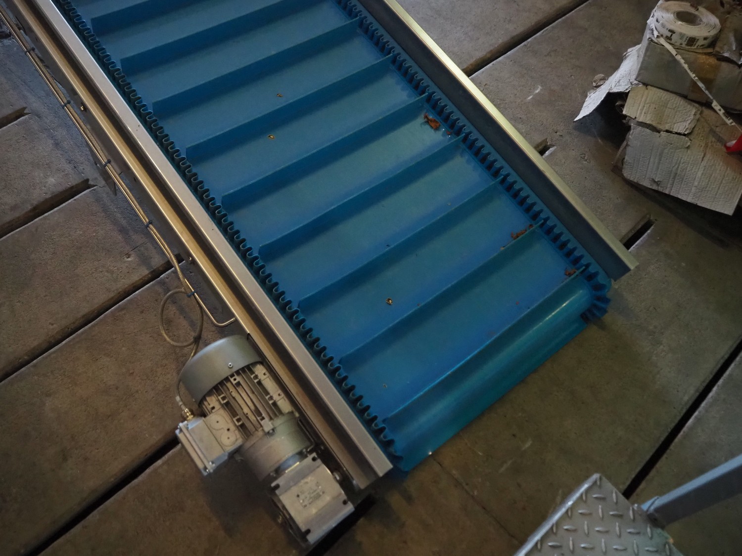 Jasa Packaging Systems elevating belt, type: SAM, OPVOERBAND, model: 18100760500000, machine number: 14127, year of construction: 2018, 400 V, 3 Ph, 3.05 A, 0.75 kW, plastic belt and dividers, belt width: 620 mm, distance between dividers: 150 mm, divider height: 50 mm, elevating height: 4250 mm, brush width: 770 mm, total dimensions: 4900 mm x 1150 mm x 4400 mm.
