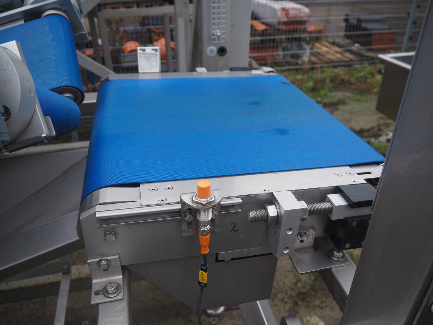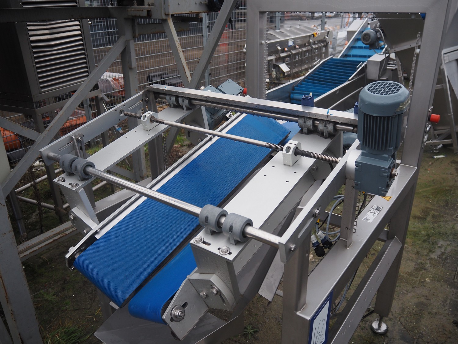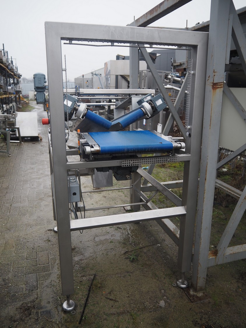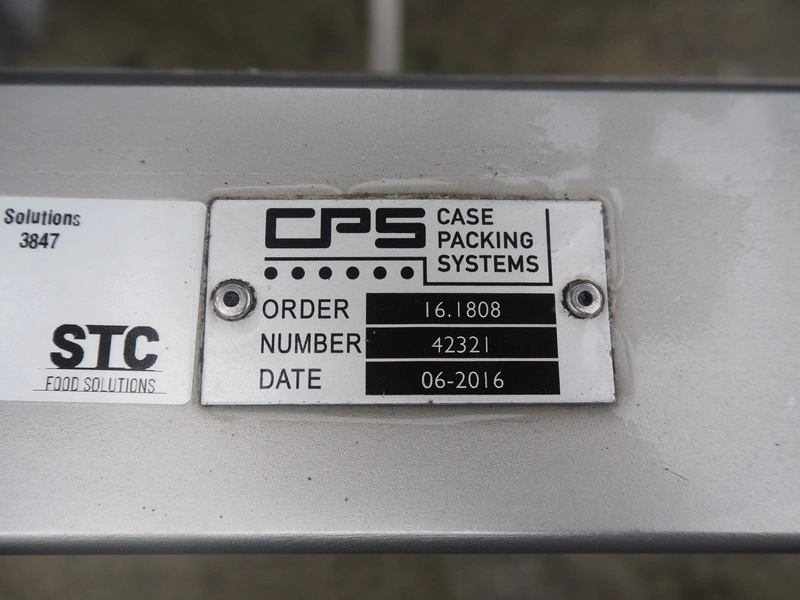 CPS Case Packing Systems buffer belt, number: 42321, year of construction: 06-2016, plastic belt, belt width: (2x) 200 mm and 450 mm, total dimensions: 1550 mm x 980 mm x 1840 mm.