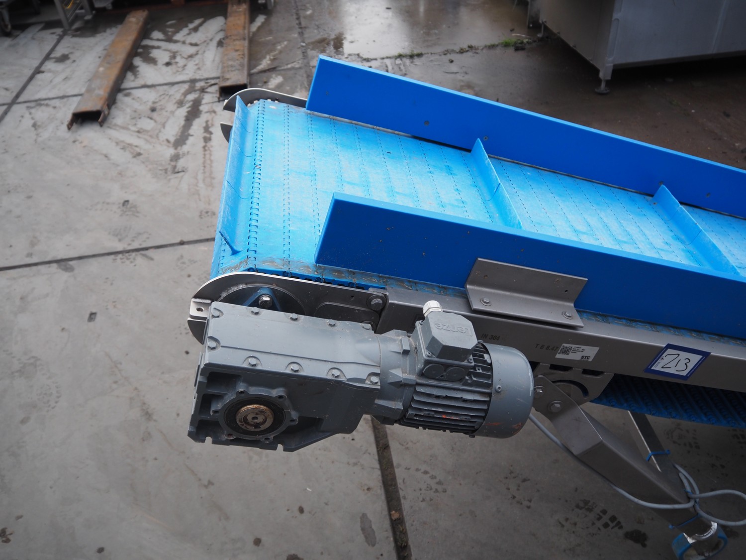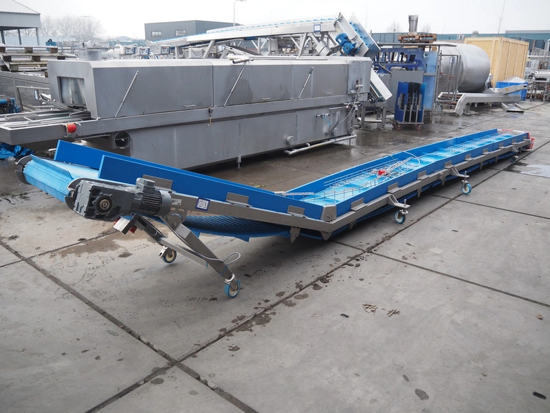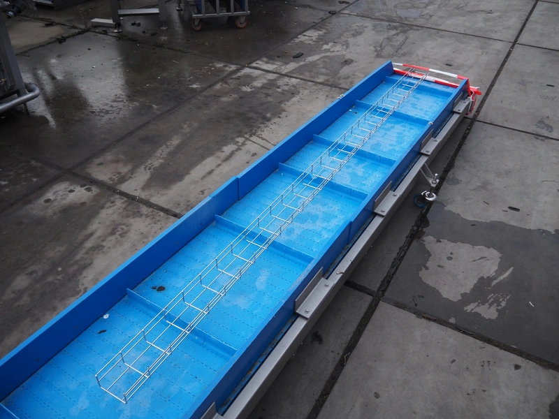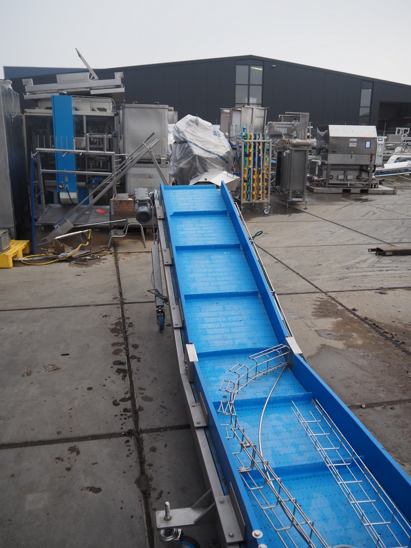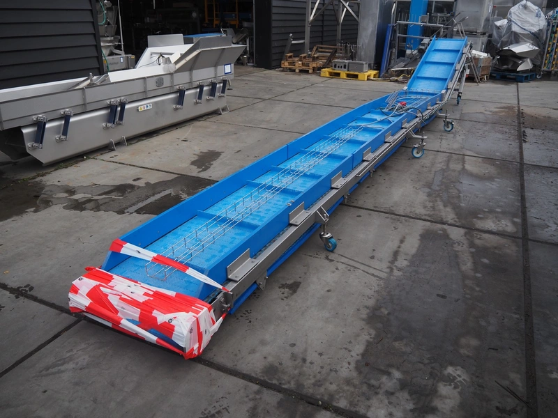 Elevating belt, plastic belt, belt width: 605 mm, distance between dividers: 520 mm, divider height: 50 mm, total dimensions: 8400 mm x 1100 mm x 1080 mm.