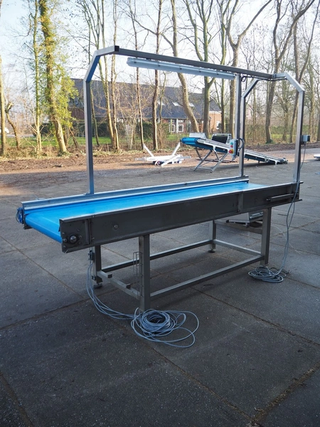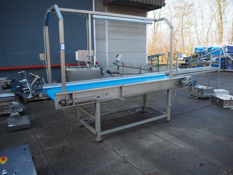 Transport belt with s/s frame and plastic belt, belt width: 800 mm, total dimensions: 3300 mm x 1100 mm x 2350 mm.