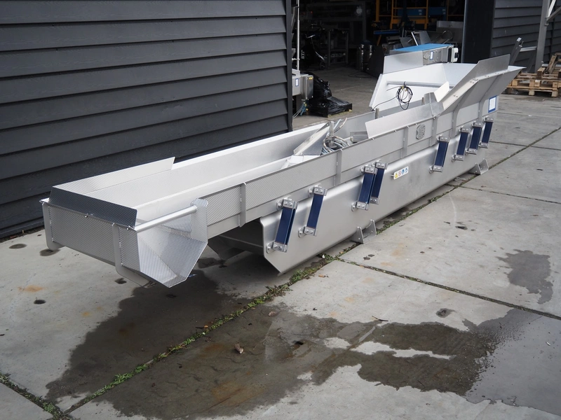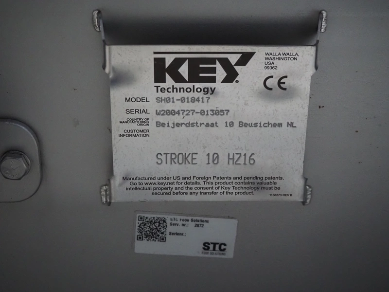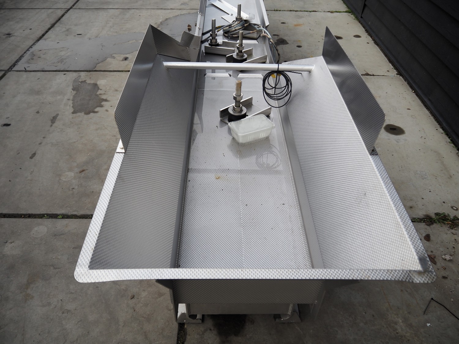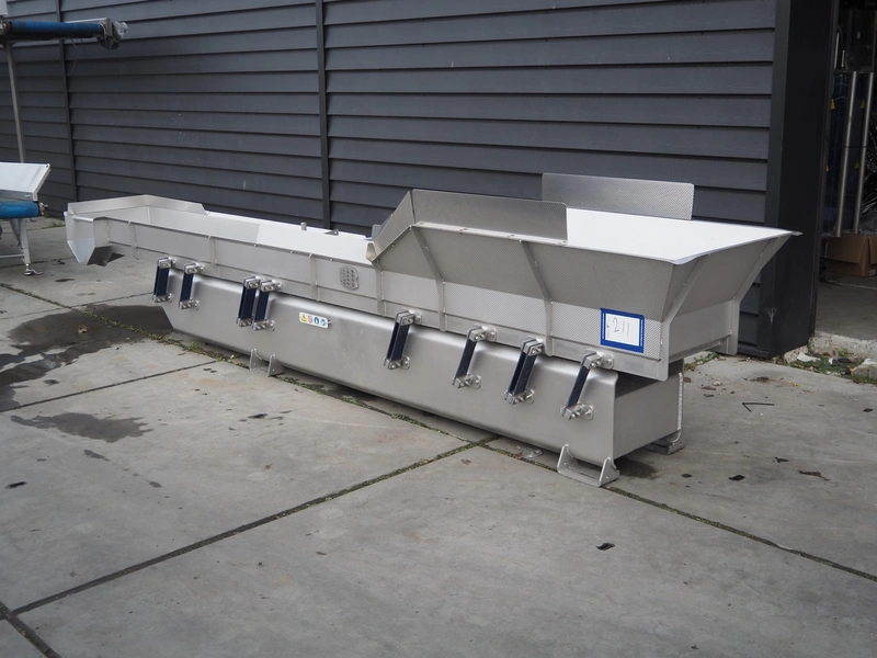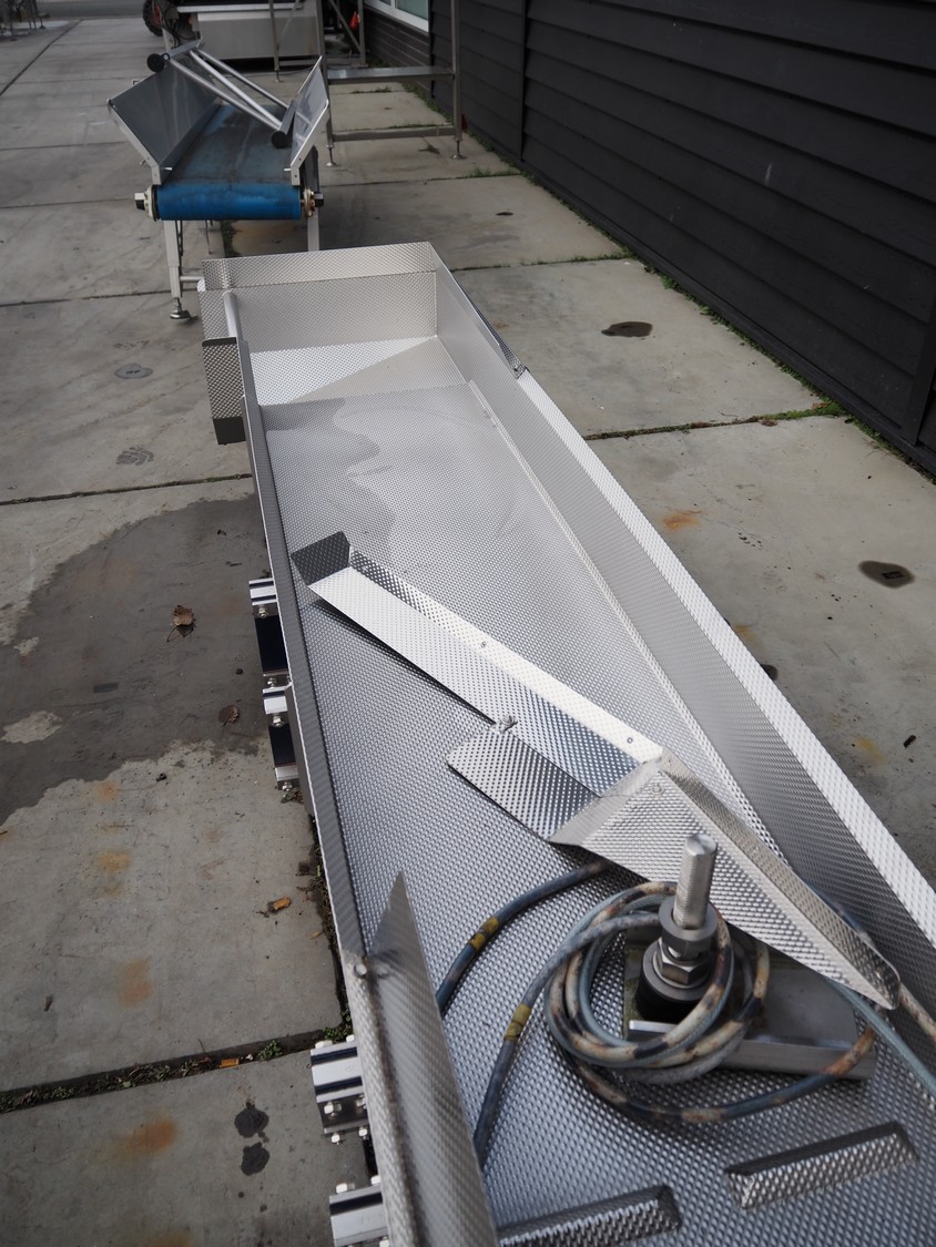Key Technology vibrating gutter, model: SH01-018417, serial: W2004727-013057, gutter width: 500 mm, total dimensions: 4600 mm x 900 mm x 1100 mm. Without motors.