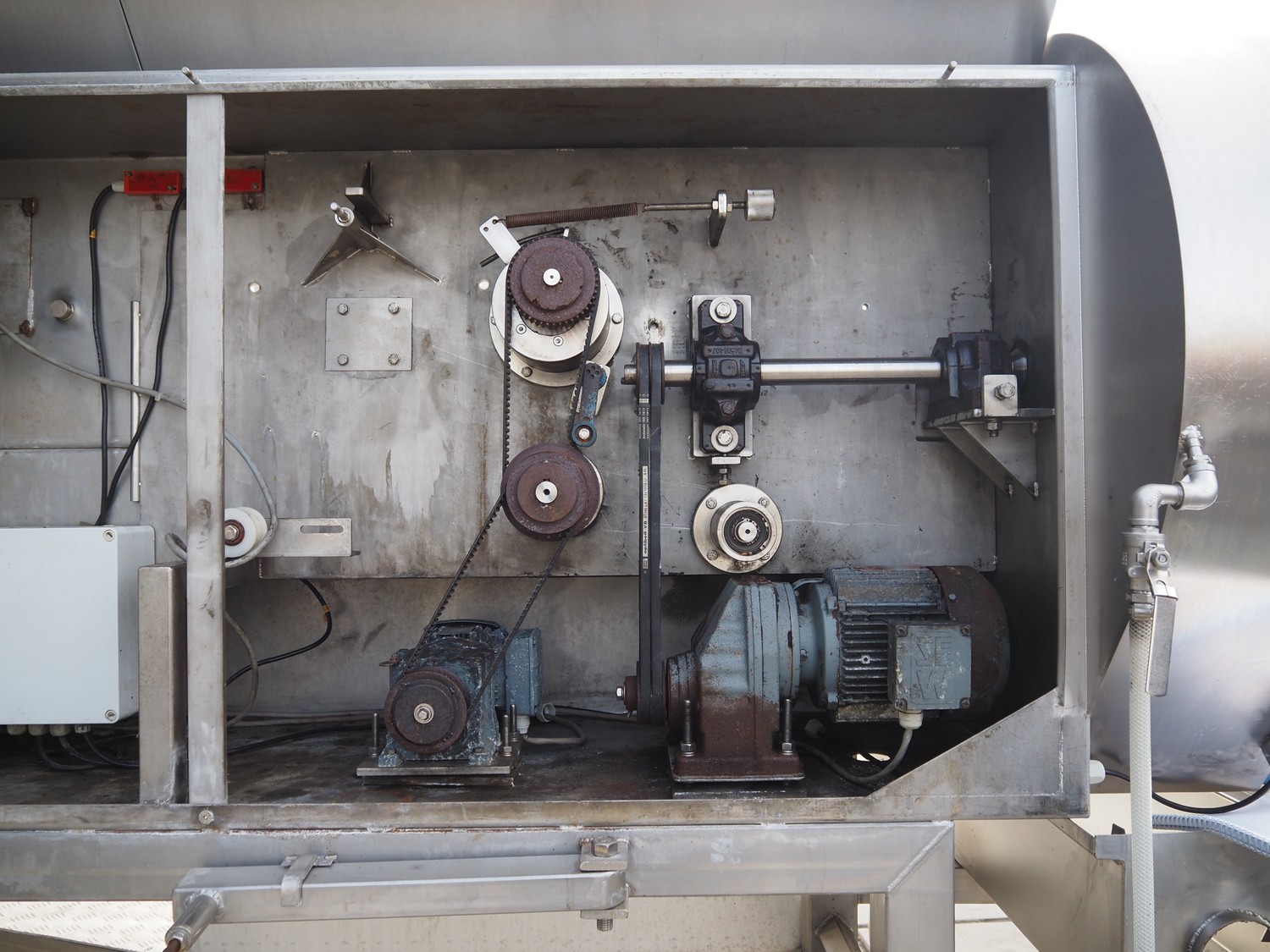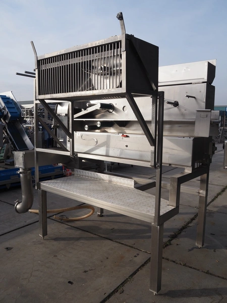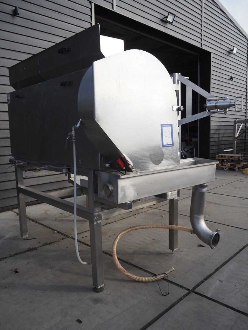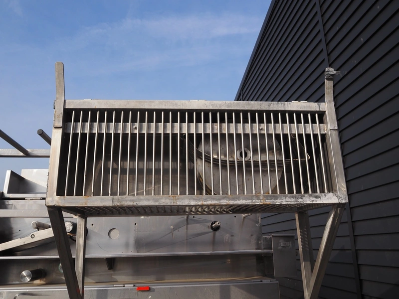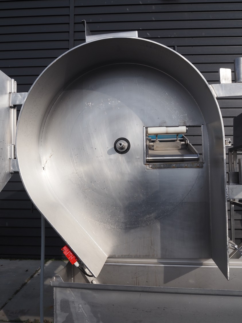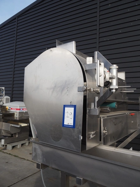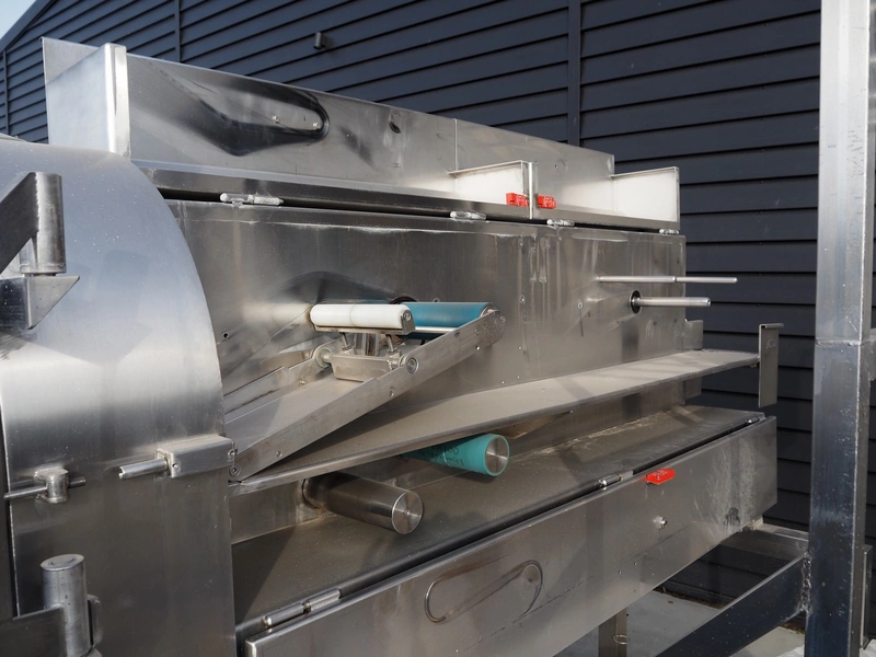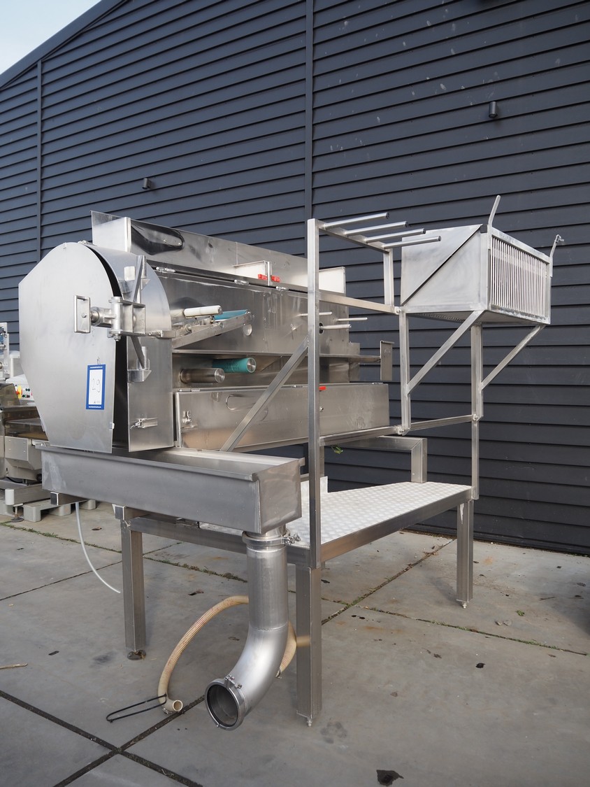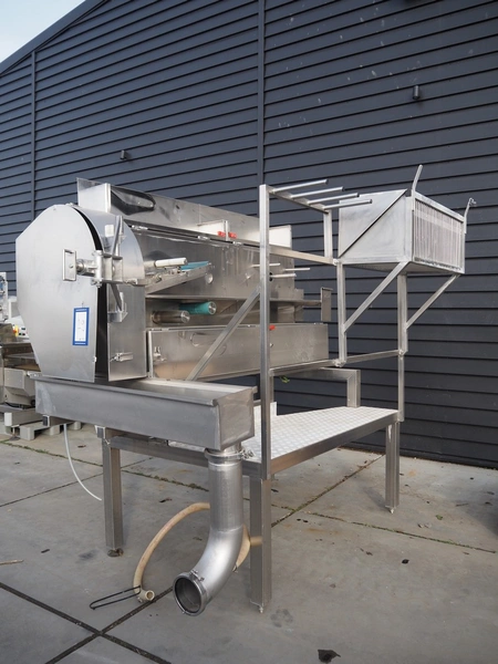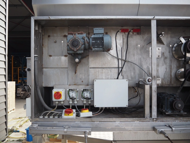 Eillert B.V. slicer, type: G 4400 VS, 230 V, 1 Ph, 10.9 A, plastic belt, belt width: 250 mm, diameter knife: 365 mm, total dimensions: 2900 mm x 2000 mm x 2380 mm. Incomplete.