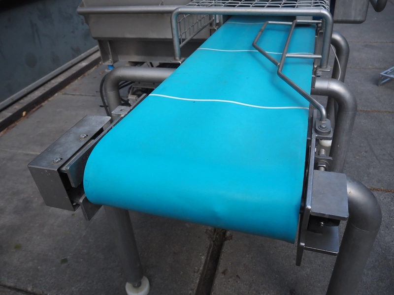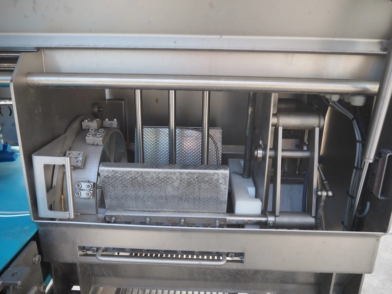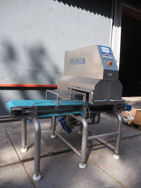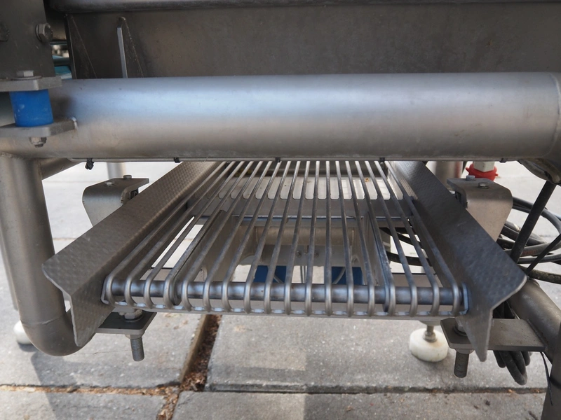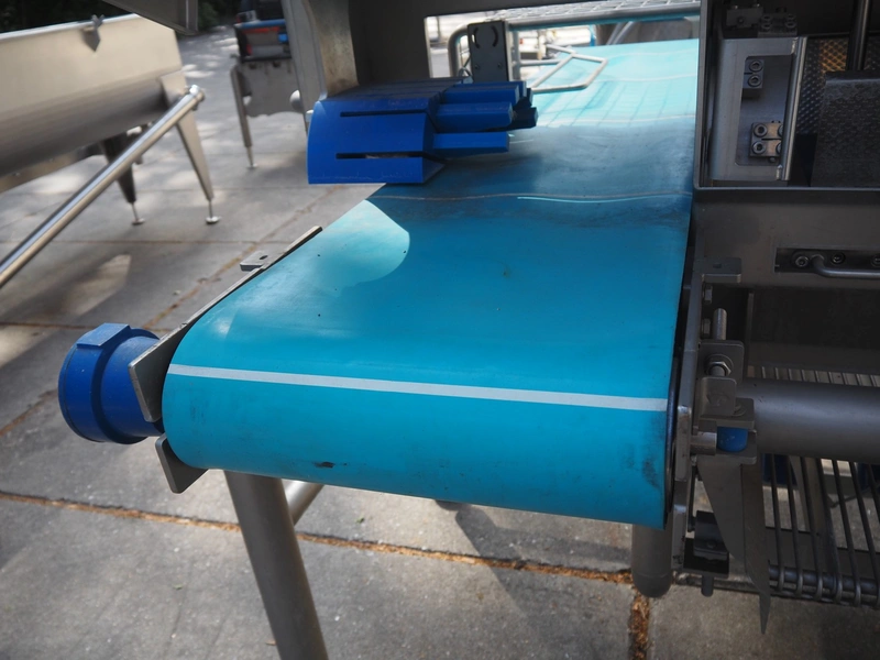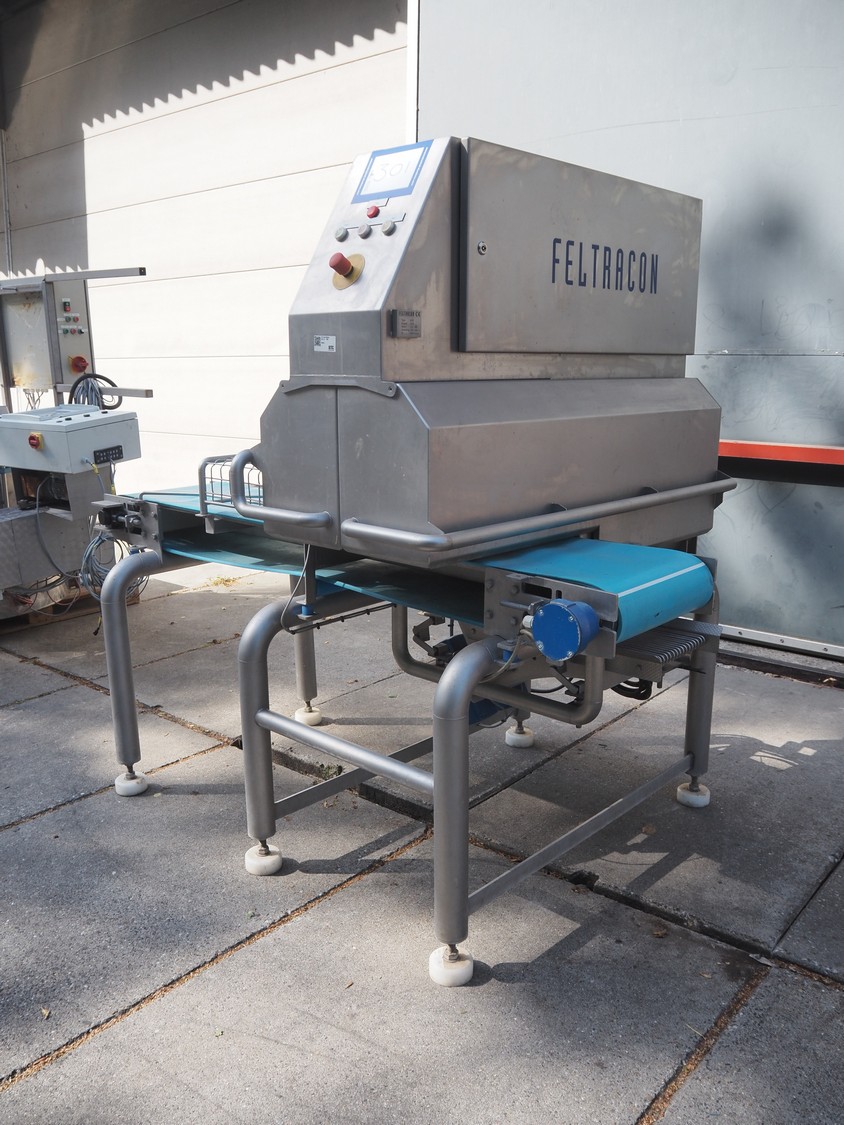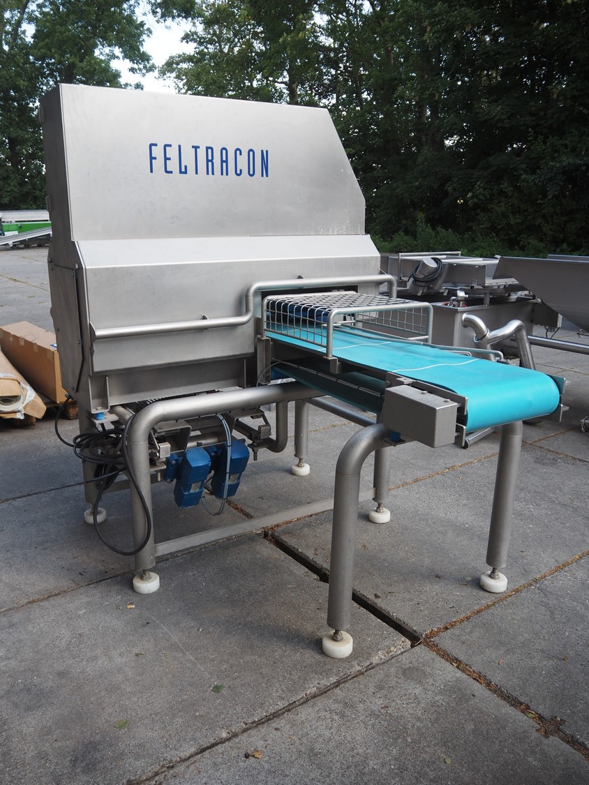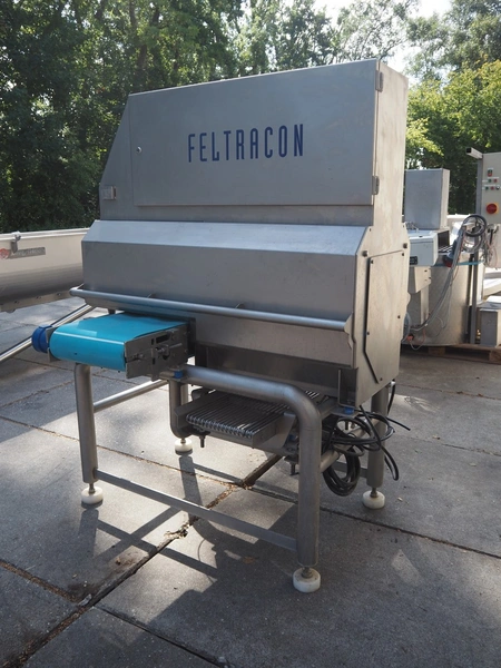 Feltracon melon slicer, type: 61D, number 3814-61D1, year of construction: 2010, 230/400 V, 0.6 kW, plastic belt, belt width: 400 mm, working width: 300 mm, distance between knives: 40 mm, vibrating gutter, gutter width: 330 mm, total dimensions: 2000 mm x 1400 mm x 1860 mm.