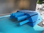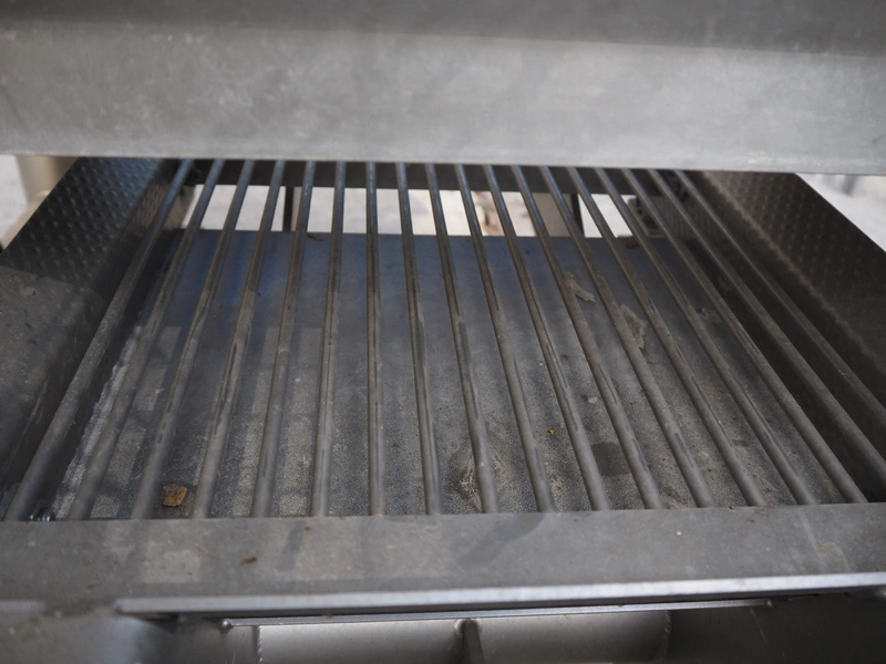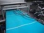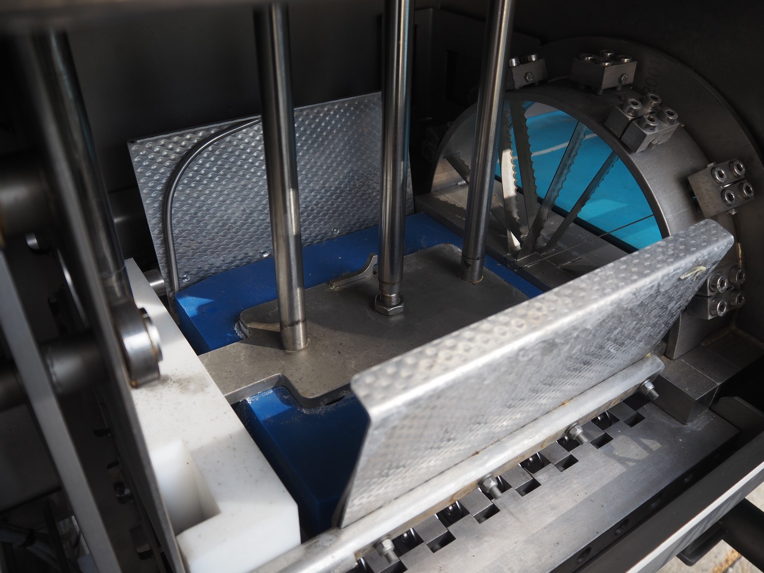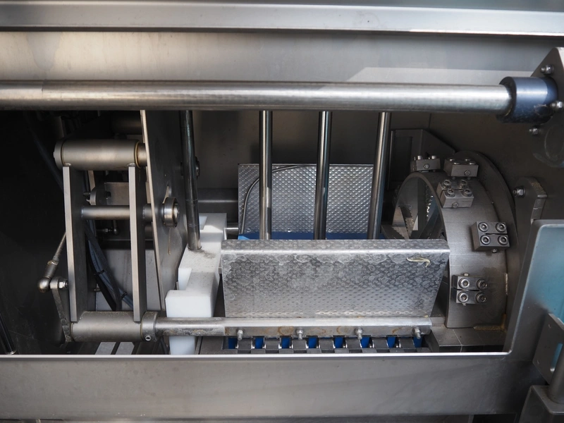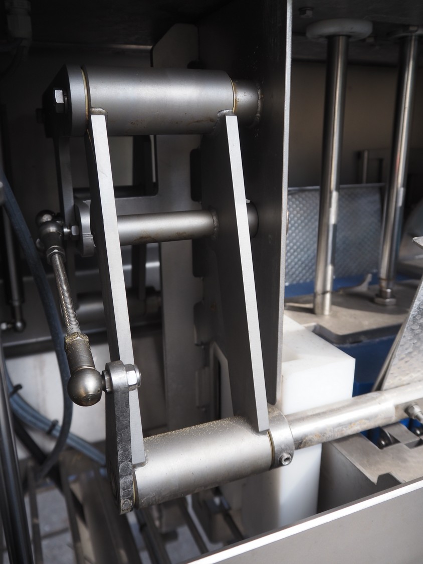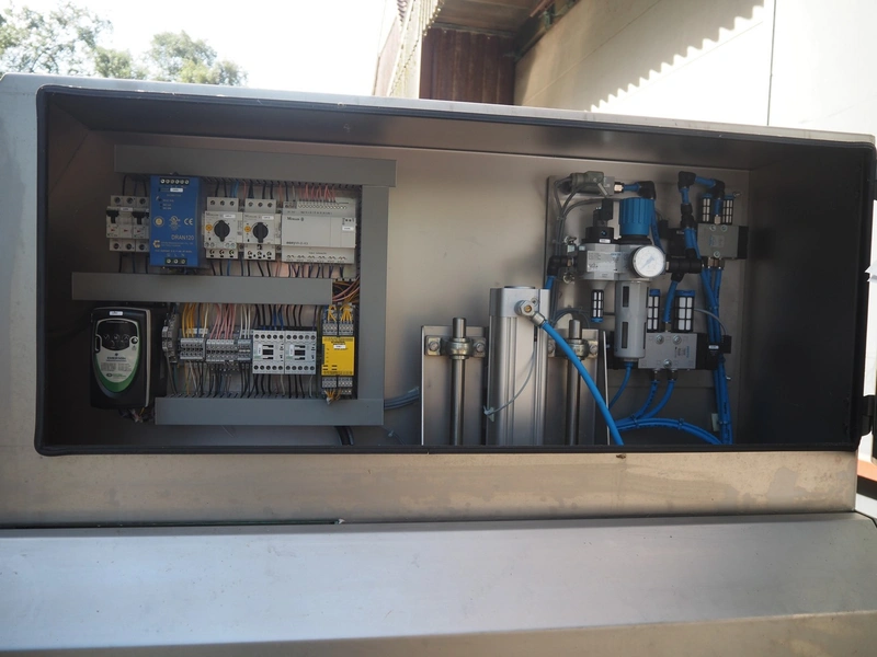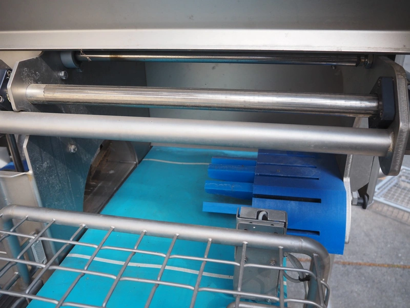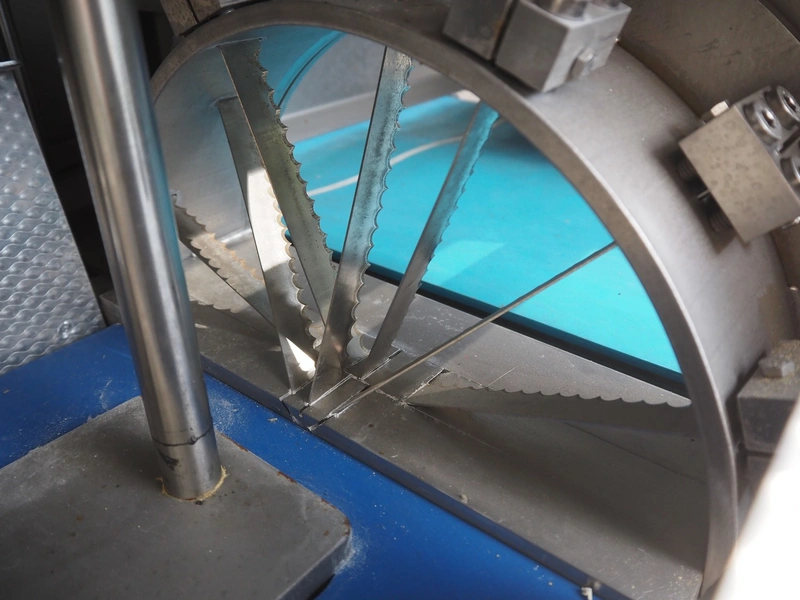 Feltracon melon slicer, type: 61D, number 3814-61D1, year of construction: 2010, 230/400 V, 0.6 kW, plastic belt, belt width: 400 mm, working width: 300 mm, distance between knives: 40 mm, vibrating gutter, gutter width: 330 mm, total dimensions: 2000 mm x 1400 mm x 1860 mm.