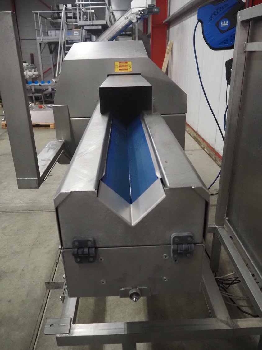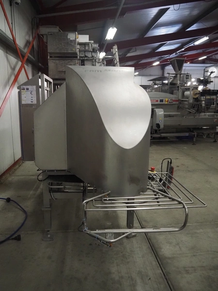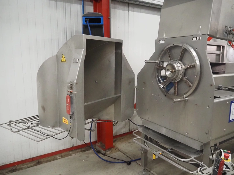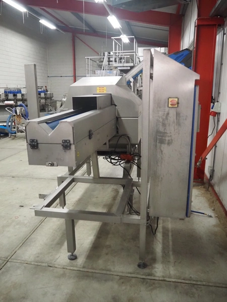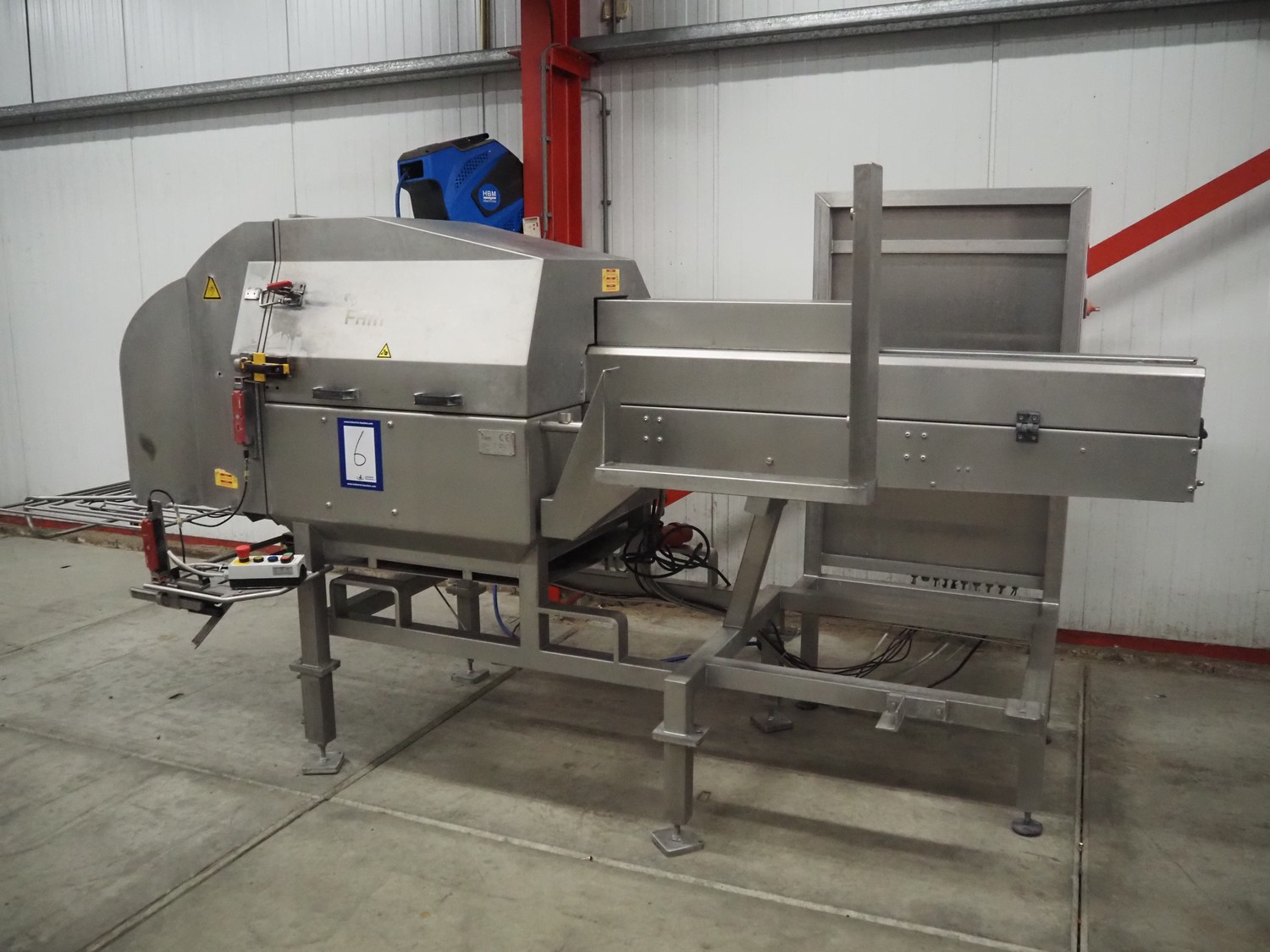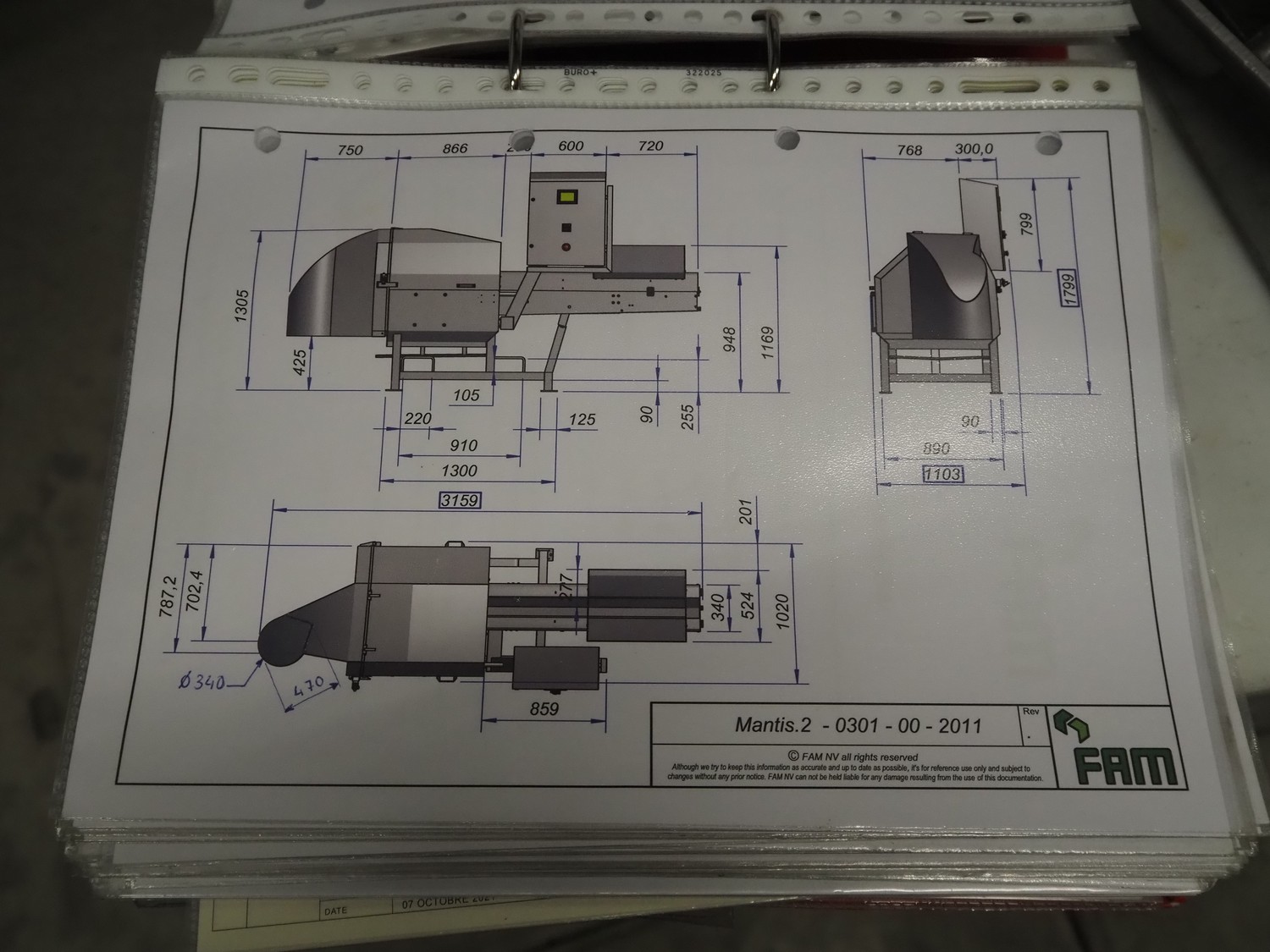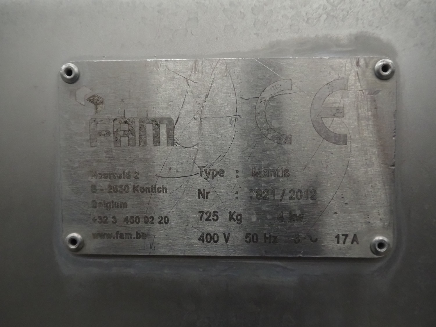 FAM mobile slicer, type: Mantis, number: 7821, year of construction: 2012, 400 V, 3 Ph, 50 Hz, 17 A, 4 kW, weight: 725 kg, plastic V-belt, belt width: (2x) 100 mm, total dimensions: 3200 mm x 1450 mm x 1700 mm.