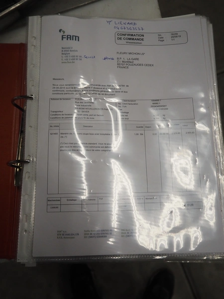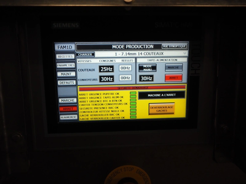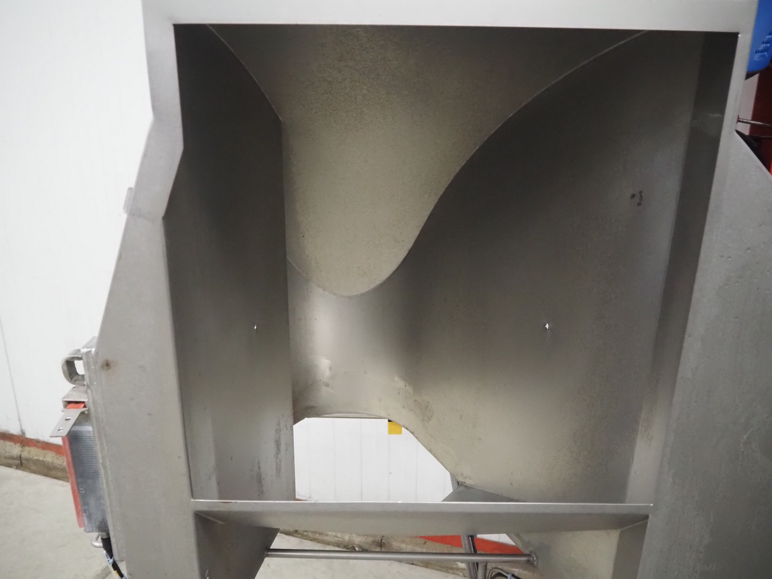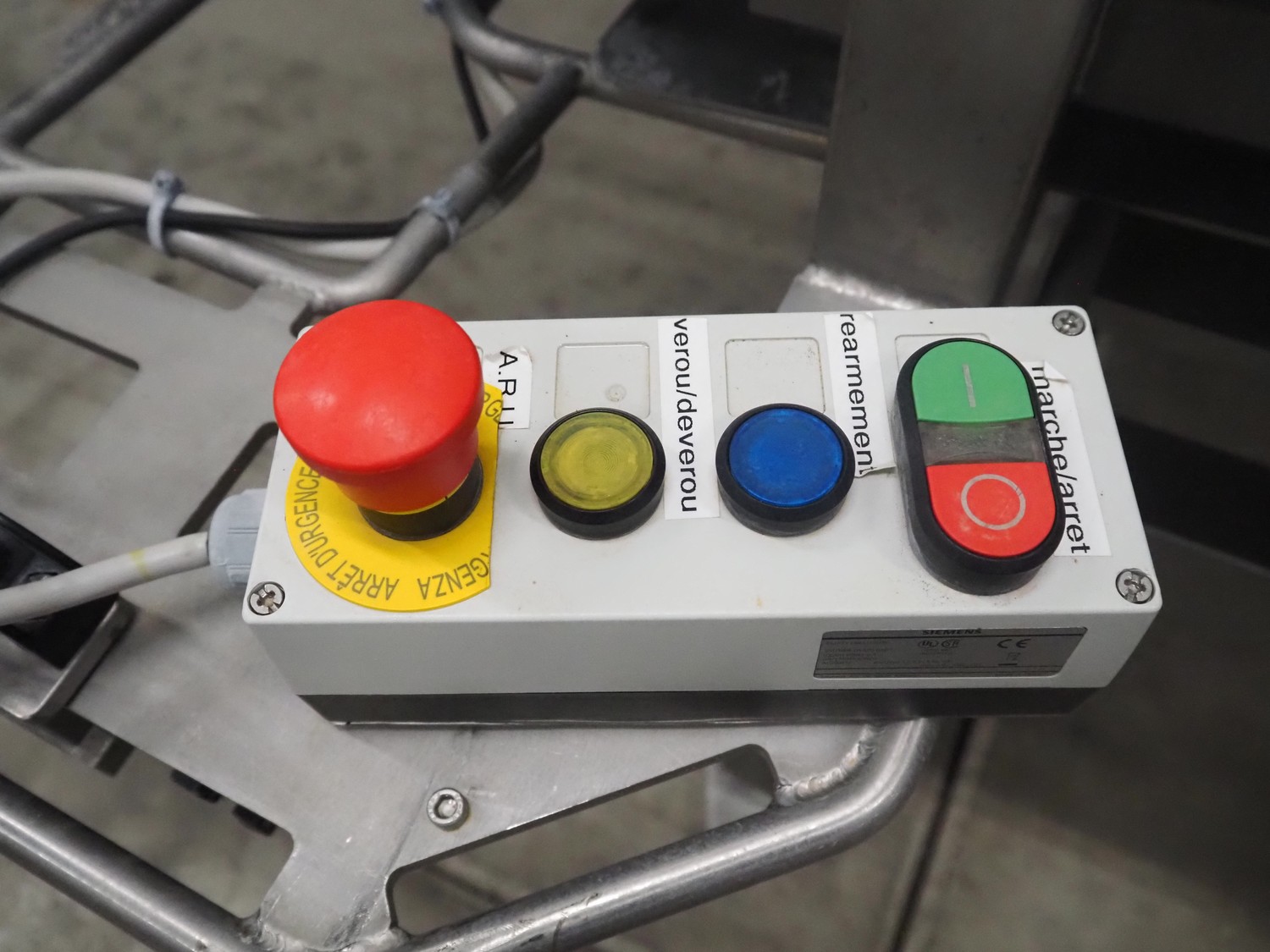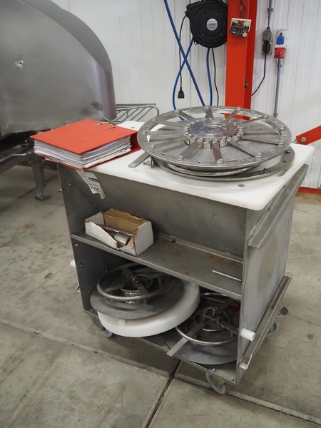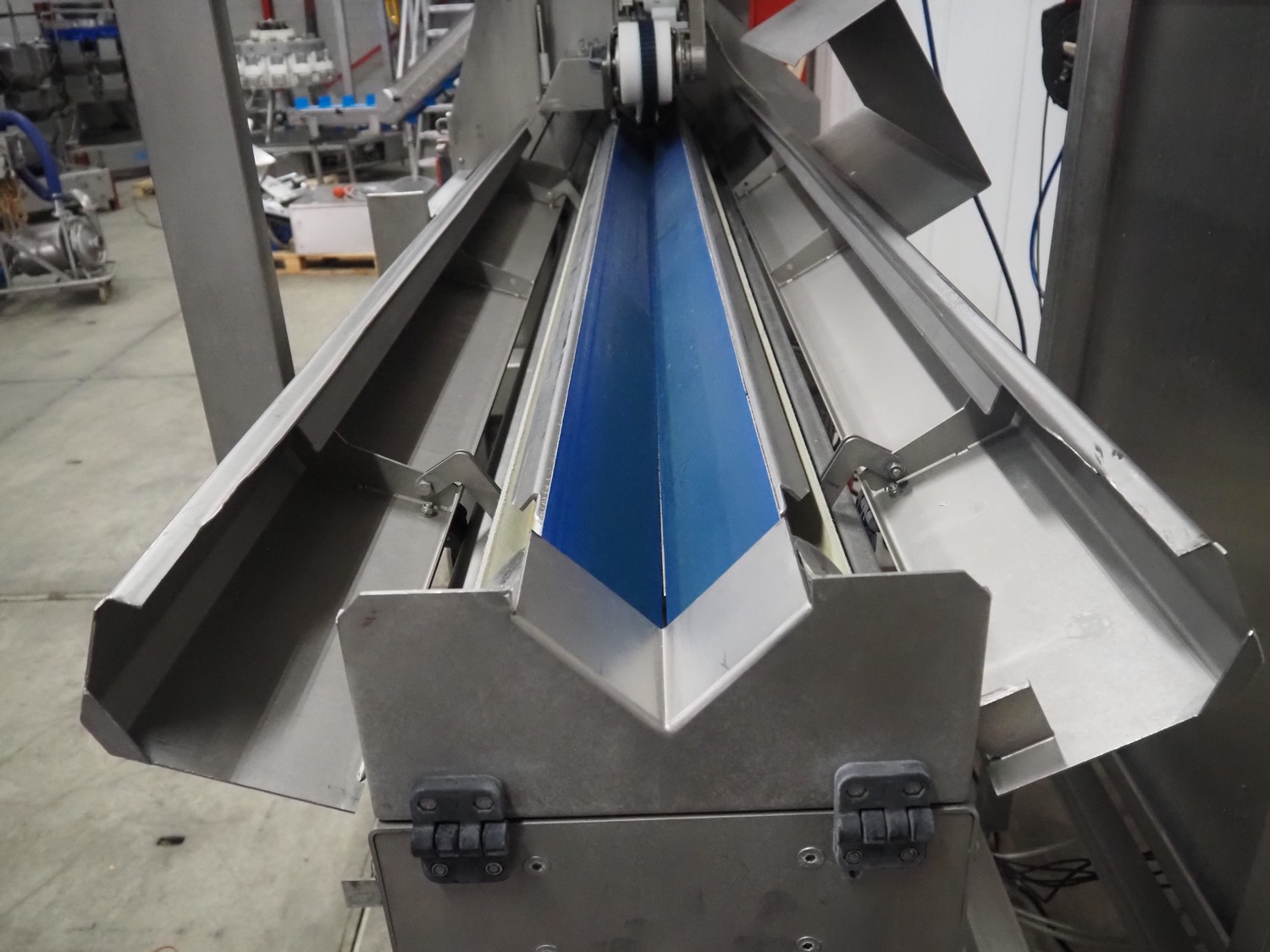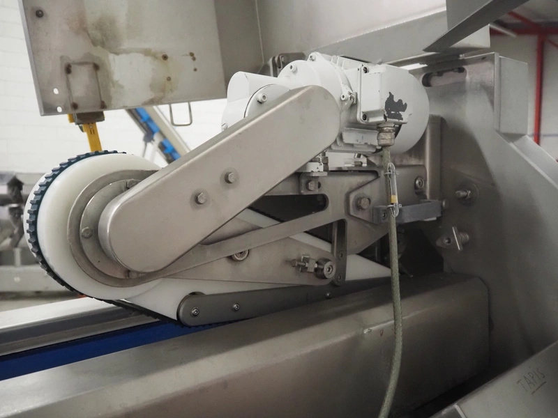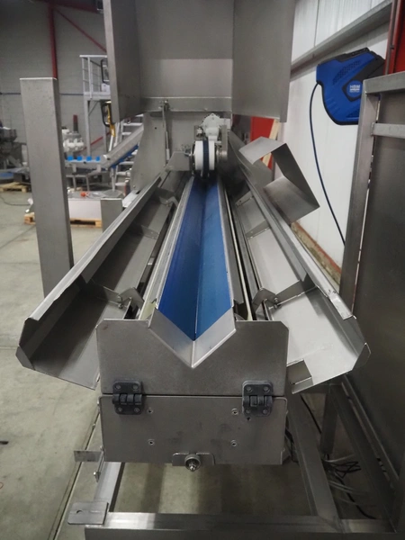 FAM mobile slicer, type: Mantis, number: 7821, year of construction: 2012, 400 V, 3 Ph, 50 Hz, 17 A, 4 kW, weight: 725 kg, plastic V-belt, belt width: (2x) 100 mm, total dimensions: 3200 mm x 1450 mm x 1700 mm.