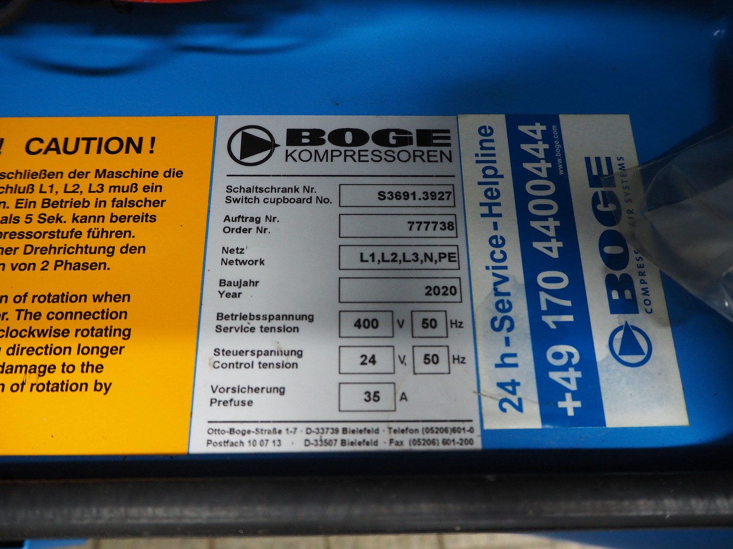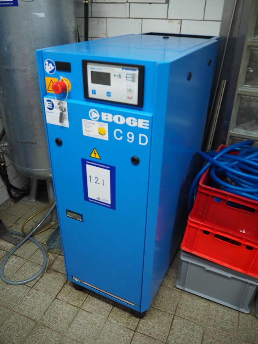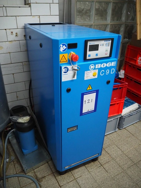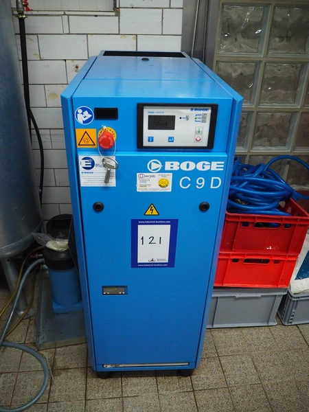 Boge Kompressoren air compressor, type: C 9 D, machine number: 5153071, year of construction: 09-2020, volume: 0.870 m³/min, pressure: 13 bar, motor: 3000 rates per minute, motor capacity: 7.5 kW, total dimensions: 500 mm x 1000 mm x 1250 mm.