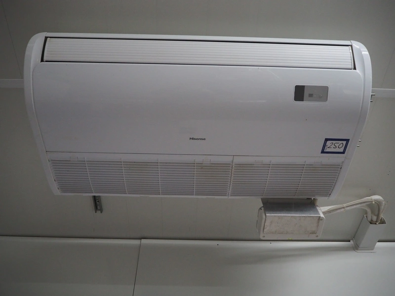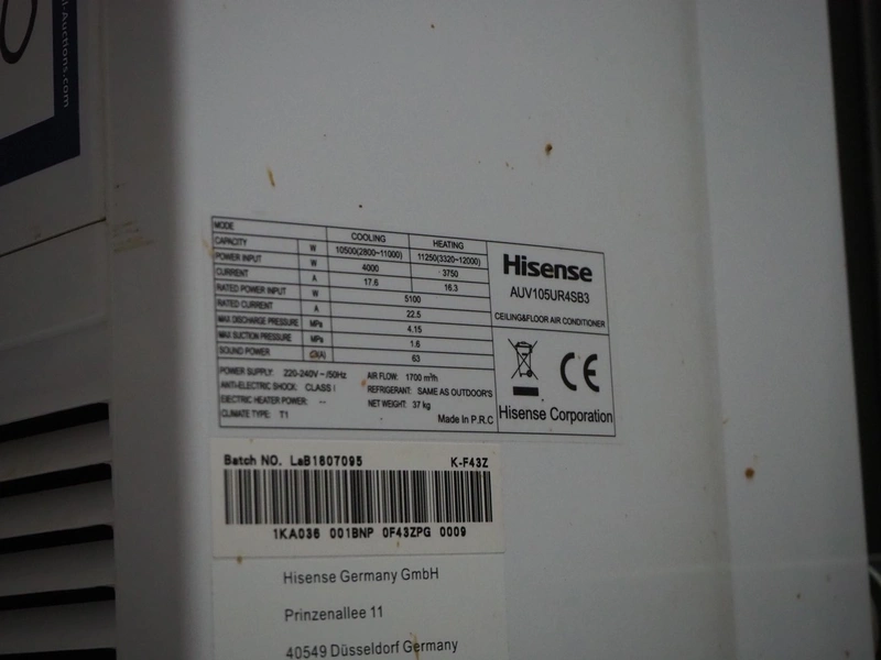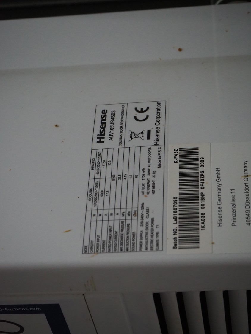 Hisense ceiling and floor air conditioner, model: AUV105UR4SB3, 220-240 V, 1 Ph, 50 Hz, rated current: 22.5 A, cooling capacity: 10500 W, heating capacity: 11250 W, air flow: 1700 m³ per hour, dimensions indoor unit: 1500 mm x 800 mm x 300 mm, including Hisense outdoor unit for airconditioning, 220-240 V, 1 Ph, 50 Hz, refrigerant: R32 / 1.50 kg, dimensions outdoor unit: 1000 mm x 600 mm x 900 mm.