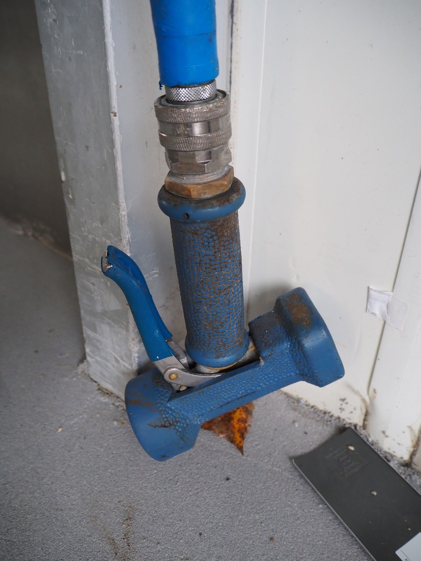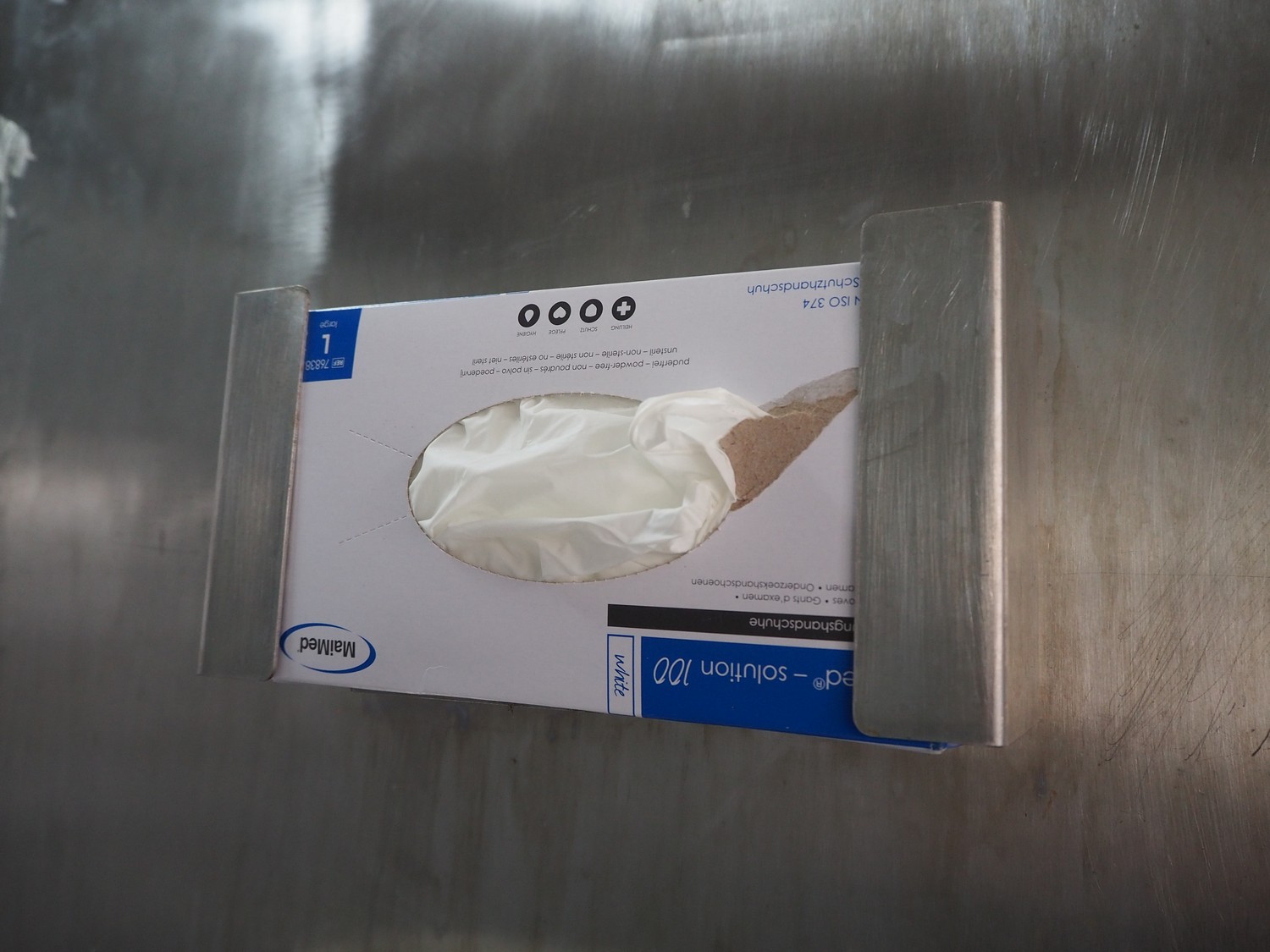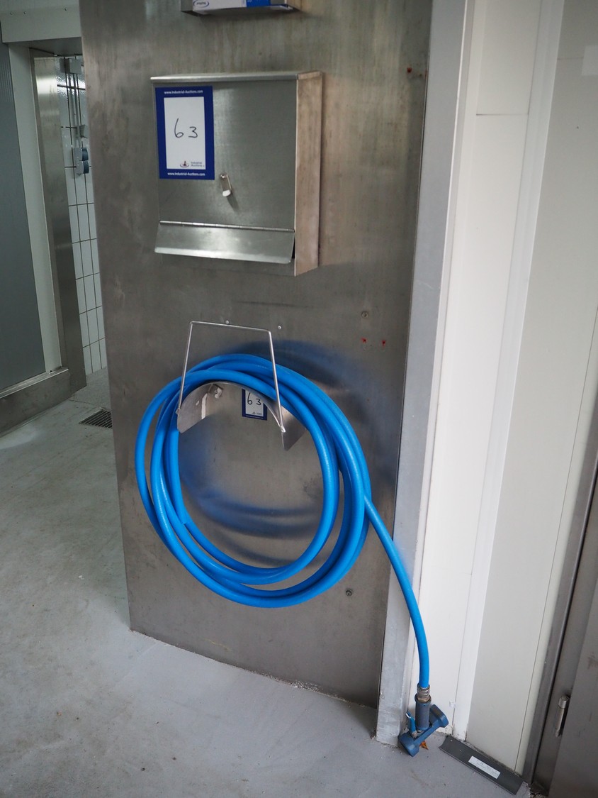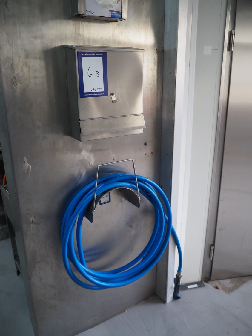 S/s paper dispenser, dimensions: 350 mm x 150 mm x 420 mm, s/s hose reel with hose and spraying gun, dimensions: 320 mm x 150 mm x 300 mm and s/s dispenser for hand gloves.