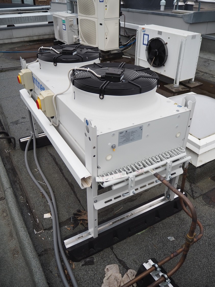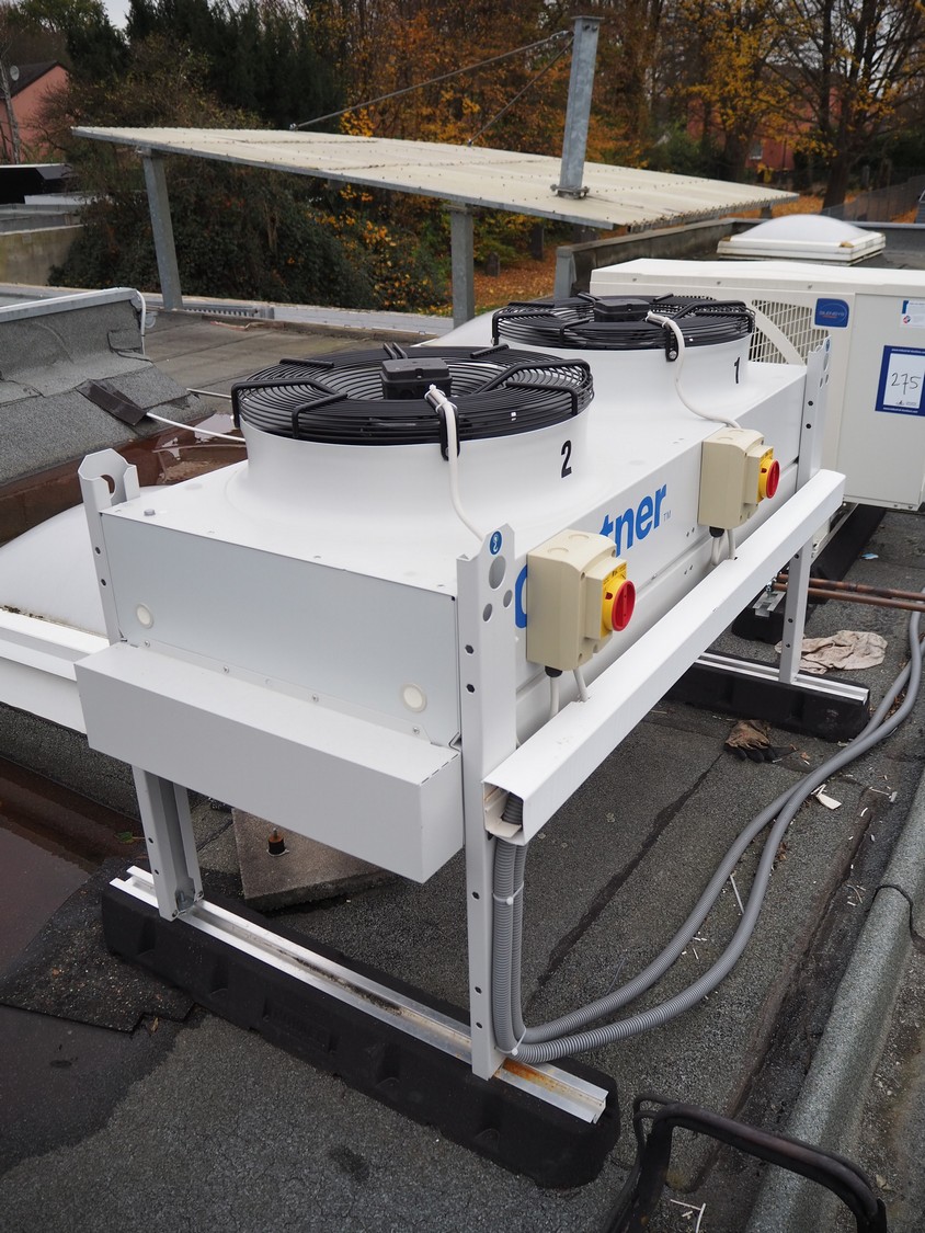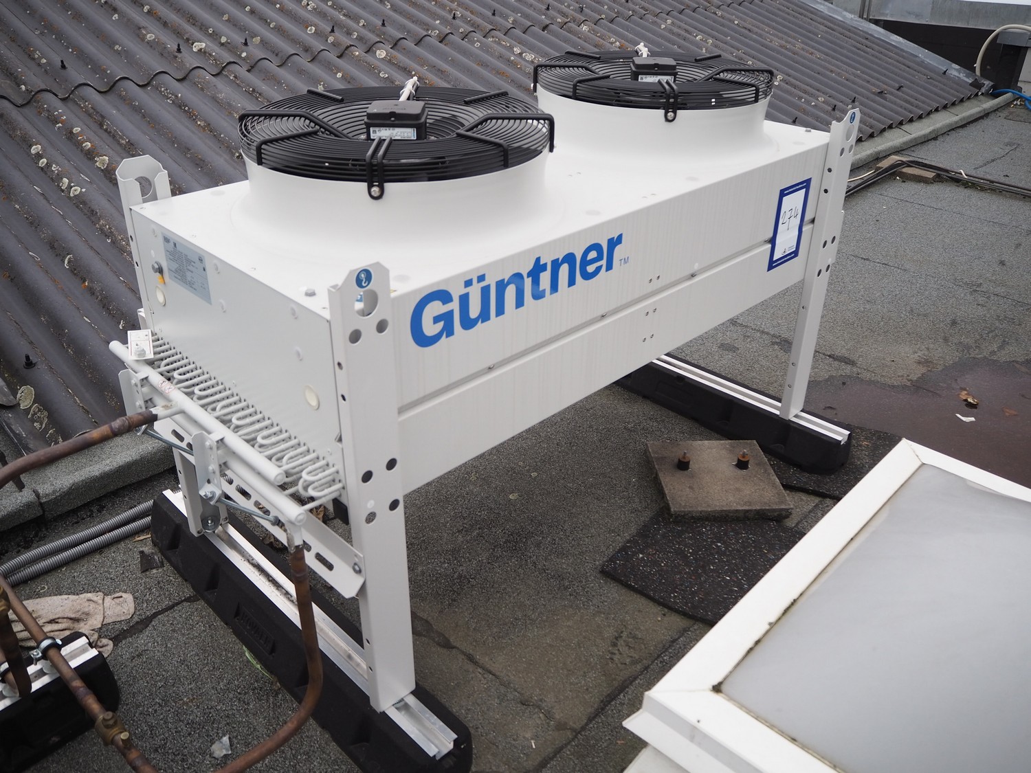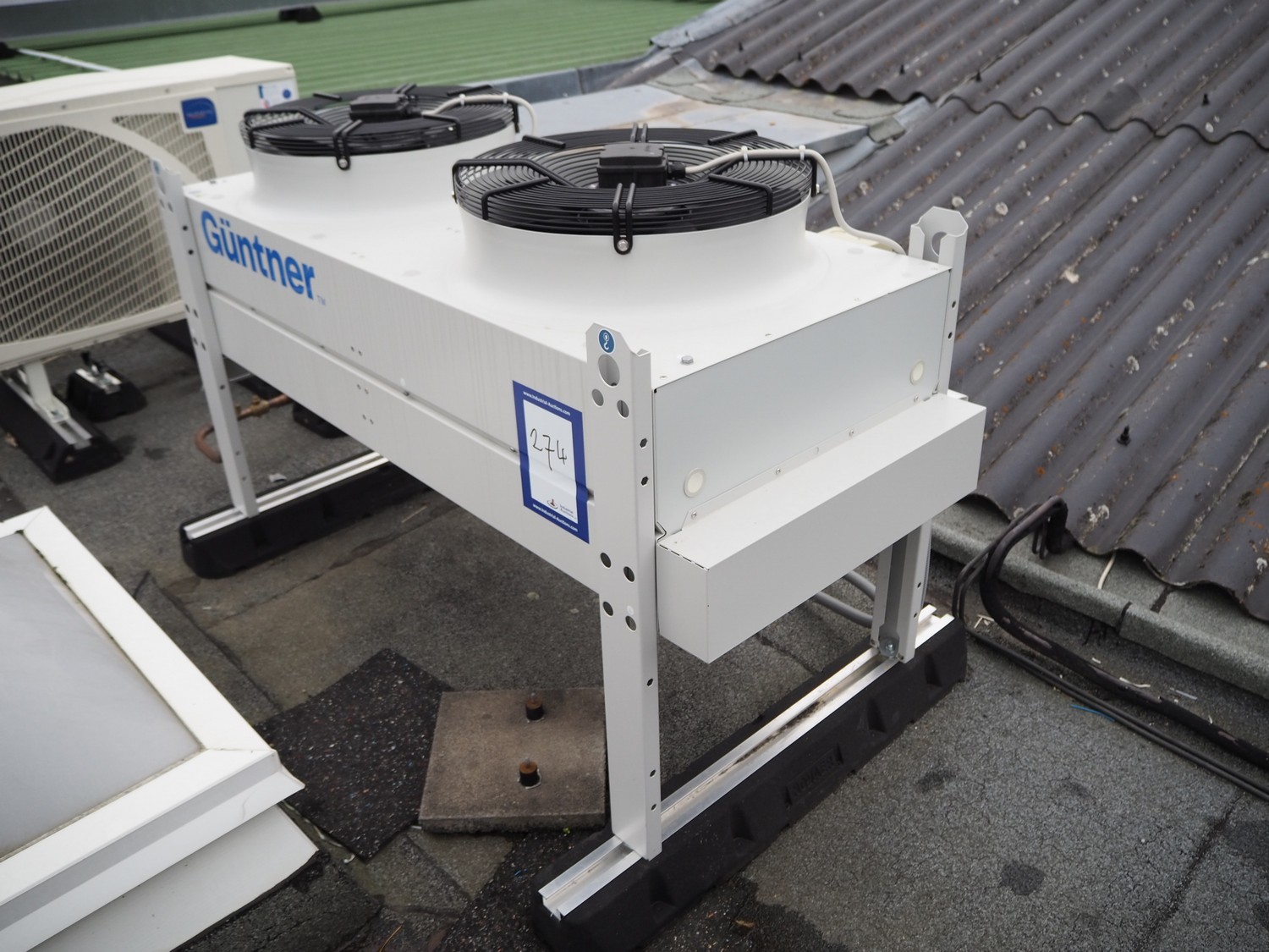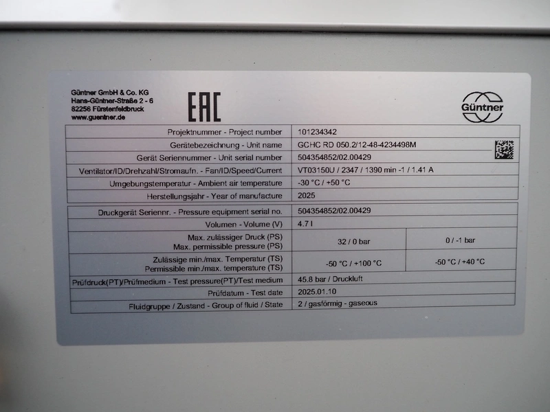 Güntner GmbH & Co. KG roof condenser, unit name: GCHC RD 050.2/12-48-4234498M, unit serial number: 504354852/02.00429, year of construction: 2025, volume: 4.7 liter, maximum permissible pressure: 32 / 0 bar, 0 / - 1 bar, minimum / maximum temperature: -50˚C / +100˚C, -50˚C / + 40˚C, 2 fans, dimensions: 1530 mm x 750 mm x 1000 mm.