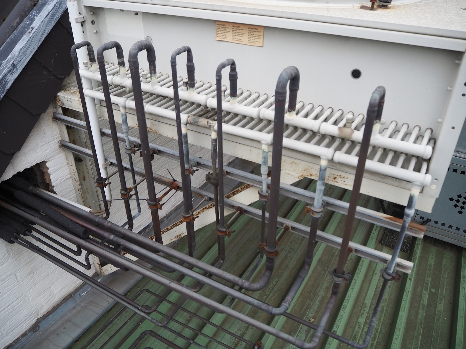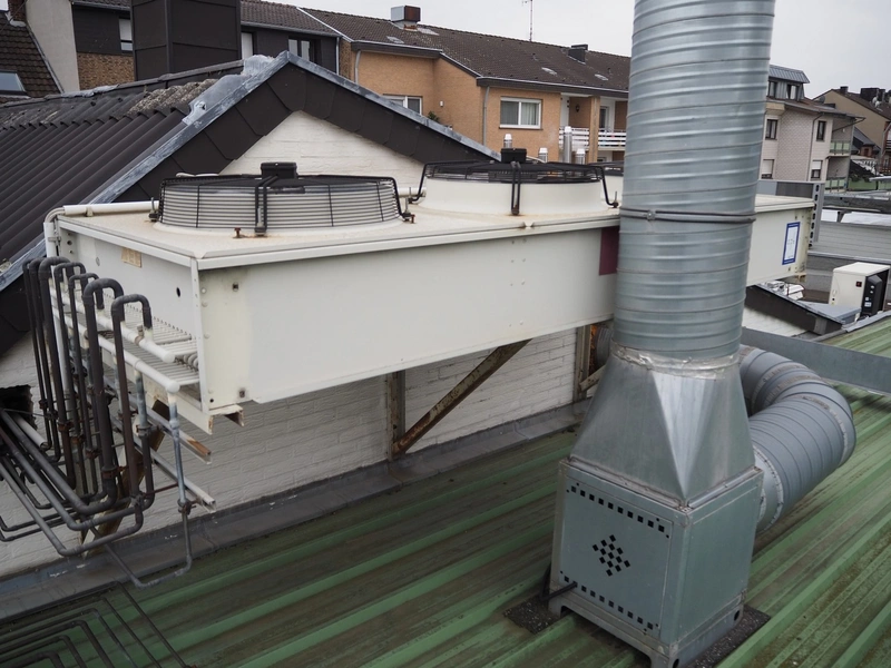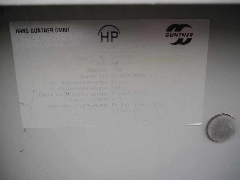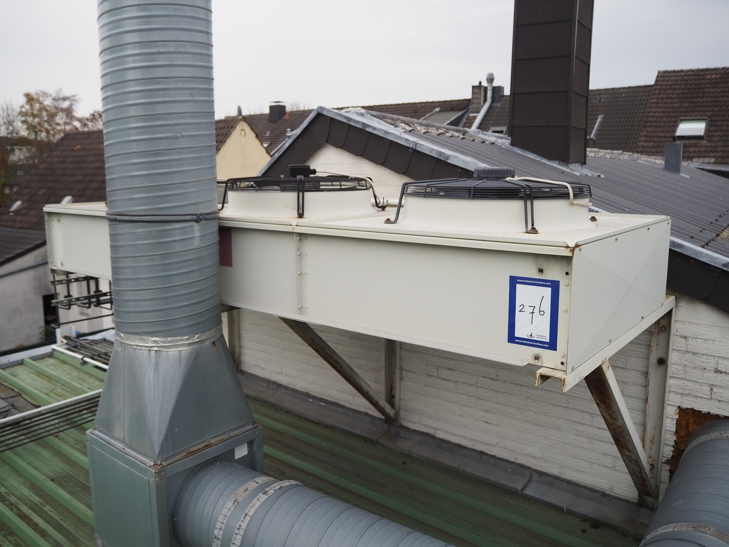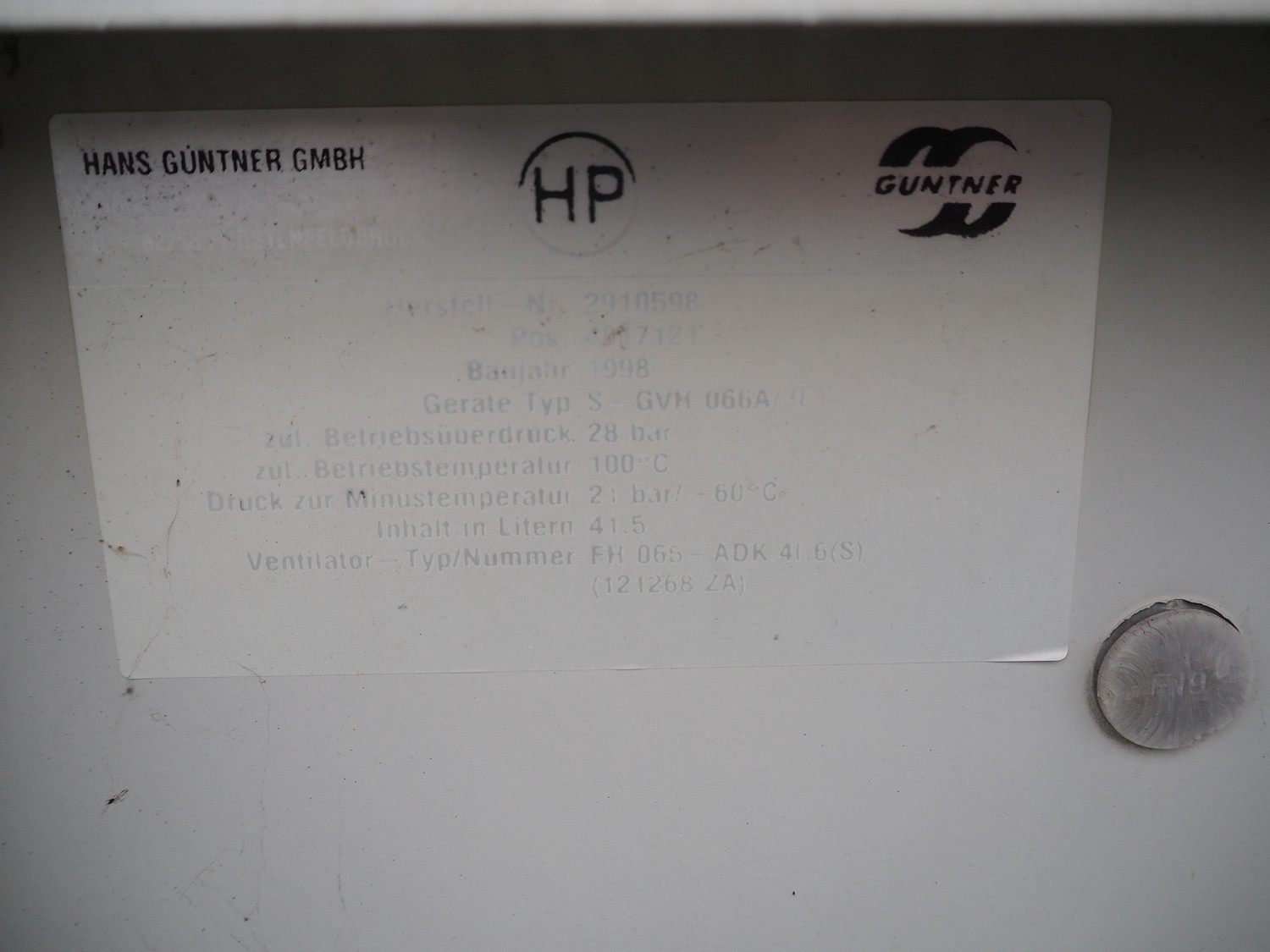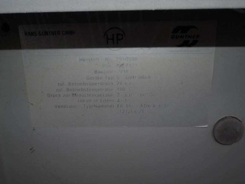 Güntner GmbH & Co. KG roof condenser, unit name: S-GVH 066A/3E, serial number: 2910598, year of construction: 1998, maximum working pressure: 28 bar, maximum working temperature: 100˚, volume: 41.5 liter, 3 fans, dimensions: 3000 mm x 1100 mm x 700 mm.