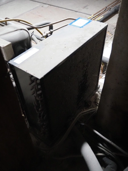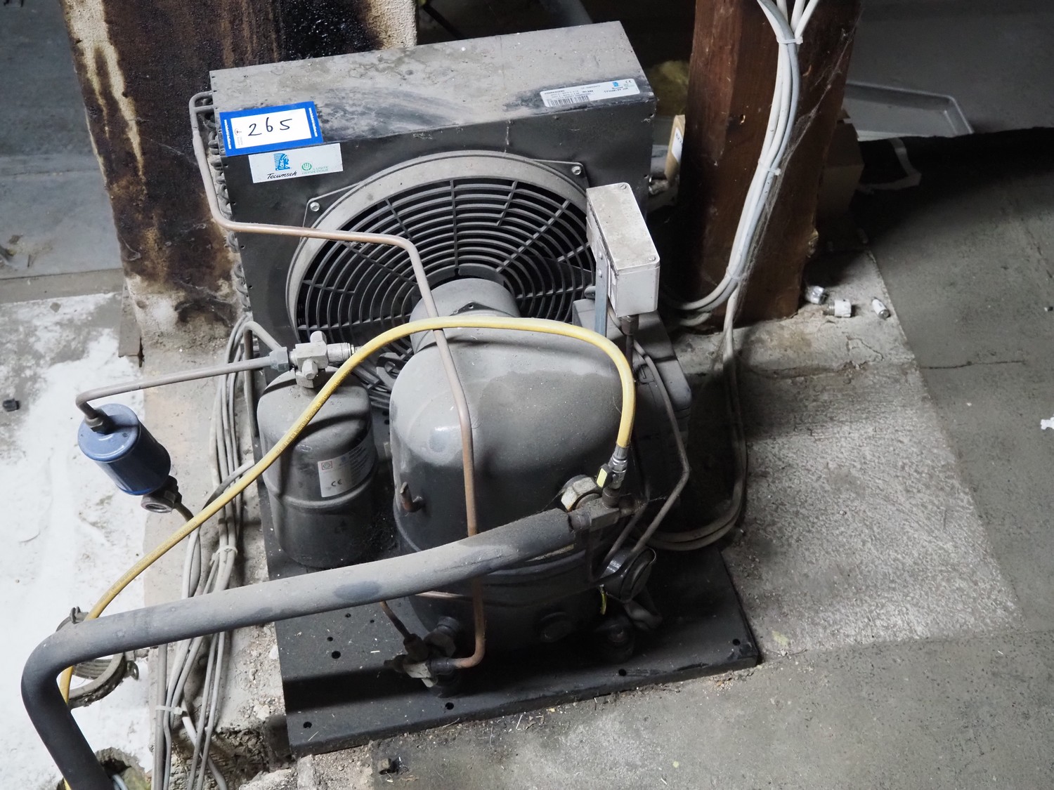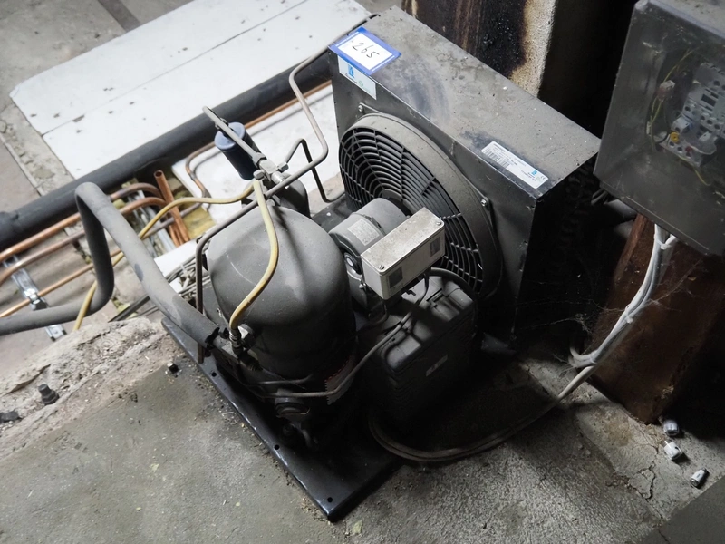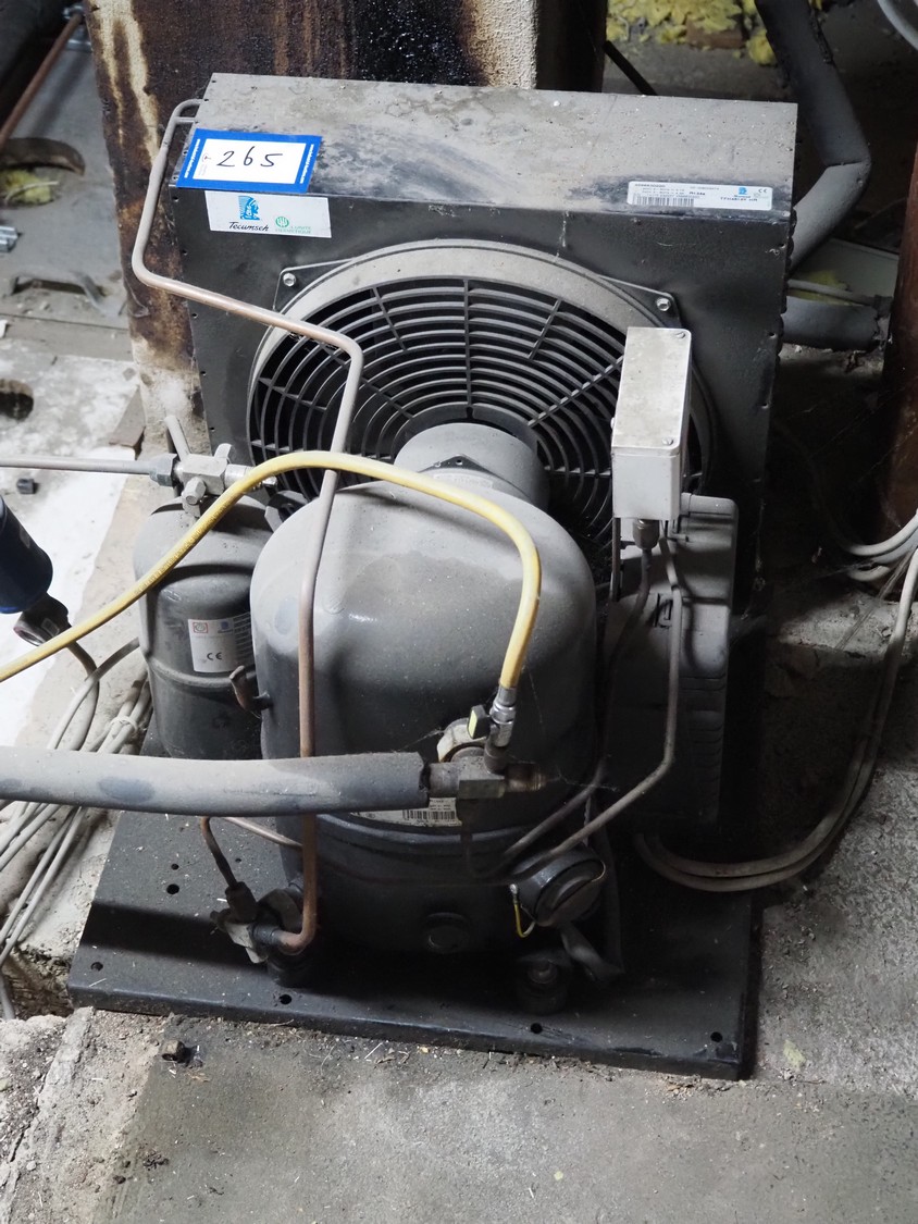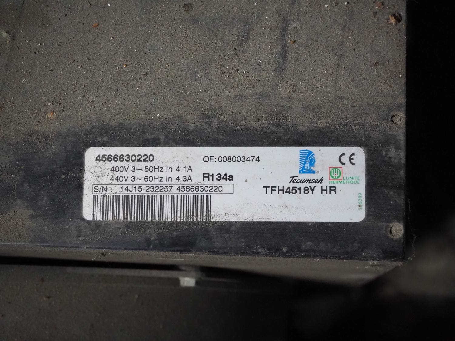 Tecumseh compressor / condensing unit, serial number: 14J15 232257 4566630220, 400 V, 3 Ph, 50 Hz, 4.1 A, dimensions: 500 mm x 600 mm x 500 mm.