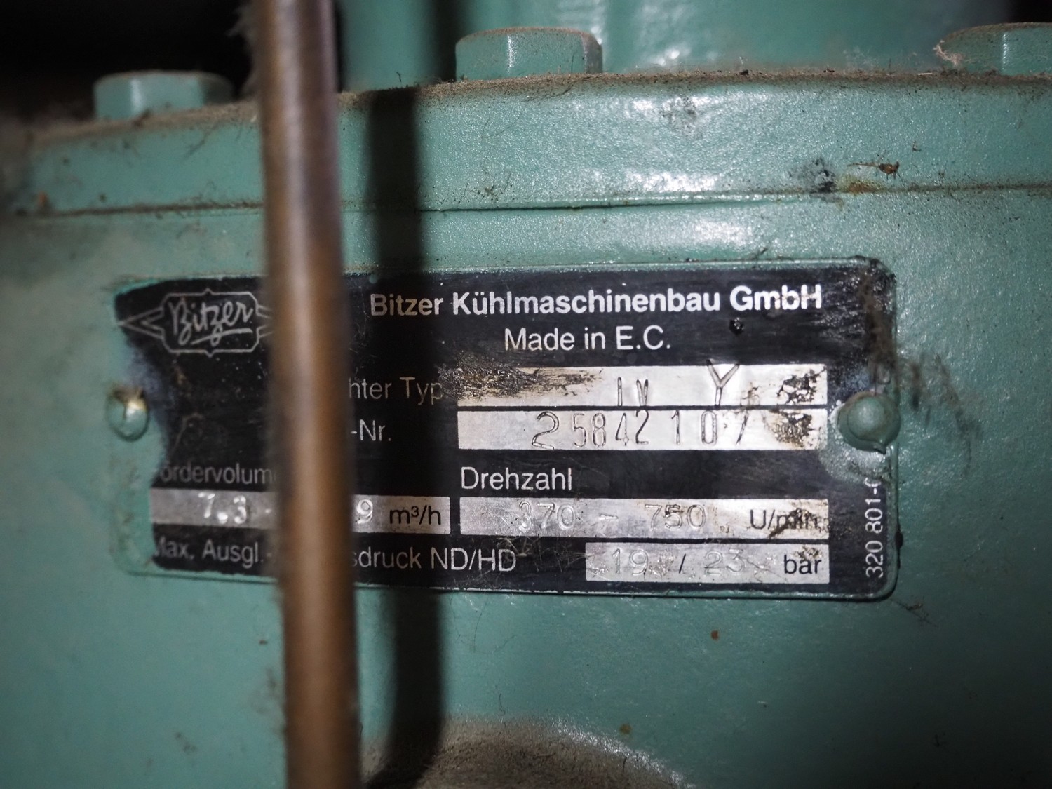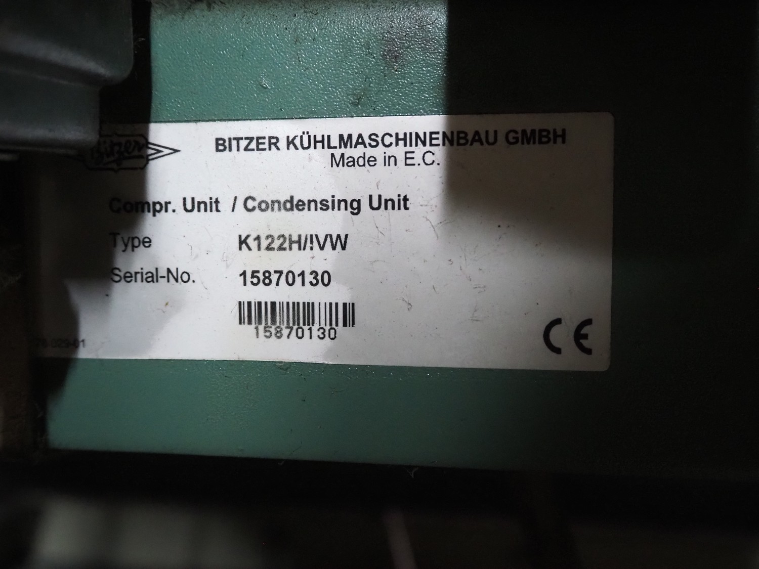 Bitzer Kühlmaschinenbau GmbH compressor / condensing unit, type: K122H/IVW, serial number: 15870130, number: 2584210/, capacity: 14.9 m³/per hour, dimensions: 800 mm x 600 mm x 900 mm.