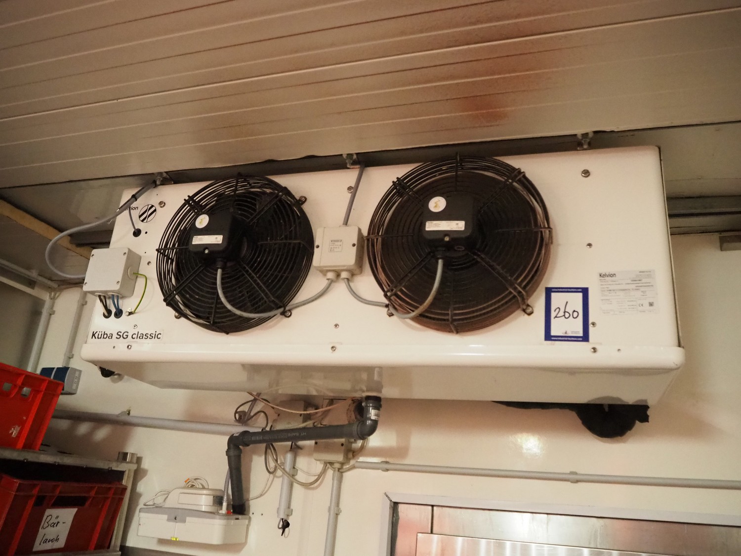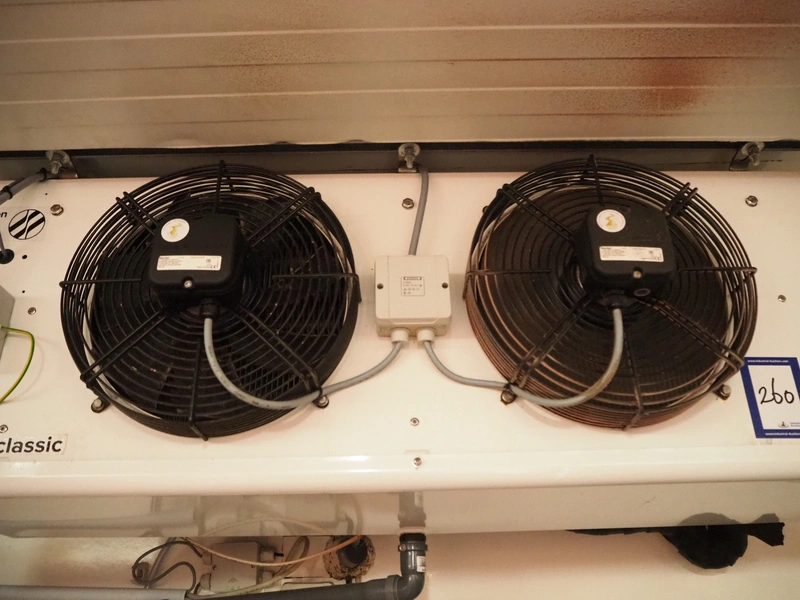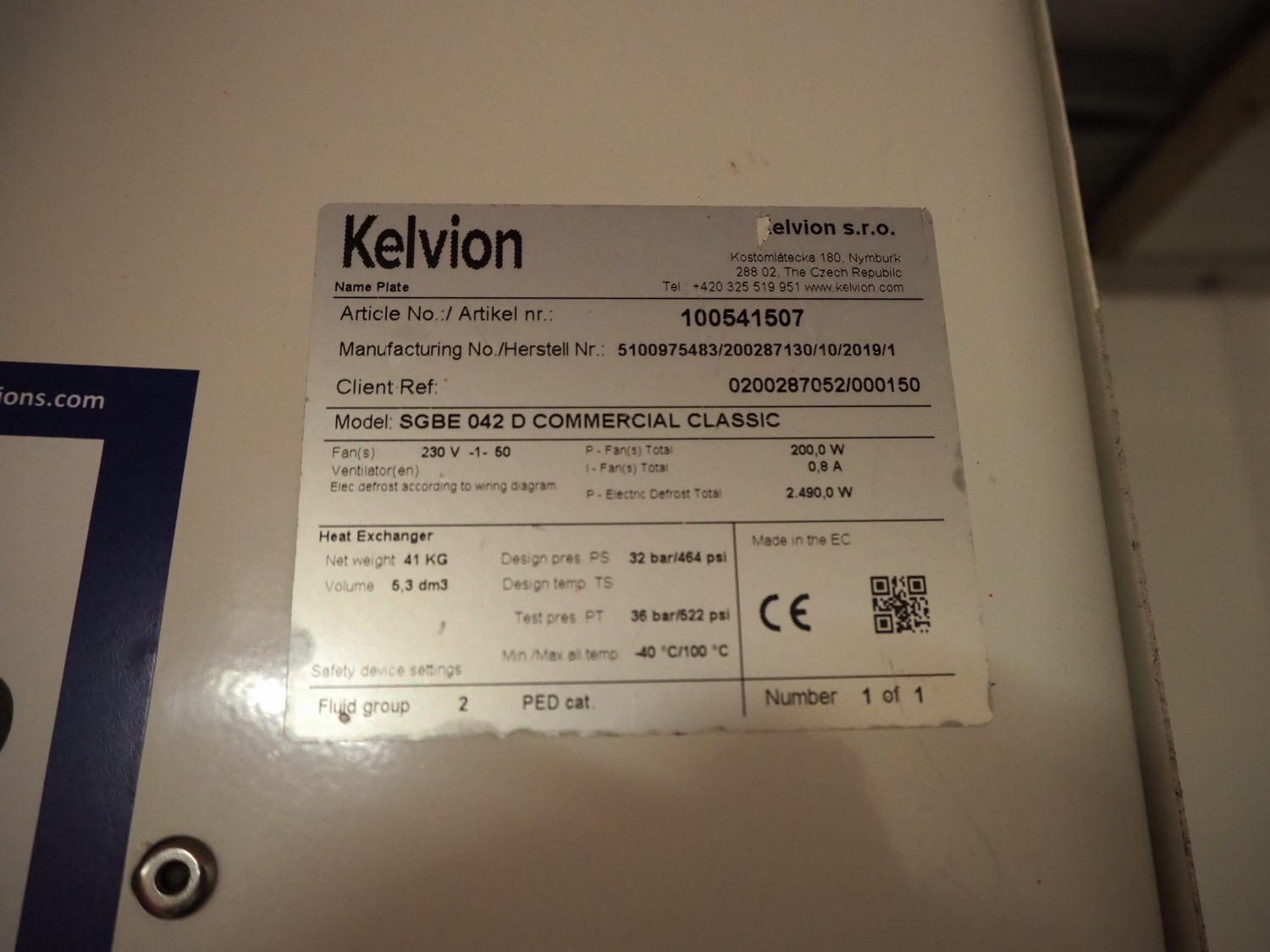 Kelvion evaporator, model: SGBE 042 D COMMERCIAL CLASSIC, manufacturing number: 5100975483/200287130/10/2019, year of construction: 2019, 230 V, 1 Ph, 50 Hz, net weight: 41 kg, volume: 5.3 dm³, design pressure: 32 bar, 2 fans, dimensions: 1200 mm x 400 mm x 450 mm.