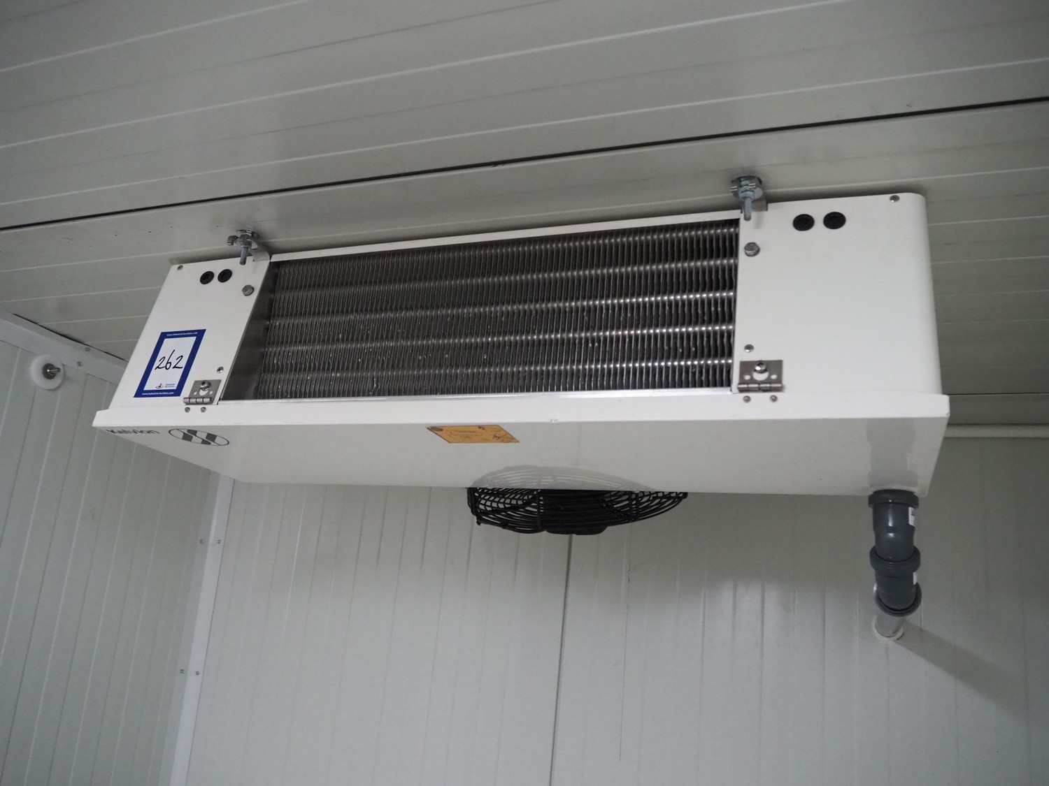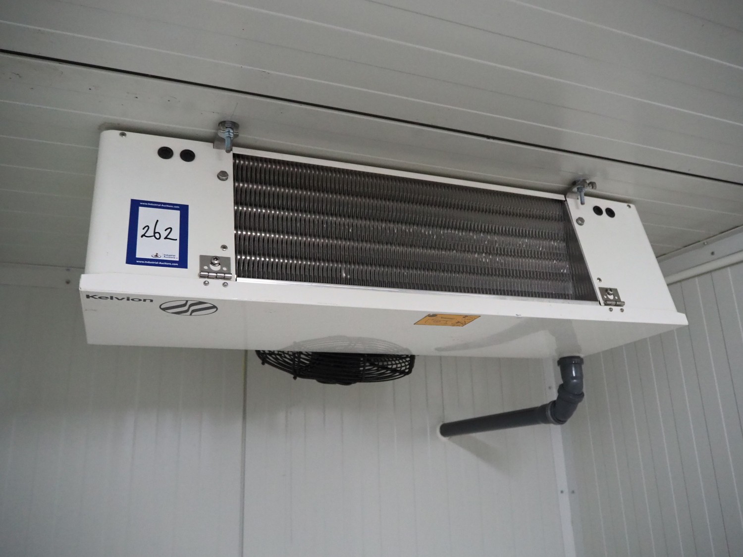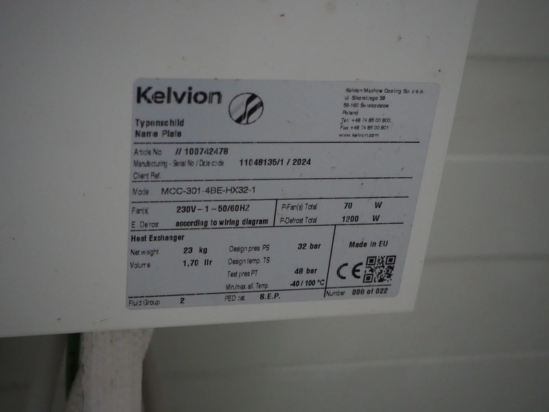Kelvion evaporator, model: MCC-301-4BE-HX32-1, manufacturing number: 11048135/1/2024, year of construction: 2024, 230 V, 1 Ph, 50/60 Hz, net weight: 23 kg, volume: 1.70 liter, design pressure: 32 bar, 1 fan, dimensions: 900 mm x 600 mm x 300 mm.