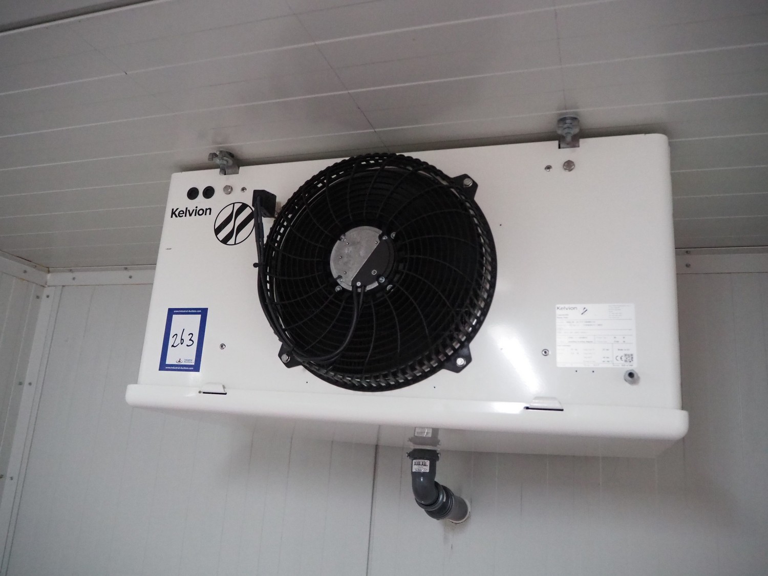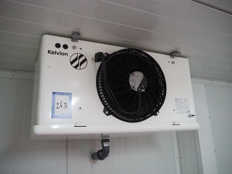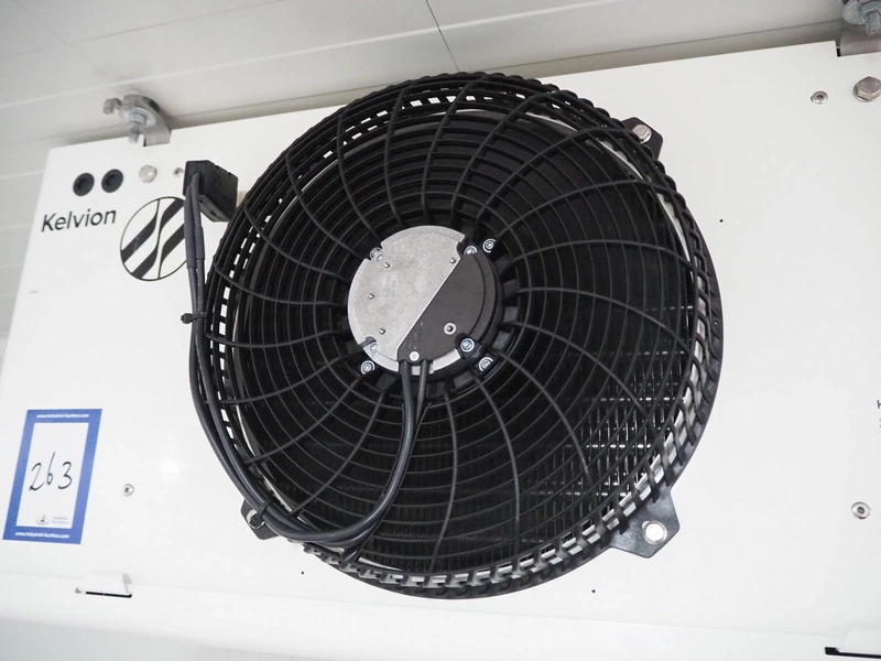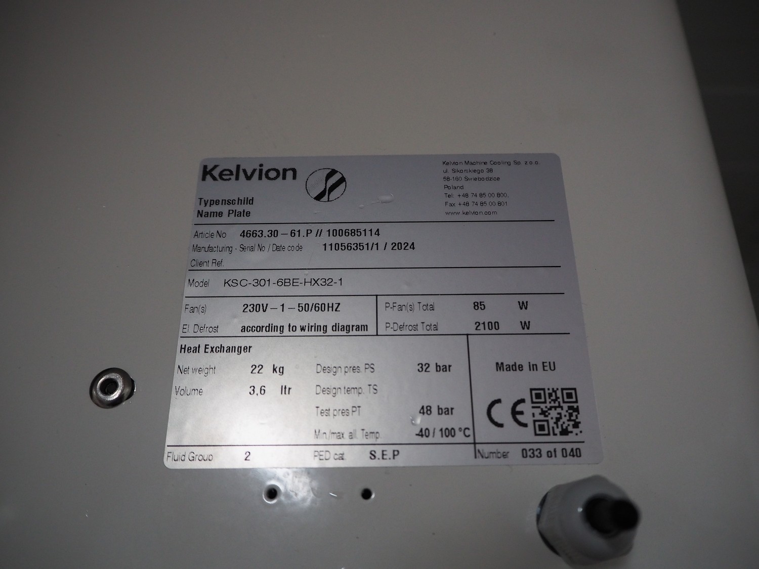 Kelvion evaporator, model: KSC-301-6BE-HX32-1, manufacturing number: 11056351/1/2024, year of construction: 2024, 230 V, 1 Ph, 50/60 Hz, net weight: 22 kg, volume: 3.6 liter, design pressure: 32 bar, 1 fan, dimensions: 800 mm x 500 mm x 400 mm.