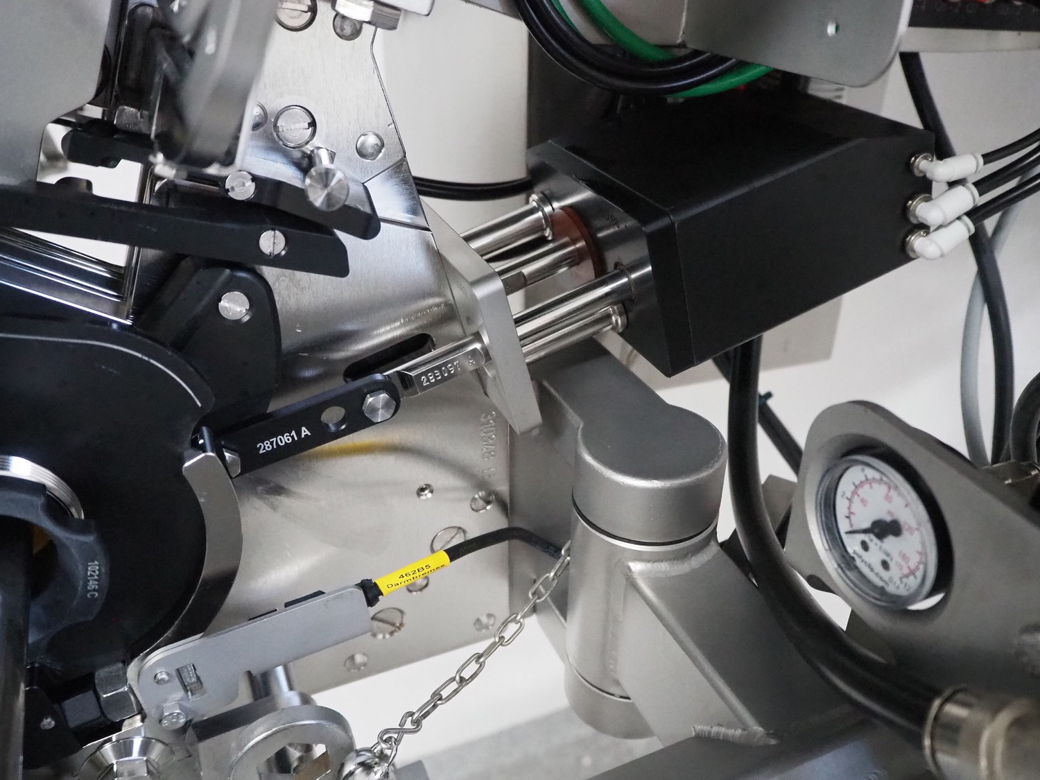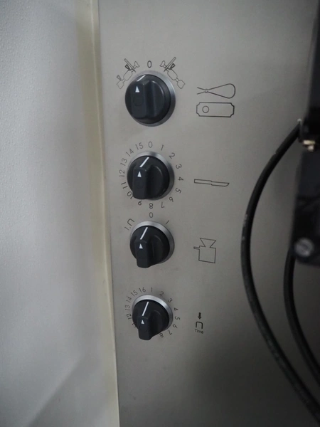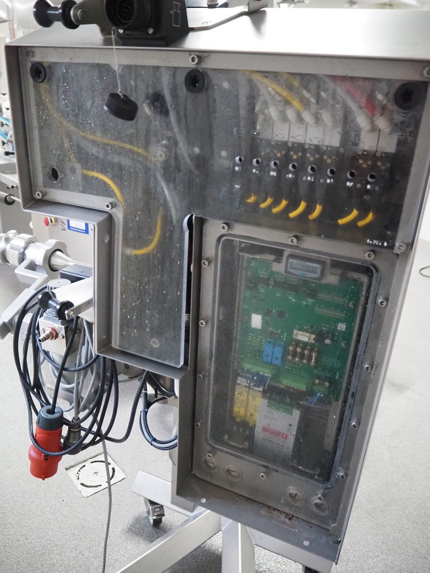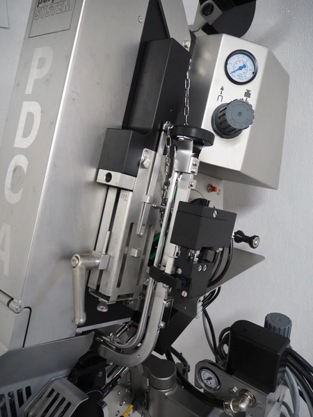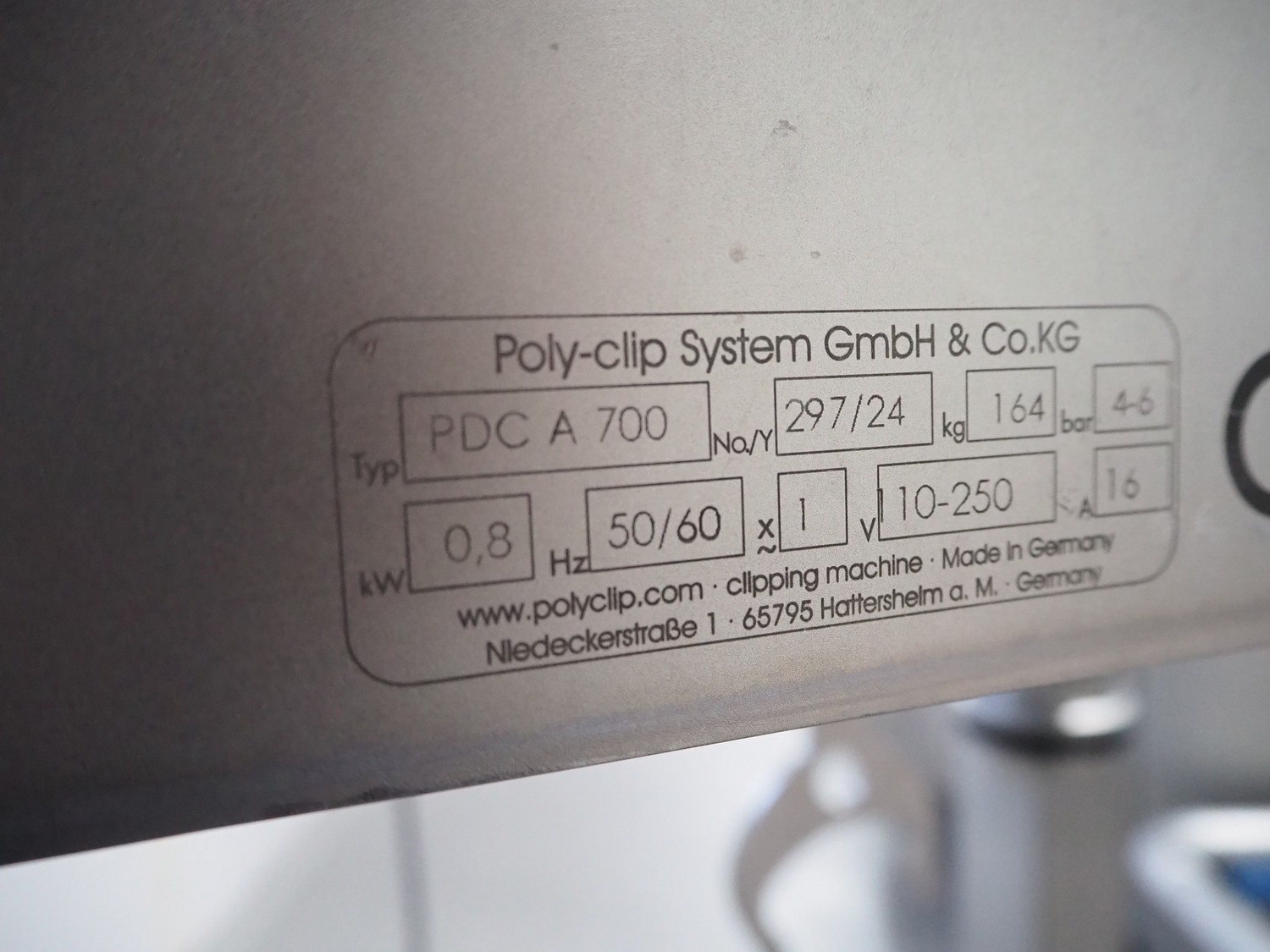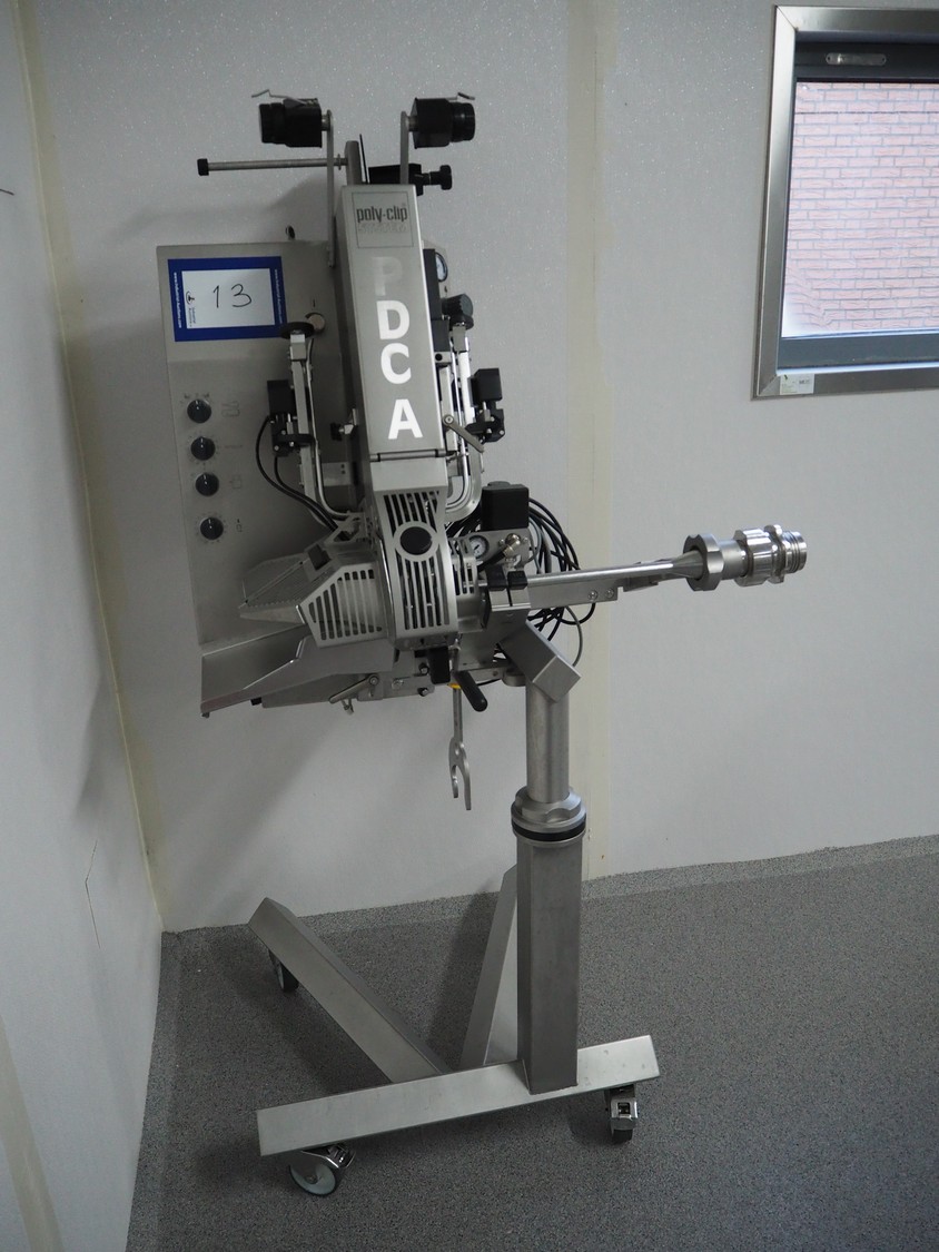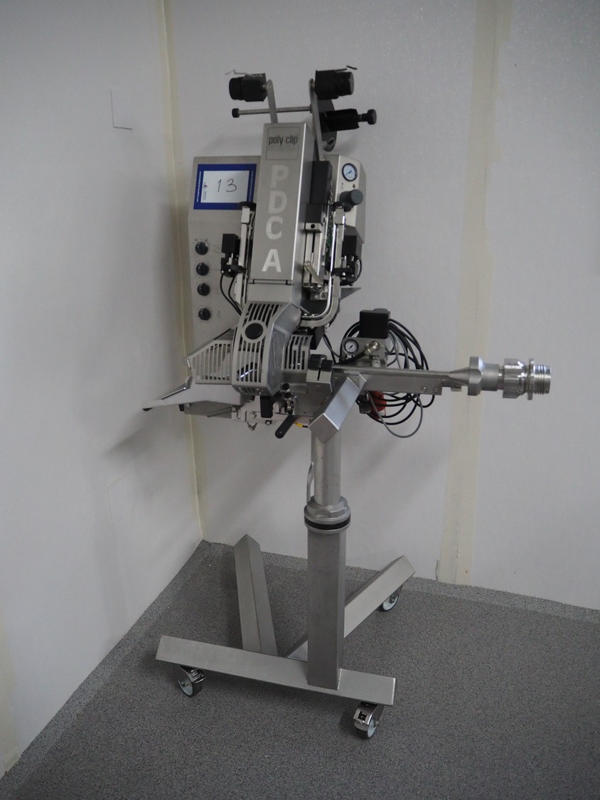 Poly-Clip System GmbH & Co. KG. mobile automatic double clipper, type: PDC A 700, number: 297, year of construction: 2024, 110-250 V, 50/60 Hz, 16 A, 0.8 kW, air pressure: 4 - 6 bar, weight: 164 kg, total dimensions: 1200 mm x 900 mm x 1900 mm.