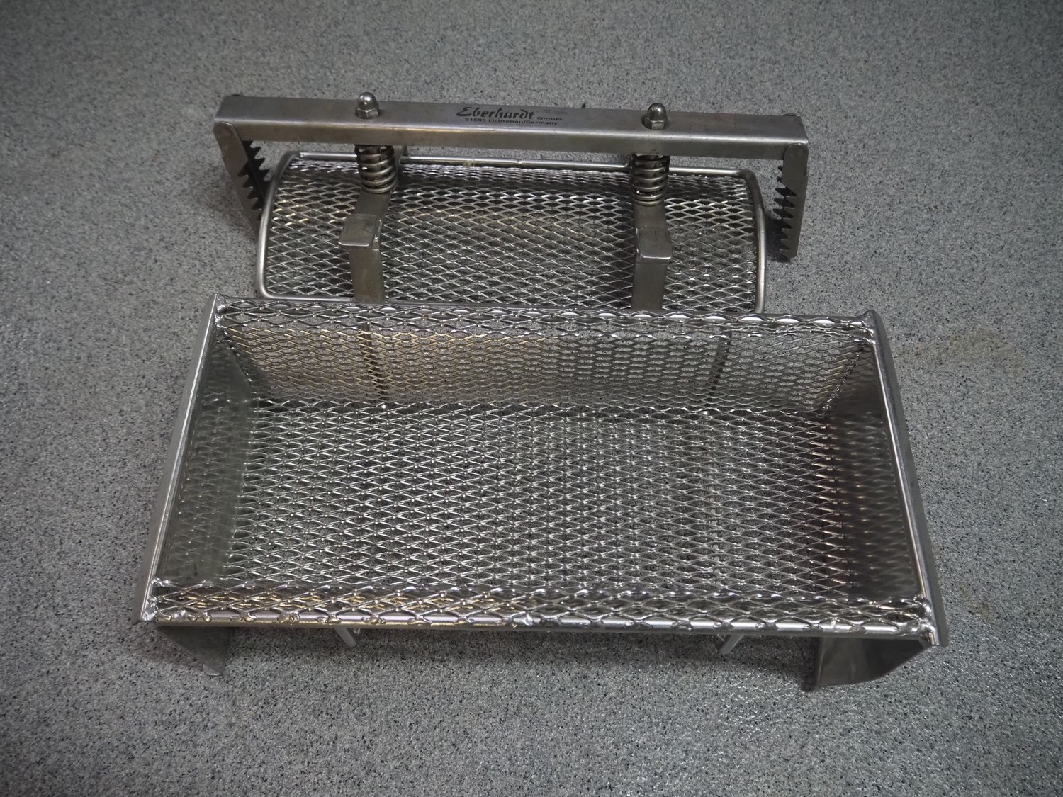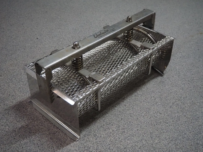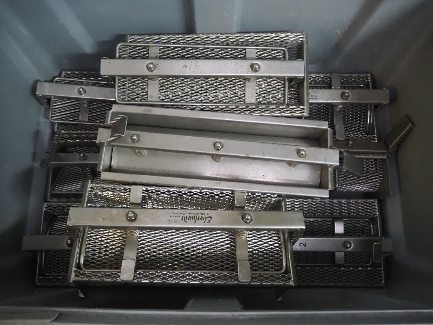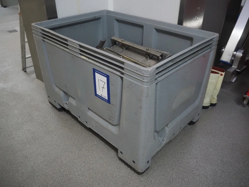 Plastic pallet box with 9 Eberhardt s/s ham moulds, each ham mould: (9x) 530 mm x 220 mm x 180 mm, total dimensions: 1200 mm x 800 mm x 800 mm.