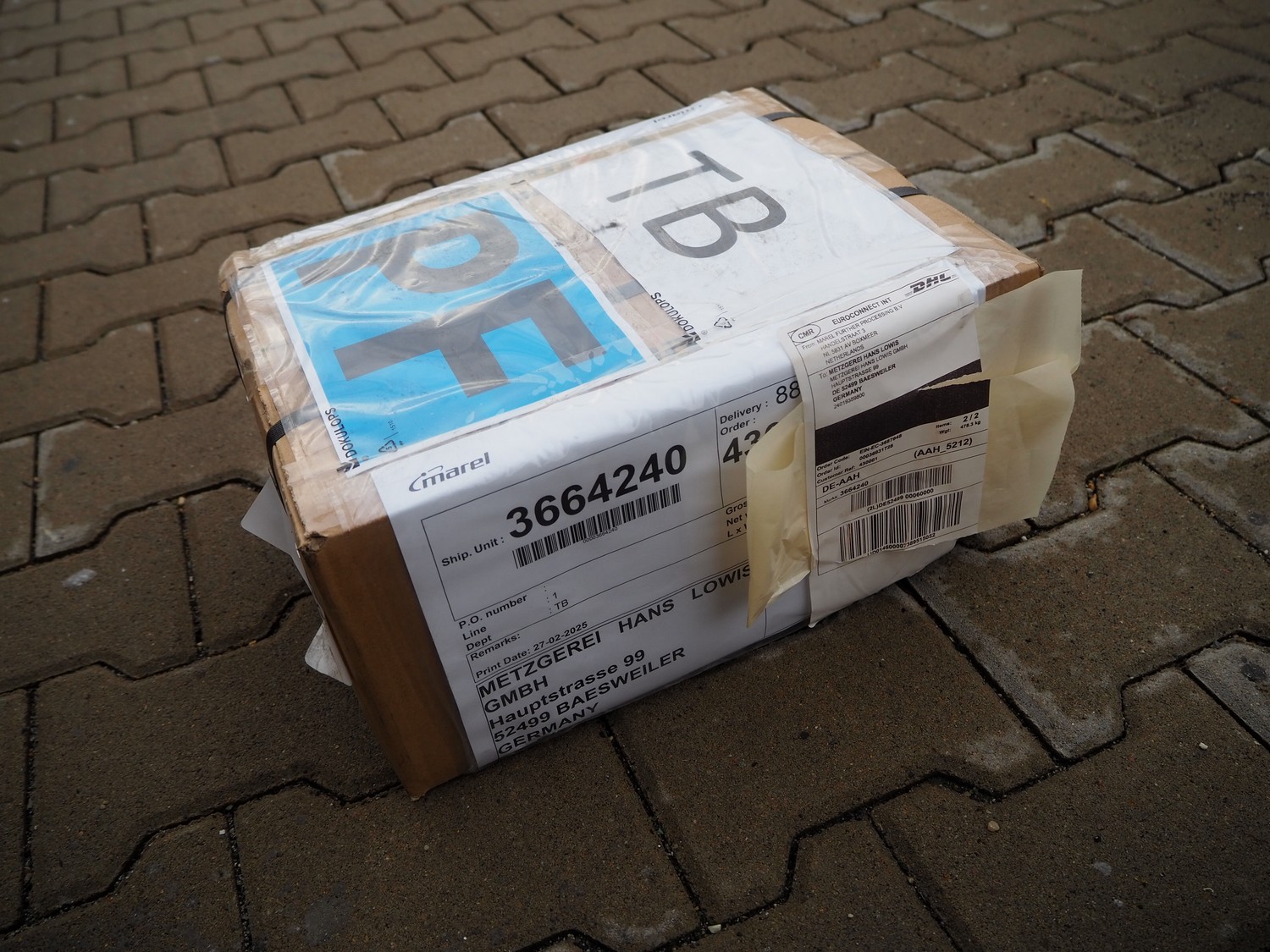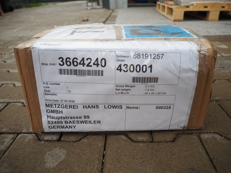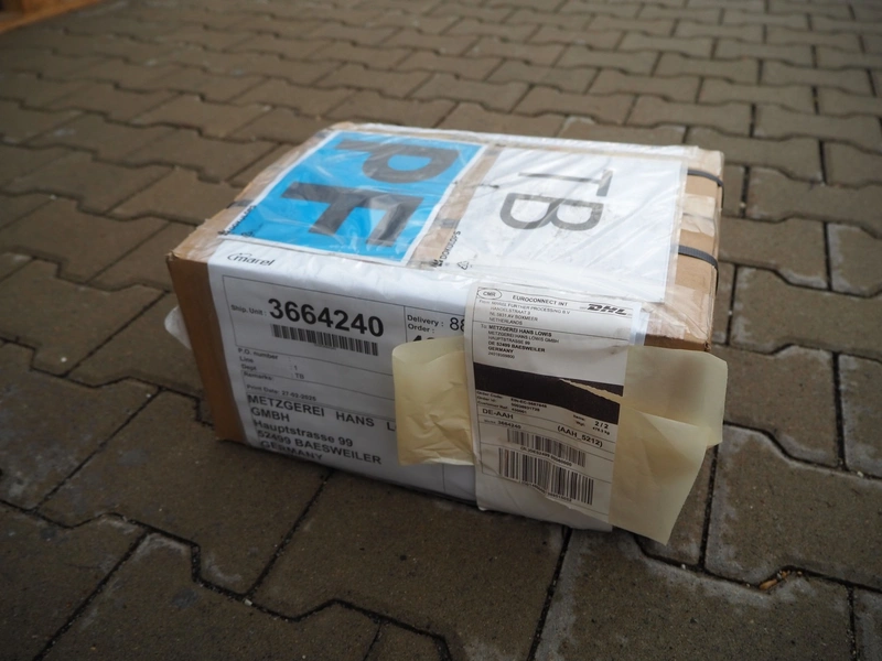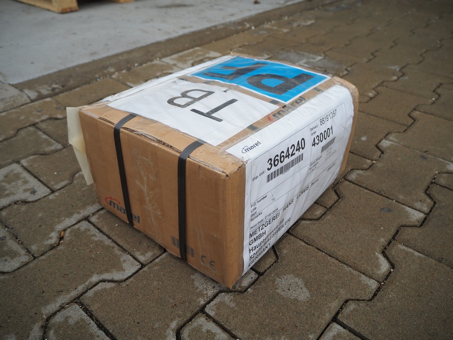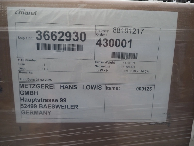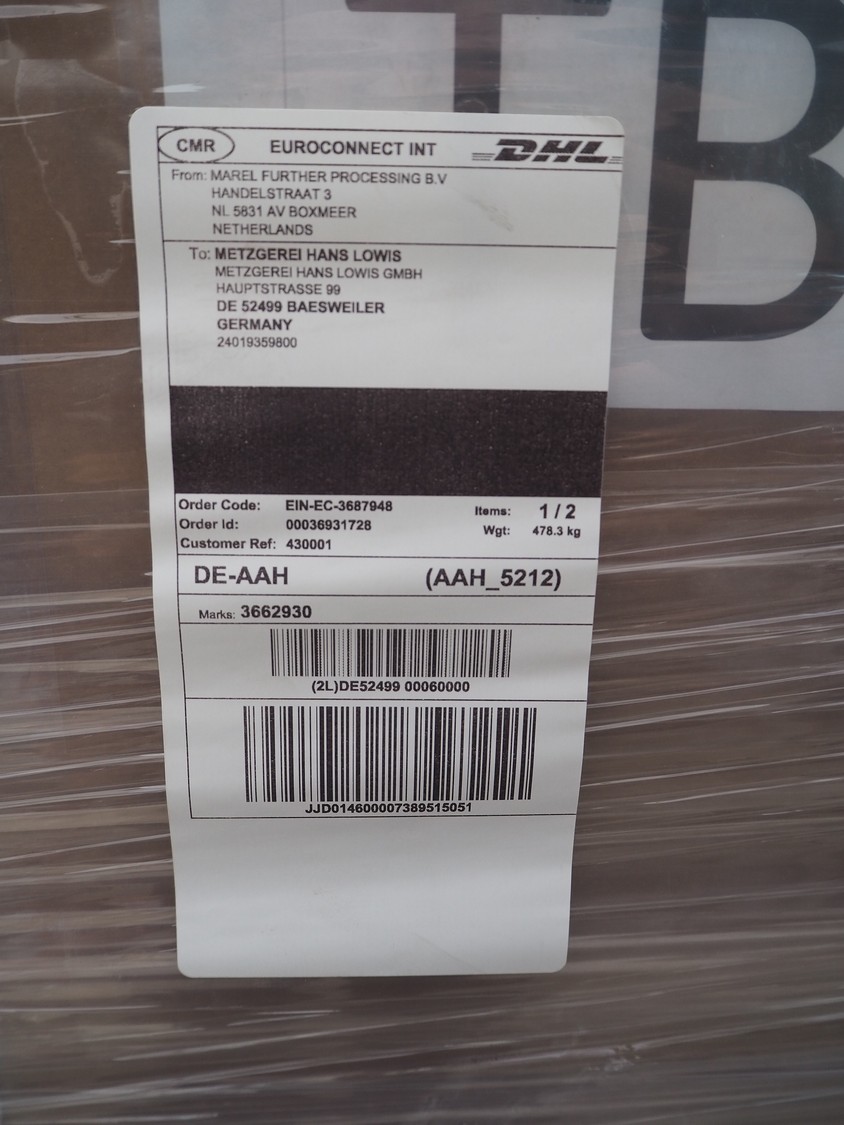 Marel sausage peeler, model: 2800, for caliber 26 - 28 mm, dimensions box: 2000 mm x 900 mm x 1680 mm. New, never used.