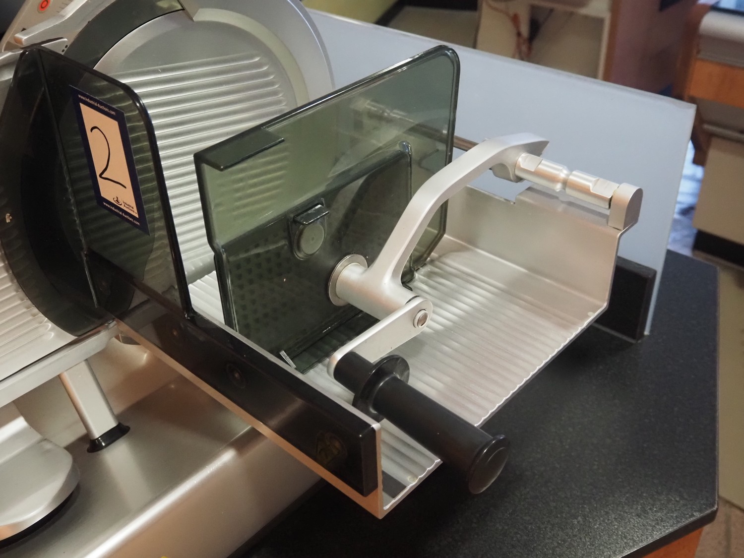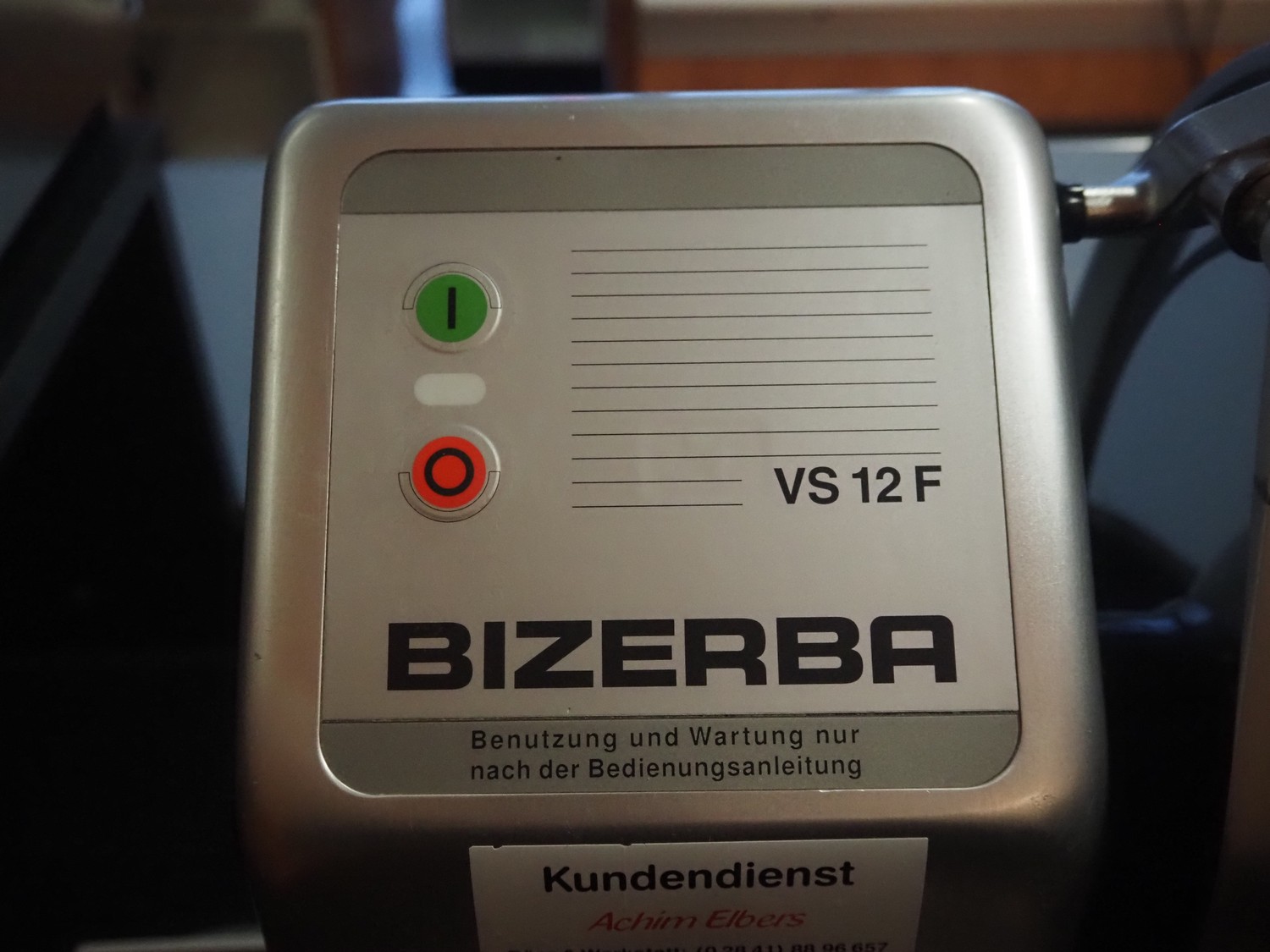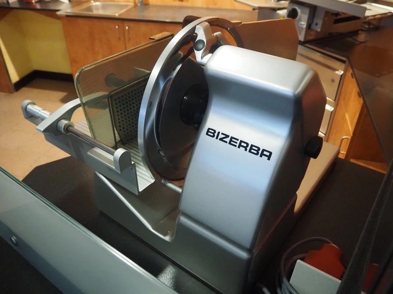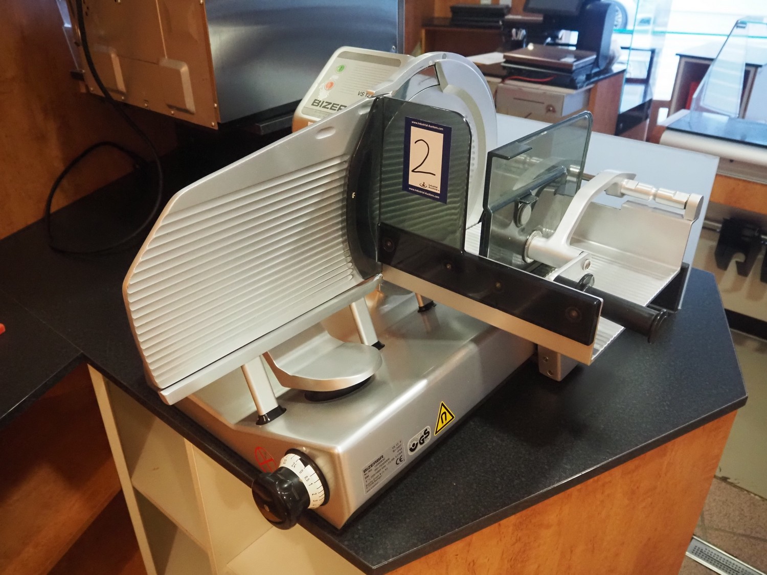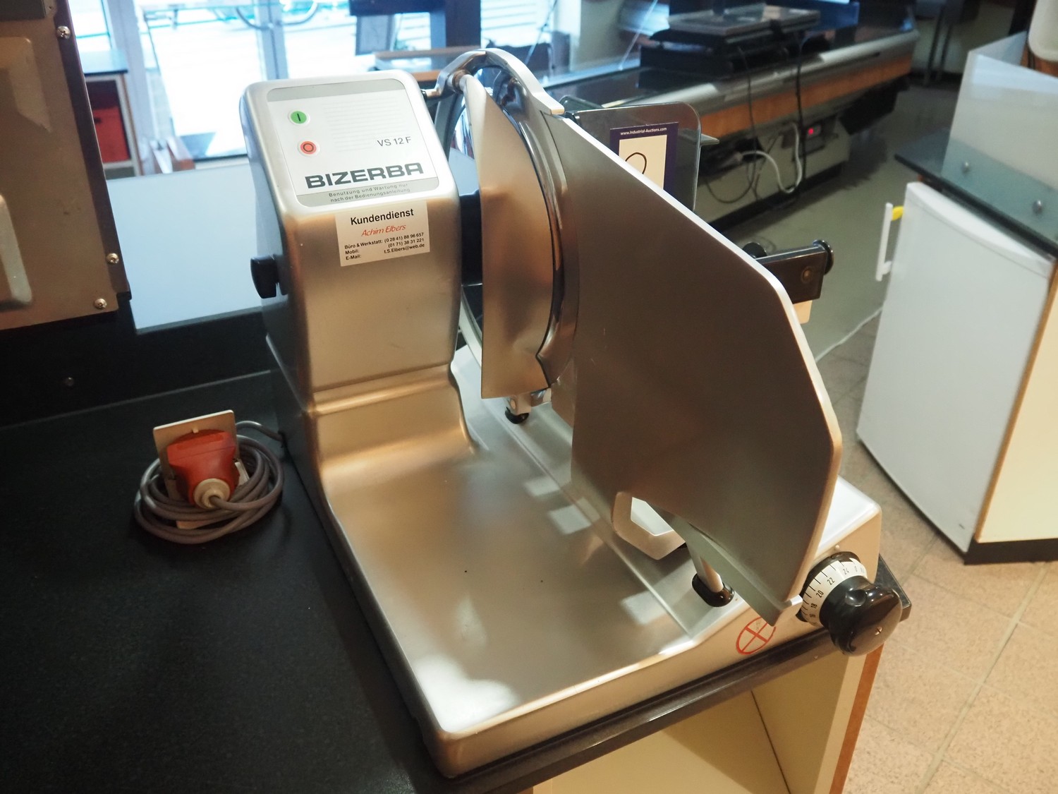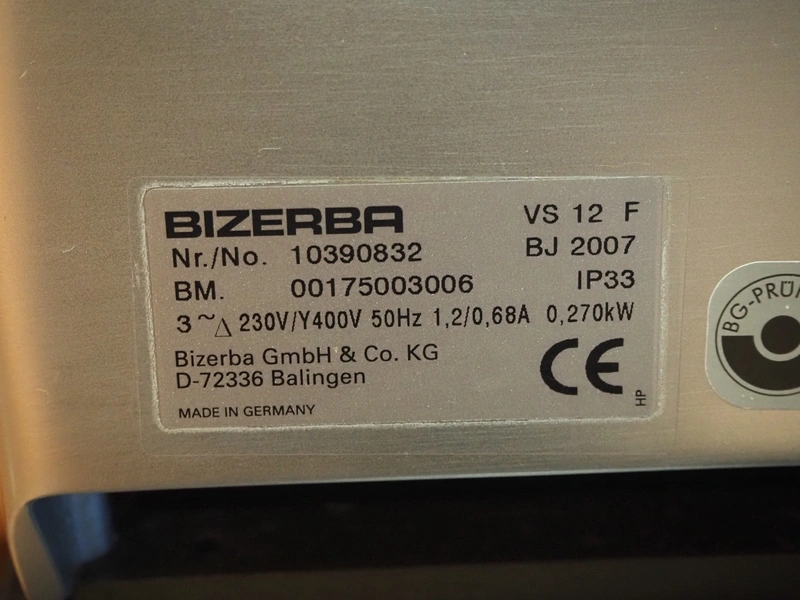 Bizerba slicer, type: VS 12 F, serial number: 10390832, year of construction: 2007, 230/400 V, 3 Ph, 50 Hz, 1.2/0.68 A, 0.270 kW, diameter knife: 350 mm, total dimensions: 670 mm x 740 mm x 470 mm.
