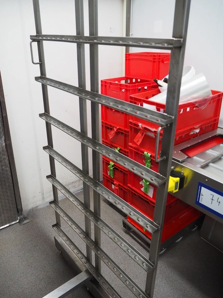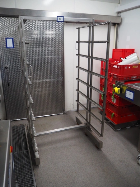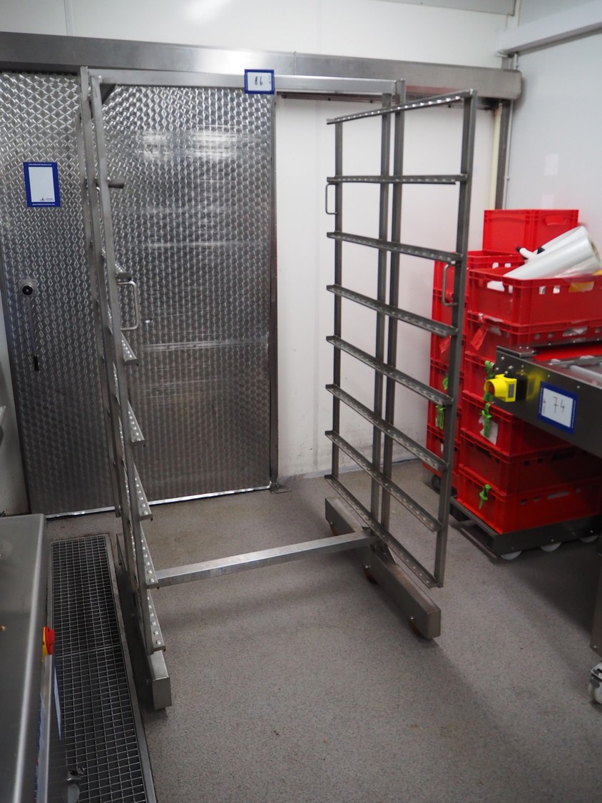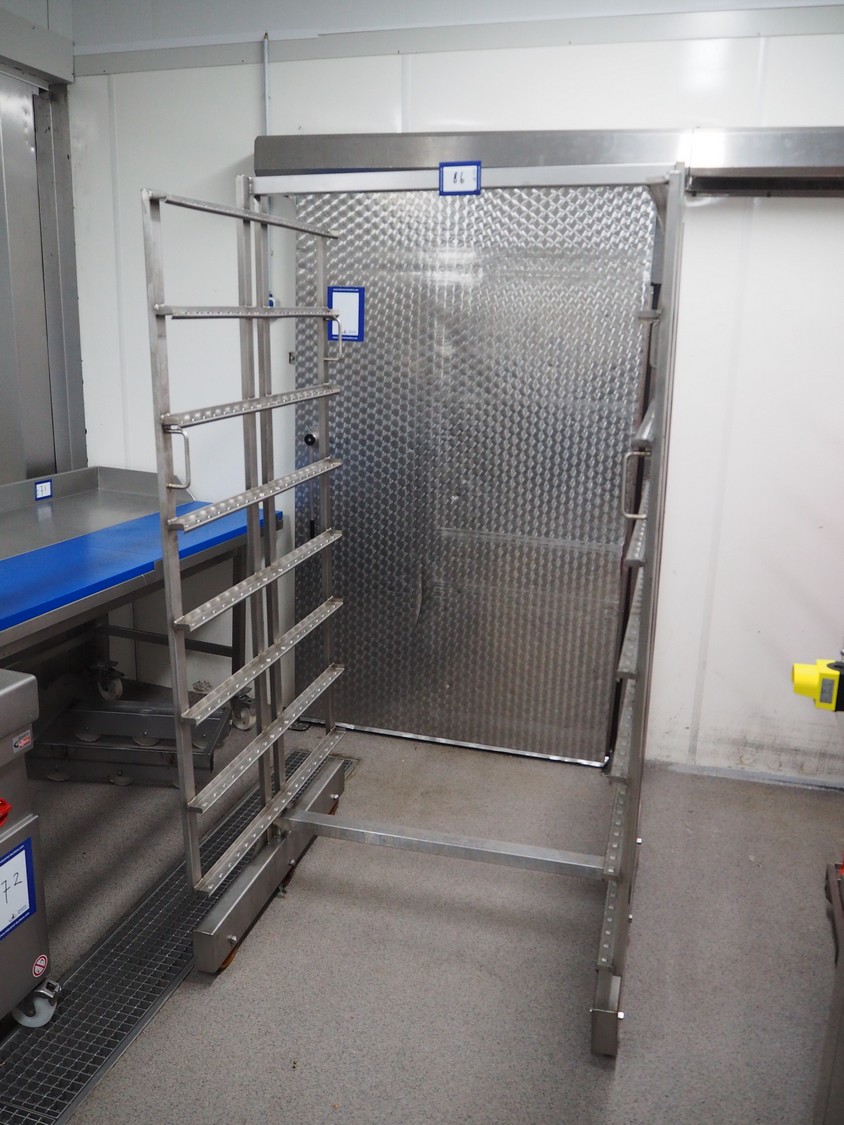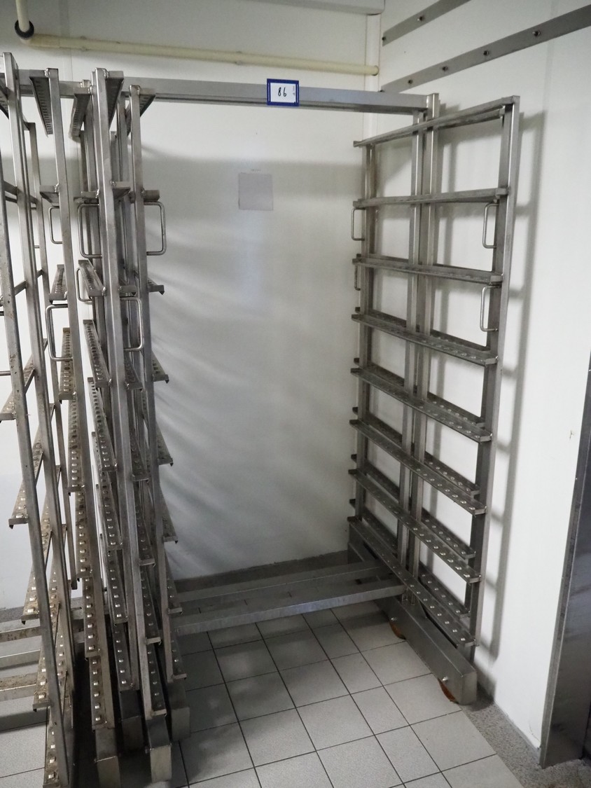 2 s/s smoke trolleys, 8 floors, dimensions floors: (8x) 930 mm x 980 mm, total dimensions: (2x) 1050 mm x 990 mm x 1980 mm.